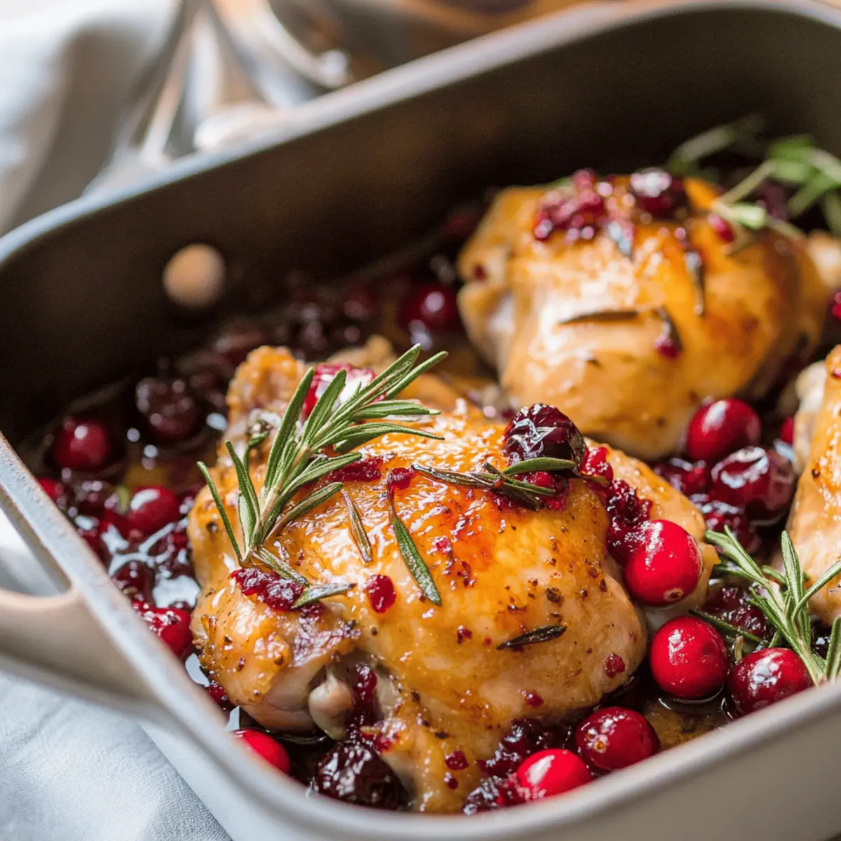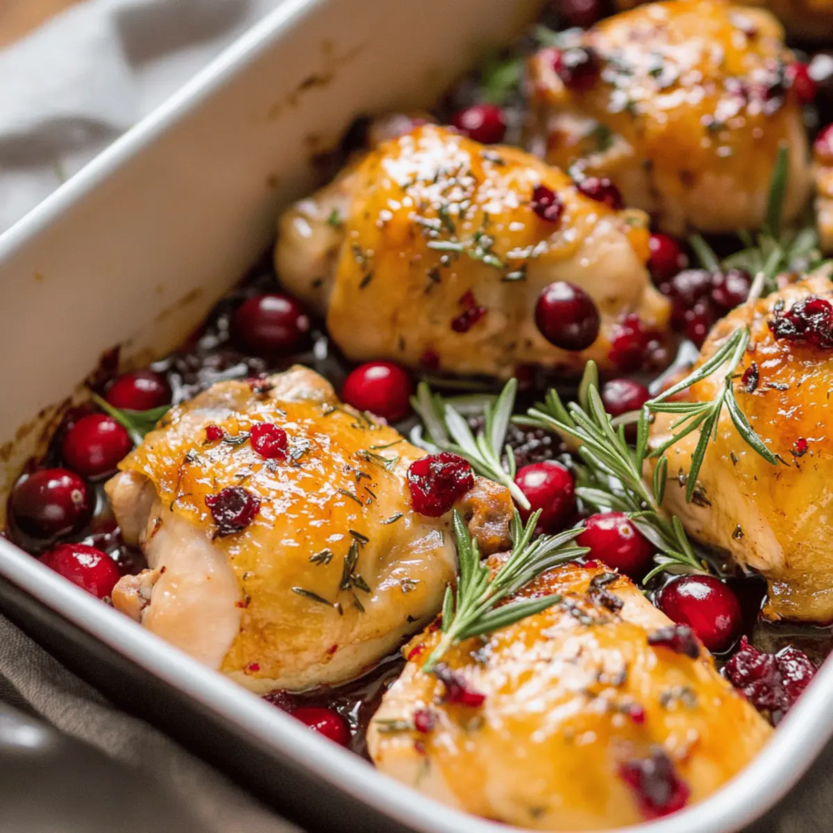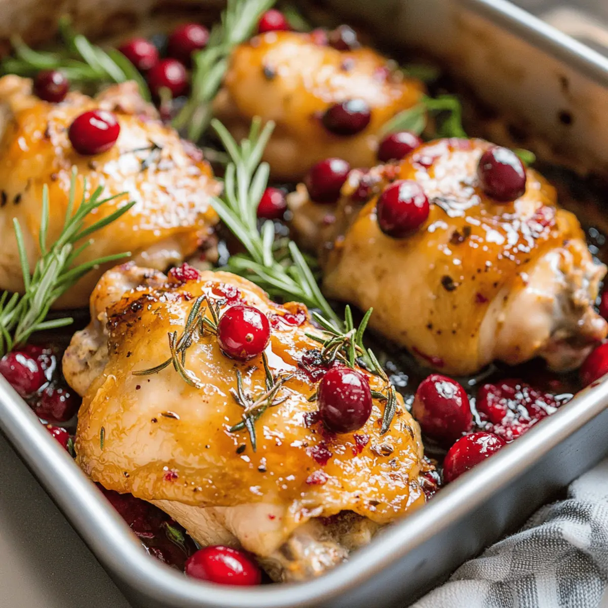 As I sliced into the juicy chicken, the warm aroma of rosemary mingled with the tangy scent of cranberries, instantly transporting me to cozy winter evenings. This One-Pan Cranberry Rosemary Chicken is not just a feast for the senses; it’s a harmonious blend of flavors that make any meal feel festive without the fuss. Imagine tender, marinated chicken thighs kissed with sweetness from maple syrup and a touch of depth from white wine, all coming together in one glorious dish. It’s the perfect solution for busy weeknights or those special gatherings where you want to impress without spending hours in the kitchen. Plus, it’s easily adaptable for paleo, Whole30, and keto lifestyles, making it a win for everyone around the table. Ready to curl up with something comforting yet impressive? Let’s get cooking! Why is One-Pan Chicken So Appealing? Simplicity: This recipe requires minimal ingredients and just one pan, making cleanup a breeze. Flavor Explosion: The combination of fresh cranberries and rosemary creates a burst of flavor that will delight your taste buds. Versatile: Perfect for any occasion, from quick family dinners to festive holiday gatherings, and it accommodates various dietary preferences with ease. Time-Saving: Quick marination and straightforward baking mean you can whip up a stunning meal in no time—ideal for busy weeknights! Crowd-Pleaser: Everyone loves tender, juicy chicken! Pair it with roasted vegetables or a fresh green salad for a complete meal, making it a hit with family and friends. Check out Cheesy Chicken Enchiladas or Caribbean Chicken Rice for more delicious, crowd-friendly options! One-Pan Cranberry Rosemary Chicken Ingredients For the Marinade • Fresh Cranberries – Adds tartness and vibrant color; substitute dried cranberries for a sweeter flavor variation. • Olive Oil (or Avocado Oil) – Provides healthy fats and helps the marinade adhere to the chicken. • Coconut Aminos (or Soy Sauce) – Offers umami flavor and a touch of saltiness, perfect for enhancing the dish. • Maple Syrup – Adds sweetness and enhances browning; use sugar-free syrup for a keto-friendly option. • Garlic – Imparts depth of flavor; feel free to use minced if cloves aren’t available. • Fresh Rosemary – Contributes aromatic herbal notes; dried rosemary can work in a pinch, but fresh is preferred. • Dry White Wine (or Chicken Broth) – Enhances richness; use broth for a non-alcoholic alternative. For the Chicken • Bone-in, Skin-on Chicken Thighs – Juicy and flavorful; they can be replaced with boneless thighs for quicker cooking. This One-Pan Cranberry Rosemary Chicken recipe seamlessly combines taste and simplicity, making it a delightful addition to your culinary repertoire! Step‑by‑Step Instructions for One-Pan Cranberry Rosemary Chicken Step 1: Prepare Marinade In a food processor, combine ⅓ cup of fresh cranberries, 2 tablespoons of olive oil, 2 tablespoons of coconut aminos, 2 tablespoons of maple syrup, 3 minced garlic cloves, and 1 teaspoon of fresh rosemary. Blend until the mixture is smooth and well-combined, creating a vibrant marinade that captures the essence of the season. Step 2: Marinate Chicken Place 6 bone-in, skin-on chicken thighs in a spacious baking dish. Pour the cranberry marinade generously over the chicken, ensuring all pieces are coated. Cover the dish and refrigerate for 30 minutes, or ideally up to 24 hours, allowing the chicken to absorb those enticing flavors for your One-Pan Cranberry Rosemary Chicken. Step 3: Preheat Oven Set your oven to 375°F (190°C) to preheat while the chicken marinates. After 30 minutes, let the chicken sit at room temperature for an additional 30 minutes, which will help it cook evenly. This step is crucial for achieving juicy, tender chicken. Step 4: Bake Chicken Remove the chicken from the marinade, shaking off any excess liquid. Brush the tops of the thighs with olive oil and season lightly with salt. Scatter leftover fresh cranberries and rosemary over the chicken for added flavor and color. Place the baking dish in the oven, roasting the chicken uncovered for 20 to 30 minutes, until the internal temperature reaches 160°F (71°C) and the skin is golden brown. Step 5: Broil for Crispiness Once the chicken is cooked through, remove it from the oven and brush the skin with 1 tablespoon of maple syrup to enhance the sweetness. Switch your oven to broil and return the chicken to cook for an additional 3 to 10 minutes, monitoring closely until the skin is beautifully crispy and caramelized. Step 6: Serve After broiling, let the chicken rest for about 5 minutes to allow the juices to redistribute. Serve your One-Pan Cranberry Rosemary Chicken warm, spooning extra marinade over the top for added flavor. Garnish with a few whole sprigs of rosemary for an elegant presentation that will impress your family and guests. Make Ahead Options These One-Pan Cranberry Rosemary Chicken thighs are a fantastic option for meal prep, saving you precious time on busy evenings! You can marinate the chicken in the flavorful cranberry mixture up to 24 hours in advance, ensuring the meat absorbs all those delightful flavors. Just cover the baking dish and refrigerate it until you’re ready to cook. Additionally, you can also prepare the marinade itself and store it in the fridge for up to 3 days. When it’s time to bake, simply remove the chicken from the marinade, bake it as instructed, and finish with the broil for that irresistible crispy skin. It’s that simple to enjoy a deliciously impressive meal without the last-minute rush! What to Serve with One-Pan Cranberry Rosemary Chicken Elevate your dining experience with delightful side dishes that complement the succulent, tangy flavors of this lovely chicken creation. Creamy Mashed Potatoes: The rich, buttery texture contrasts beautifully with the tangy chicken, offering a comforting, indulgent pairing. Garlic Roasted Green Beans: Crunchy and vibrant, these 