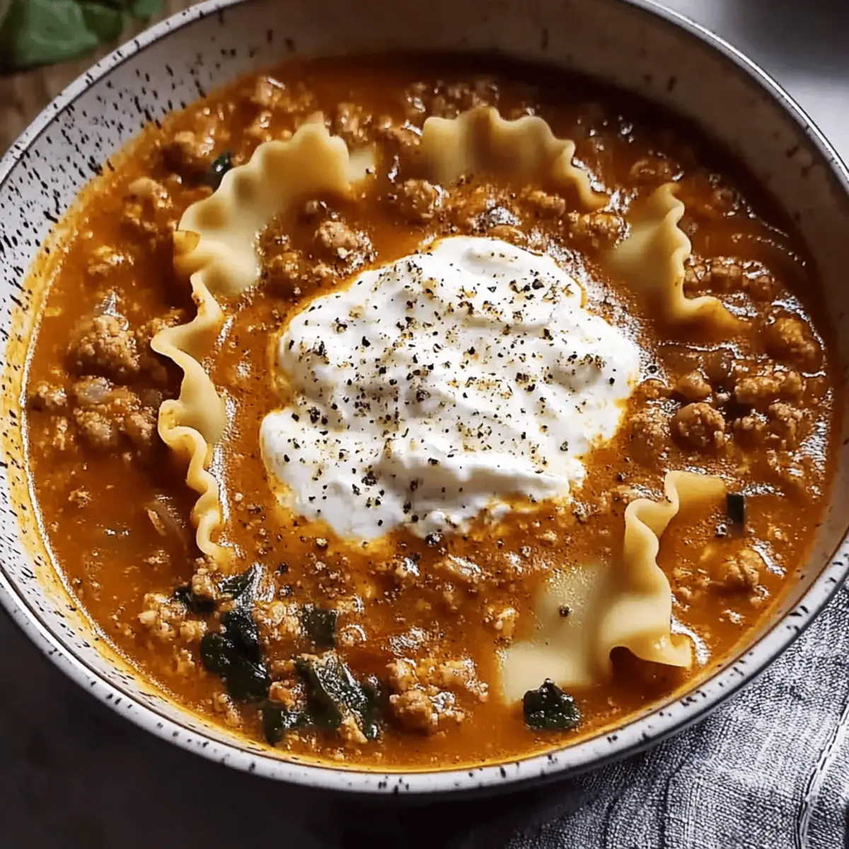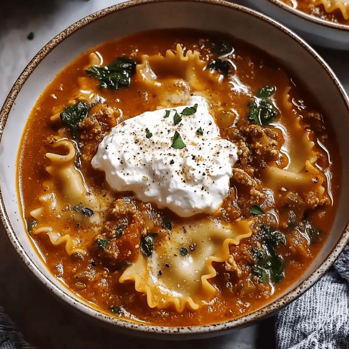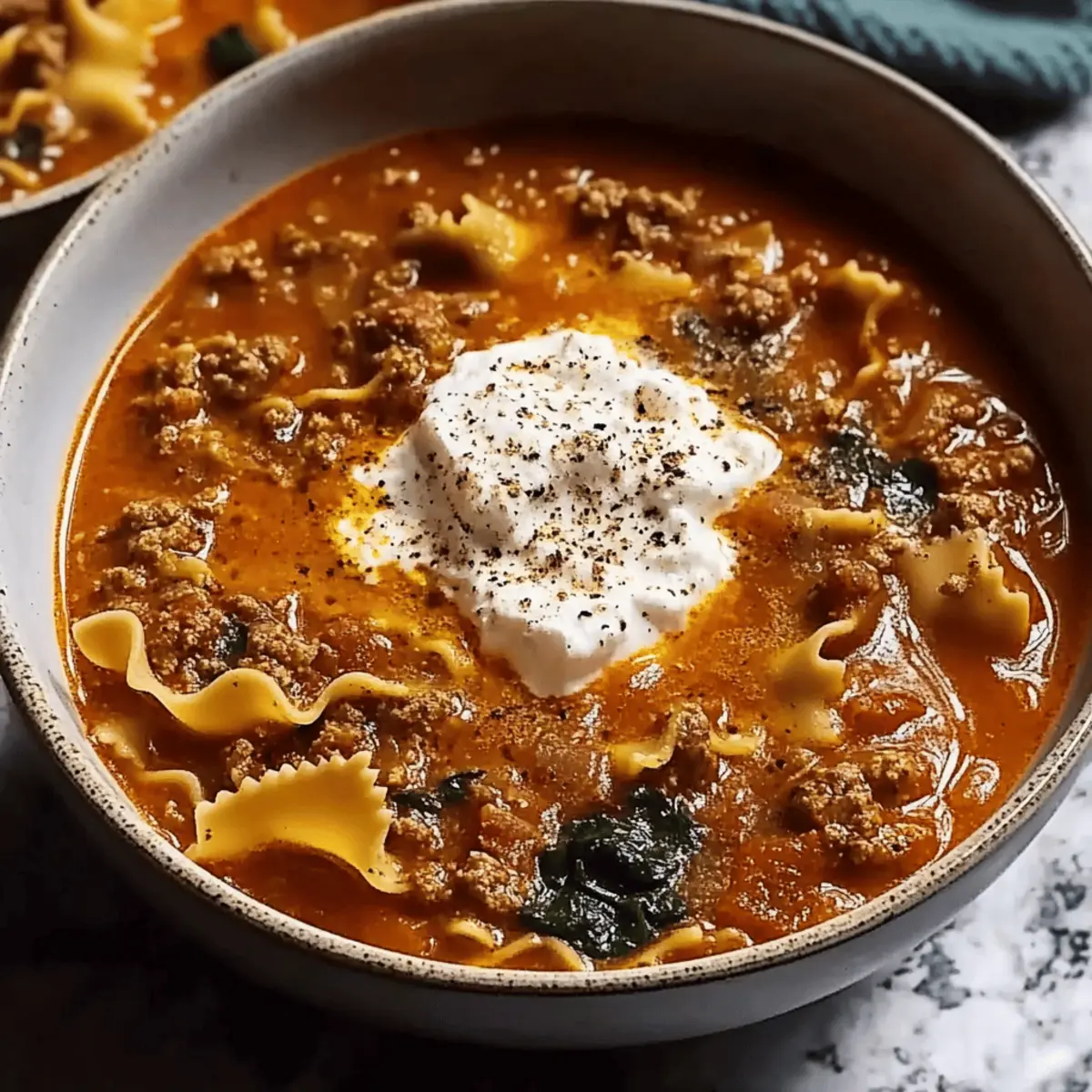 As I stirred the bubbling pot on my stove, the warm aroma of garlic and herbs filled my kitchen, awakening memories of family gatherings around the dinner table. This is the magic of my One Pot Lasagna Soup—a perfect blend of classic Italian comfort food and modern convenience. In just one pot, you’ll create a hearty meal layered with tender pasta, rich tomato broth, and creamy cheeses, all while minimizing cleanup. This dish not only satisfies the taste buds but also makes family mealtime a breeze, perfect for those busy weeknights when you crave something comforting yet easy to prepare. Ready to transport your kitchen to Italy without the fuss? Let’s dive into this delicious recipe! Why Is One Pot Lasagna Soup a Winner? Simplicity at Its Best: Everything comes together in one pot, minimizing cleanup while maximizing flavor. Rich, Hearty Flavor: A delightful mix of spices, cheeses, and tomatoes creates a robust taste reminiscent of your favorite lasagna. Family-Friendly: This meal is sure to please even the pickiest eaters, making it a cornerstone of family dinners. Versatile Options: Easily swap ingredients to cater to dietary preferences, like using ground turkey or making it vegetarian. Quick Cooking: Perfect for busy weeknights, this dish can be whipped up in about 30 minutes! Complete your family meal with a side of crusty garlic bread or serve it alongside a refreshing Caesar salad for balance. Enjoy every warm, comforting spoonful! One Pot Lasagna Soup Ingredients For the Soup Ground Beef – Provides protein and rich flavor; use ground chuck for the best tenderness. Garlic (3 cloves, finely minced) – Adds aromatic depth and enhances the soup’s flavor. Yellow Onion (1/2, diced) – Sautéed to bring sweetness and texture to the mix. Garlic Powder (1/2 tsp) – Boosts garlic flavor effortlessly without extra prep time. Onion Powder (1/2 tsp) – Contributes background complexity to the overall taste. Dried Basil (1/4 tsp) & Dried Oregano (1/2 tsp) – Infuse classic Italian herb flavors into the soup. Kosher Salt (1 tsp, plus more as needed) – Essential for balancing and enhancing the dish’s flavors. Ground Black Pepper – Adds a touch of heat for seasoning. Crushed Tomatoes (14 oz can) – Forms the base of the One Pot Lasagna Soup, delivering rich acidity. Chicken Broth (32 oz) – Provides moisture and flavor; feel free to add more if desired. Water (1 cup) – Adjusts the soup’s consistency to your preference. Tomato Paste (2 tsp) – Thickens the soup and intensifies the tomato flavor. Lasagna Noodles (6 oz, broken up) – The star carbohydrate; break into bite-sized pieces for easy cooking. Frozen Chopped Spinach (1 cup) – Adds nutrition with minimal effort—no need to thaw beforehand! Heavy Cream (1/4 cup) – Brings a delightful creaminess and richness to the soup. For Topping Ricotta Cheese – Offers traditional lasagna creaminess when dolloped on top. Mozzarella Cheese (4 oz, sliced) – Melts beautifully, providing that gooey, cheesy finish. Parmesan Cheese (optional) – Sprinkle on top for an extra umami flavor boost. Dive into your One Pot Lasagna Soup adventure and watch as your family gathers around the table for this comforting delight! Step‑by‑Step Instructions for One Pot Lasagna Soup Step 1: Brown the Beef In a large pot, heat a drizzle of olive oil over medium-high heat. Add 1 pound of ground beef, breaking it up as it cooks. Sauté for about 5-7 minutes until it’s browned and no longer pink. Drain any excess grease, leaving the flavorful bits at the bottom for the soup’s base. Step 2: Sauté Aromatics Reduce the heat to medium and stir in 3 cloves of minced garlic and ½ diced yellow onion. Cook for about 5 minutes until the onion is translucent and fragrant. Sprinkle in ½ teaspoon of garlic powder, ½ teaspoon of onion powder, ¼ teaspoon of dried basil, ½ teaspoon of dried oregano, 1 teaspoon of kosher salt, and freshly ground black pepper to taste, mixing well. Step 3: Add Tomatoes and Broth Pour in one 14-ounce can of crushed tomatoes, 32 ounces of chicken broth, 1 cup of water, and 2 teaspoons of tomato paste. Stir the mixture thoroughly to combine all the ingredients, and let it simmer for about 5 minutes on medium heat, allowing the flavors to meld beautifully. Step 4: Incorporate Noodles Break 6 ounces of lasagna noodles into 2-inch pieces and add them to the pot. Bring the soup to a boil, then reduce the heat to low, cover it, and let it simmer for 10 minutes until the noodles are tender and cooked through, stirring occasionally to prevent sticking. Step 5: Add Spinach and Cream Stir in 1 cup of frozen chopped spinach and ¼ cup of heavy cream. Let the One Pot Lasagna Soup simmer uncovered for an additional 5 minutes. This step helps the flavors blend while adding a rich, creamy texture that elevates the soup’s heartiness. Step 6: Serve with Cheesy Goodness To serve, place a slice of mozzarella cheese in the bottom of each bowl and ladle the warm One Pot Lasagna Soup over it. Top each bowl with a dollop of ricotta cheese, and if desired, finish with a sprinkle of Parmesan cheese for an extra layer of flavor and charm. What to Serve with One Pot Lasagna Soup A cozy family dinner isn’t complete without delicious pairings to complement the heartiness of your soup. Garlic Bread: The perfect crispy counterpart; its buttery, garlicky flavor elevates the creamy richness of the soup. Caesar Salad: A refreshing mix of crisp romaine, tangy dressing, and crunchy croutons offers a delightful contrast to the warm soup. Cheesy Garlic Knots: Soft, chewy knots infused with garlic and cheese make for an indulgent, satisfying side that’s fun to share. Roasted Vegetables: Seasoned and caramelized veggies add an earthy sweetness, balancing the savory flavors of the lasagna soup beautifully. Red Wine: A glass of medium-bodied red wine, like Chianti or Pinot Noir, pairs wonderfully, enhancing the Italian flavors throughout the meal. Ch