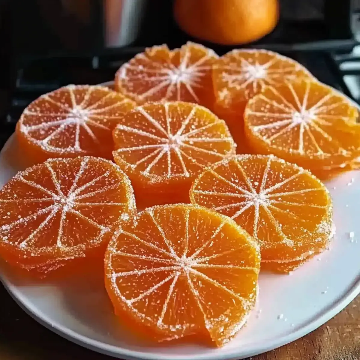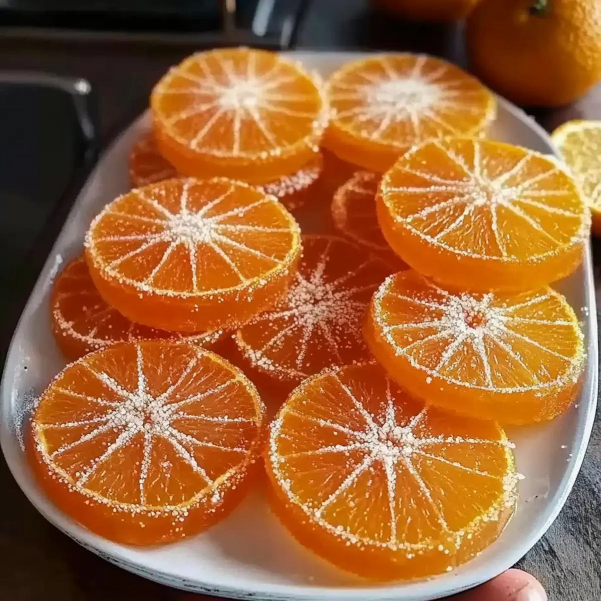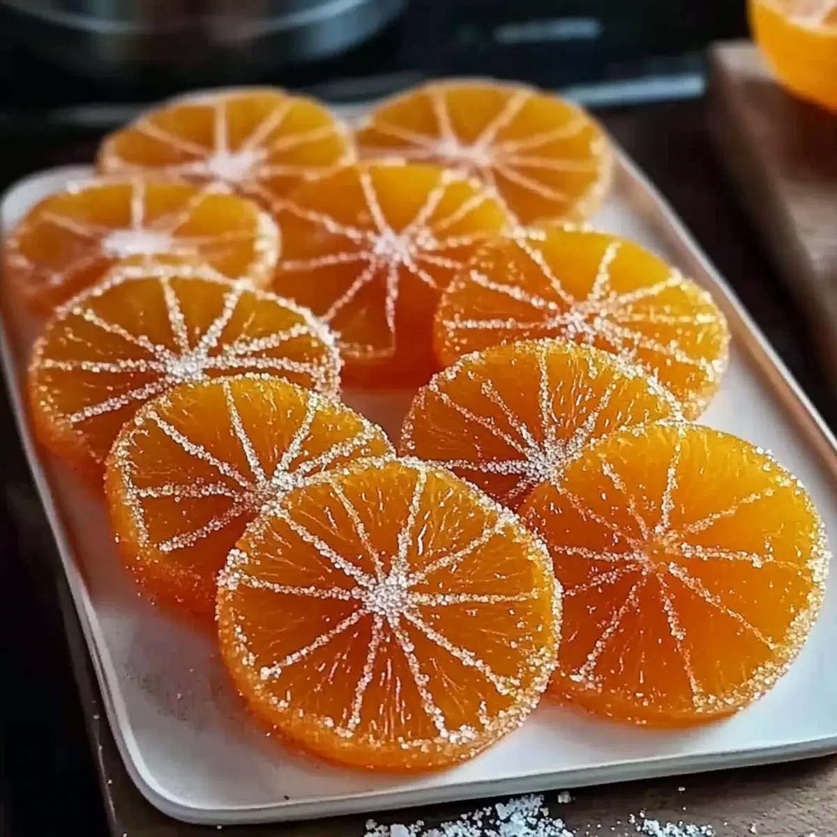 In the heart of my kitchen, a delightful aroma begins to fill the air—it’s time to create classic homemade orange candy! This charming treat transforms simple ingredients into something extraordinary, bringing a touch of elegance to snacking or dessert decorating. What I love most about this recipe is how it offers a naturally vegan and gluten-free candy experience that feels indulgent without the guilt. Plus, with just two ingredients, you’ll find the preparation as effortless as it is rewarding. Imagine the bright orange slices, glistening with syrupy goodness, ready to elevate your favorite cocktails or act as stunning cake decorations. Ready to dive into this fruity endeavor? Let’s make magic happen together with orange candy that’s sure to impress! Why Is This Orange Candy So Special? Simplicity at Its Finest: With just two ingredients, this recipe makes creating homemade orange candy a breeze, allowing everyone to indulge in a gourmet treat without the fuss. Elegantly Versatile: Use these candied orange slices to elevate desserts, cocktails, or even snack bowls for a charming touch. Naturally Vegan & Gluten-Free: Perfect for those with dietary restrictions, this candy caters to a variety of lifestyles while still satisfying your sweet tooth. Flavor That Dazzles: The sweet-tangy combination of the citrus transforms into a chewy delight that will have you savoring every bite. Time Well Spent: Simmering oranges takes just under an hour, but the wait is well worth it for your new favorite candy. Dive into this sweet journey with ease, and consider pairing them with your homemade cheesecakes or using the syrup in refreshing cocktails for an extra pop of flavor! Orange Candy Ingredients For the Candy • Oranges – The star ingredient, choose small oranges or tangelos for the best flavor and texture. • Granulated Sugar – Essential for sweetness and preservation; don’t reduce this as it creates that irresistible candy texture. • Water – Used to make the sugar syrup that immerses and cooks the orange slices to perfection. For Optional Finishing Touches • Extra Sugar – Rolling the dried orange slices in sugar adds a delightful frosted finish and extra sweetness. • Chocolate – Dipping in melted chocolate gives a gourmet twist, making your homemade orange candy feel truly indulgent. With these simple ingredients, you’re just a step away from creating delightful orange candy that dazzles! Step‑by‑Step Instructions for Orange Candy Step 1: Prepare Oranges Begin by washing and drying your oranges to remove any wax or dirt. Using a sharp knife or mandoline, slice the oranges into thin ¼-inch rounds, ensuring even thickness for uniform cooking. You should aim for about three small oranges or tangelos, beautifully exposing the vibrant citrus color that’s essential for your orange candy. Step 2: Make Syrup In a large skillet, combine three cups of granulated sugar and three cups of water, stirring gently to dissolve the sugar. Heat the mixture over medium-high heat until it comes to a boil, bubbling vigorously for about 2-3 minutes. Keep an eye on it as it simmers; the syrup should become clear and thick, creating a luscious base for your orange slices. Step 3: Simmer Oranges Once the syrup is ready, reduce the heat to low to maintain a gentle simmer. Carefully add the orange slices in a single layer, ensuring they are fully immersed in the syrup. Let them simmer for 45–60 minutes, turning the slices occasionally with tongs until the peels turn translucent, signaling that your orange candy is nearly complete and filling the kitchen with a sweet aroma. Step 4: Dry Slices After simmering, use tongs to carefully remove the candied orange slices from the skillet. Lay them flat on a wire rack, allowing the excess syrup to drip off. At this stage, let the slices dry at room temperature for 24–48 hours, uncovered, until they become tacky yet firm—a key characteristic of your beautiful homemade orange candy. Step 5: Optional Finishes If you desire an extra touch of sweetness, consider rolling the dried orange slices in granulated sugar for a frosted appearance. Alternatively, dip each slice in melted chocolate for a rich, gourmet flair that complements the bright flavors of the orange candy. Enjoy this delightful transformation as you prepare to enjoy or gift your elegant treats! Make Ahead Options These classic homemade orange candy slices are perfect for busy home cooks looking to save time! You can slice your oranges and prepare the sugar syrup up to 24 hours in advance. Just keep the prepared syrup in an airtight container in the refrigerator; it will keep its sweetness and quality. When you’re ready to make your orange candy, simply add the pre-sliced oranges into the syrup and continue with the simmering process. After simmering, allow the slices to dry for 24–48 hours to achieve that perfect tacky texture. By prepping ahead, not only do you streamline your candy-making process, but you’ll also have a delightful treat ready to enjoy or share, just as delicious as if made fresh! How to Store and Freeze Orange Candy Room Temperature: Store your homemade orange candy in an airtight container at room temperature for up to one month, ensuring you include parchment between layers to prevent sticking. Fridge: While refrigeration isn’t necessary, you can keep the orange candy in the fridge for extended freshness; just be aware that it may become slightly firmer. Freezer: For longer storage, freeze the orange slices in an airtight bag or container for up to 6 months. Thaw them at room temperature before enjoying. Reheating: If you’ve opted for the chocolate-dipped version, gently rewarm in the microwave or let them sit at room temperature for a few minutes before serving. What to Serve with Classic Homemade Orange Candy Indulge your senses and create a beautiful meal experience with delightful pairings that enhance the sweet-tangy flavor of your orange cand