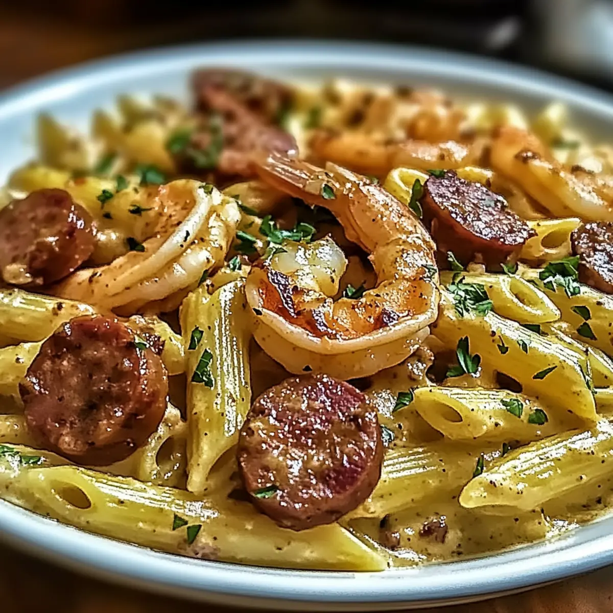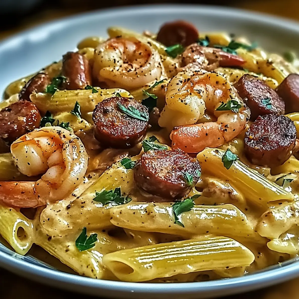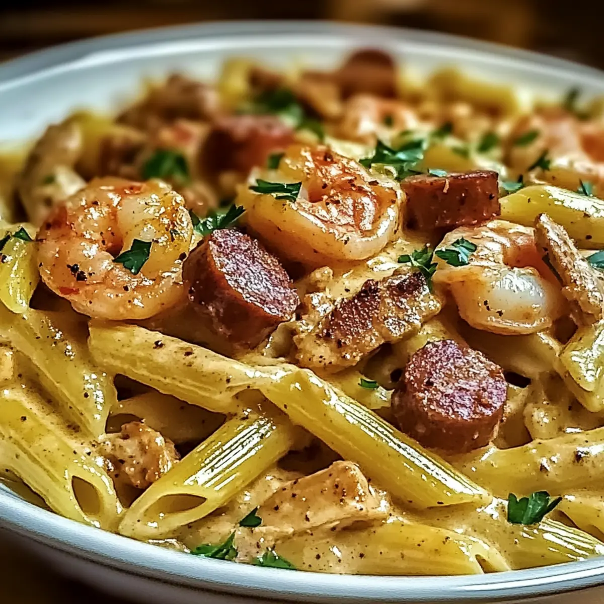 The scent of Cajun spices wafts through the air, instantly transporting me to the lively streets of New Orleans. I’m excited to share my take on the Creamy Cajun Pappadeaux Mardi Gras Pasta, a dish that brings a taste of the Big Easy right to my kitchen. This recipe is not only a celebration of flavors—its creamy, luscious sauce coats perfectly cooked penne pasta and mingles with plump shrimp, tender chicken, and smoky andouille sausage, but it also comes together in under 30 minutes! Perfect for those busy weeknights, it’s endlessly customizable, allowing you to adjust the ingredients based on what you have on hand. Friends and family will adore this comfort food, making it an easy crowd-pleaser. Are you ready to bring a little Mardi Gras magic to your dinner table? Why is Pappadeaux Mardi Gras Pasta a must-try? Vibrant Flavors: This dish is a celebration of bold Cajun spices that dance on your palate, transporting you straight to the heart of New Orleans. Quick & Easy: Ready in under 30 minutes, it’s the perfect solution for busy weeknights when you crave something special without the hassle. Customizable Delight: Swap out proteins or vegetables as you please—try shrimp or chicken, or even load up on veggies for a delightful vegetarian option! Crowd-Pleaser: Friends and family will be asking for seconds, and you’ll love how effortlessly it brings everyone together. Creamy Indulgence: Enjoy a rich, creamy sauce that clings beautifully to every penne, making each bite a slice of comfort. Elevate your meal game with a side of fresh garden salad like in my Garlic Parmesan Pasta or pair it with my quick Tomato Bacon Pasta for mere magic on your table! Pappadeaux Mardi Gras Pasta Ingredients For the Pasta • Penne Pasta – The perfect base for this creamy dish; substitute with fusilli or rigatoni for a twist. For the Protein • Boneless Skinless Chicken Breast – Provides lean protein; can be swapped for turkey or omitted for a vegetarian option. • Shrimp – Briny and sweet, a must for this recipe; scallops or extra veggies can work as delightful replacements. • Andouille Sausage – Adds a smoky richness; consider using chorizo or kielbasa for a different flavor twist. For the Vegetables • Bell Peppers – Great for added sweetness and color; feel free to use any variety for a spicier flavor! • Red Onion – Enhances sweetness in the dish; swap for yellow onion for a milder sweetness. • Garlic – Essential for depth of flavor; if you’re in a pinch, garlic powder (1/8 tsp per clove) will do! For the Sauce • Heavy Cream – Creates that rich, luscious sauce; half-and-half or non-dairy alternatives are perfect lighter substitutions. • Parmesan Cheese – Provides umami richness; swap with Pecorino Romano or nutritional yeast for a dairy-free option. For Seasoning • Cajun Seasoning – The key to authentic Cajun flavor; adjust to control the heat level as you prefer! • Olive Oil – Ideal for sautéing proteins; butter or a neutral oil like canola can work just as well. • Salt and Pepper – Classic seasonings to enhance the dish; remember to adjust according to taste! For Garnish • Chopped Parsley – Adds a fresh touch and a pop of color; chives can be a lovely alternative as well. Step‑by‑Step Instructions for Creamy Cajun Pappadeaux Mardi Gras Pasta Step 1: Cook the Pasta Begin by bringing a large pot of salted water to a rolling boil. Add the penne pasta and cook until al dente, usually about 10-12 minutes, ensuring it has a slight bite. Once cooked, drain the pasta and set it aside in a large bowl while you prepare the rest of the Creamy Cajun Pappadeaux Mardi Gras Pasta. Step 2: Sauté the Chicken In a large skillet, heat 2 tablespoons of olive oil over medium-high heat. Season the boneless skinless chicken breast with Cajun seasoning and gently add it to the hot skillet. Cook for about 4-5 minutes, until the chicken is golden brown and cooked through, with no pink remaining. Remove the chicken from the skillet and keep it warm on a plate. Step 3: Cook the Shrimp Using the same skillet, add the shrimp to the remaining oil. Sauté for about 2-3 minutes, or until the shrimp turn pink and opaque. Be mindful not to overcook them. Once done, remove the shrimp from the skillet and set aside with the chicken as you proceed with the next steps of the Creamy Cajun Pappadeaux Mardi Gras Pasta. Step 4: Sauté Sausage and Veggies Add the sliced andouille sausage to the skillet and sauté for 2 minutes until browned. Then, toss in the chopped bell peppers, red onion, and minced garlic. Stir and cook for an additional 4 minutes or until the vegetables are tender and fragrant, absorbing the flavors left in the pan. Step 5: Create the Sauce Pour in 1 cup of heavy cream, stirring to combine with the sautéed vegetables. Bring to a gentle simmer and let it cook for 2-3 minutes, allowing it to thicken slightly. Gradually add the grated Parmesan cheese, stirring continuously until melted and smooth. Taste the sauce and adjust seasoning with salt and pepper as needed. Step 6: Combine Everything Return the cooked chicken and shrimp back into the skillet, followed by the drained penne pasta. Toss everything gently together, ensuring the pasta is well-coated in the creamy sauce. Allow it to heat through for about 1-2 minutes, ensuring every bite of your Creamy Cajun Pappadeaux Mardi Gras Pasta is brought to life. Step 7: Add Garnish and Serve Finally, sprinkle chopped parsley over the top of your creamy pasta dish for a fresh touch and a dash of color. Serve the Creamy Cajun Pappadeaux Mardi Gras Pasta hot on plates or family-style in a large bowl, inviting everyone to dive into this comforting meal together. Make Ahead Options These Creamy Cajun Pappadeaux Mardi Gras Pasta are perfect for meal prep enthusiasts! You can cook the penne pasta and sauté the chicken, shrimp, and sausage up to 24 hours in advance, storing them separately in airtight containers in the re