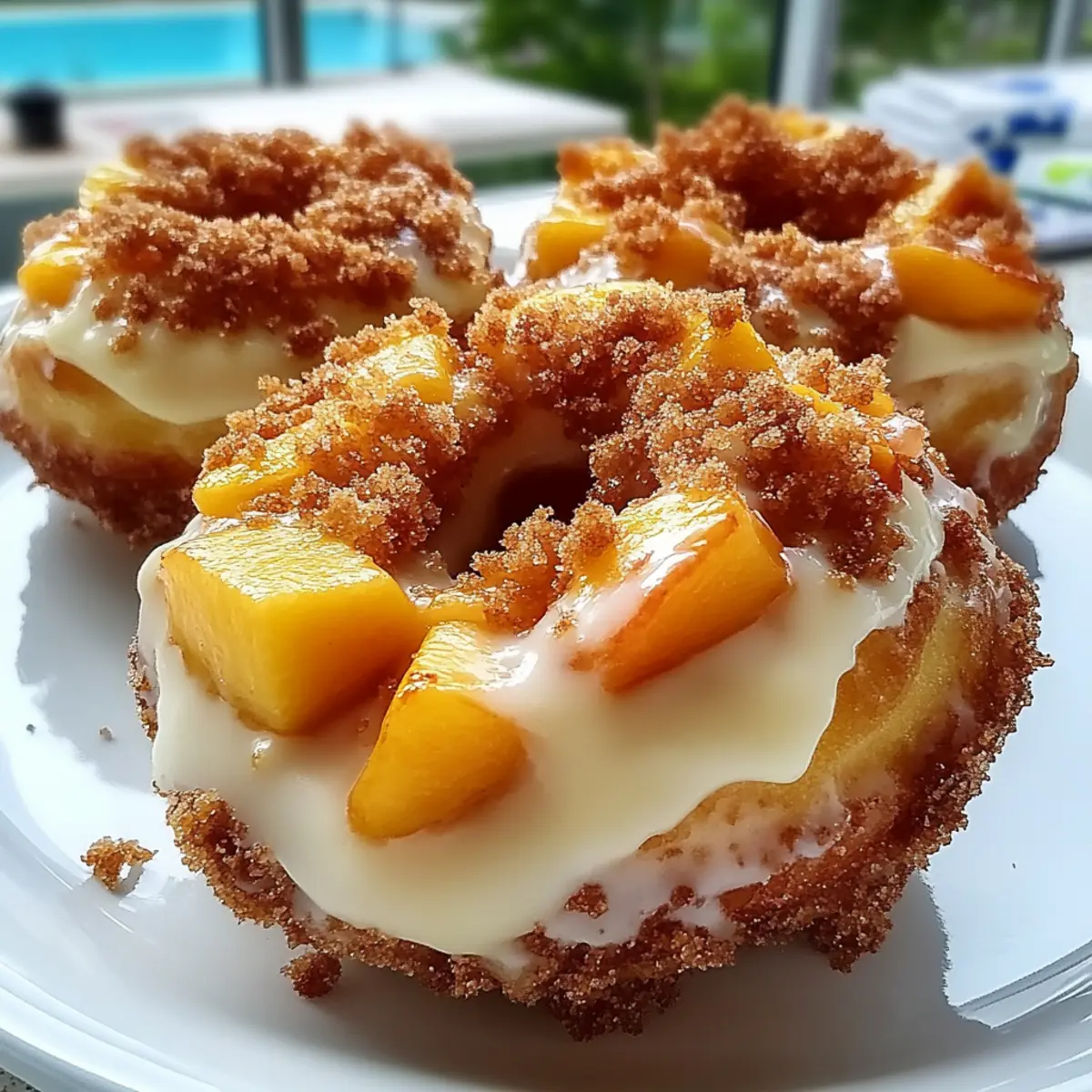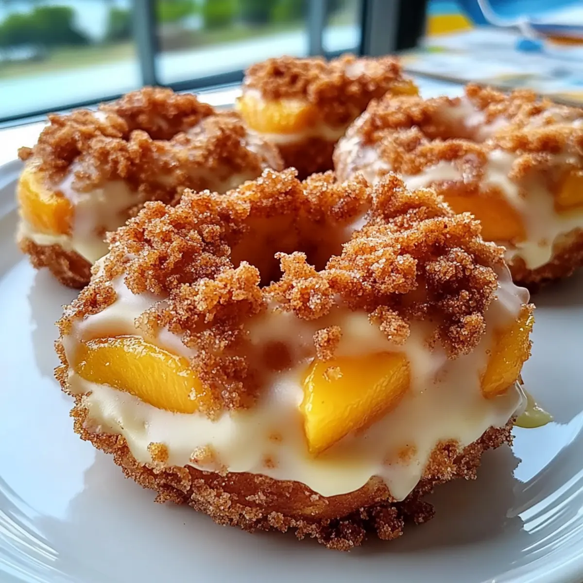 The scent of summer peaches ripening in the sun captivates my senses each year, making me crave something special to celebrate their glory. Enter my Classic Peach Cobbler Cheesecake Donuts, a whimsical take on a beloved dessert that’s sure to impress. These delightful treats blend the soft, fluffy texture reminiscent of traditional peach cobbler with a luscious cheesecake topping, creating a winning combination perfect for any summer brunch or casual gathering. The best part? They’re surprisingly easy to whip up using refrigerated biscuit dough, and you have the option to bake them for a lighter twist. Whether you’re a passionate home-chef or someone simply looking to elevate your dessert game, these donuts promise to become a summer favorite. Will you join me in diving into this deliciously sweet adventure? Why are these donuts a must-try? Irresistible Flavor: The combination of succulent peaches and creamy cheesecake creates a flavor explosion that perfectly balances sweetness and tang. Quick & Easy: With refrigerated biscuit dough as your base, these donuts come together in no time, making them a convenient option for busy bakers. Versatile Options: Enjoy fresh peaches in summer, or opt for frozen ones in winter. Plus, you can bake instead of frying for a healthier alternative! Perfect for Gatherings: They’re a crowd-pleaser at brunches or parties, ensuring everyone leaves with a satisfied smile. If you’re looking for more peach-infused delights, check out my Apple Crumble Cheesecake or explore fun variations of cheesecake in my Biscoff Cookie Cheesecake. Visual Appeal: Topped with vibrant peaches and a sprinkle of cobbler crumbs, these donuts will not only tantalize taste buds but also charm with their beautiful presentation! Peach Cobbler Cheesecake Donuts Ingredients For the Donuts • Refrigerated Buttermilk Biscuits – The base for the donuts; offers a quick and easy way to achieve soft, tender treats. • Vegetable Oil – Ideal for frying; a neutral, high-heat oil ensures crispy, golden donuts without adding unwanted flavors. For the Cheesecake Topping • Cream Cheese – Full-fat cream cheese creates a rich, tangy layer that beautifully balances sweetness. • Powdered Sugar – Sweetens the cheesecake; dissolves easily for a silky-smooth texture. • Vanilla Extract – Adds depth of flavor; use pure vanilla for the best results. • Heavy Cream – Incorporates into the cheesecake layer, ensuring a creamy spreadable consistency. For the Peach Topping • Chopped Peaches – Fresh or frozen peaches provide juicy sweetness and are the star of this delightful topping. • Light Brown Sugar – Sweetens the peach mixture; adds a touch of deep, caramel flavor. • Lemon Juice – Brightens the peach flavor and prevents a flat sweetness. • Ground Cinnamon – Adds warmth and spice; a classic complement to peaches. • Ground Nutmeg – Enhances warmth, pairing well with cinnamon for a cozy flavor. • Cornstarch – Thicken peach sauce; helps create a topping that sticks without running off the donuts. • Water – To create a cornstarch slurry for thickening the peach sauce. For the Cobbler Crumb • All-Purpose Flour – Forms the structure of the topping; a key player in the cobbler crumb mixture. • Granulated Sugar – Balances the sweetness with a lighter touch alongside brown sugar. • Salt – Just a pinch enhances all other flavors. • Unsalted Butter – Binds the cobbler crumb and brings in a rich, buttery flavor. For the Glaze • Milk – Thins the vanilla glaze; adjust with more milk for desired consistency. • Graham Cracker Crumbs (optional) – For garnish; adds a delightful nod to the cobbler crust. With these Peach Cobbler Cheesecake Donuts ingredients on hand, you’re well on your way to crafting a sweet summer masterpiece that everyone will adore! Step‑by‑Step Instructions for Peach Cobbler Cheesecake Donuts Step 1: Prepare Peach Topping In a medium saucepan, combine chopped peaches, light brown sugar, lemon juice, ground cinnamon, and nutmeg over medium heat. Cook for about 5-7 minutes, stirring occasionally until the peaches soften and release their juices. Once bubbling, create a cornstarch slurry by mixing cornstarch with water, then add it to the peach mixture. Cook for an additional 2 minutes until thickened. Set aside to cool while you prepare the remaining components. Step 2: Make Cobbler Crumb In a mixing bowl, whisk together all-purpose flour, granulated sugar, light brown sugar, ground cinnamon, and salt. Melt unsalted butter and pour it over the dry mixture, stirring with a fork until it becomes clumpy and crumbly. Spread the cobbler crumb mixture evenly on a baking sheet lined with parchment paper, and bake in a preheated oven at 350°F for 8-10 minutes, or until golden brown. Allow to cool completely. Step 3: Prepare Cheesecake Layer In a large mixing bowl, beat softened cream cheese using an electric mixer until fluffy and light in color, approximately 2-3 minutes. Gradually incorporate powdered sugar and vanilla extract, mixing until smooth and creamy. Pour in heavy cream, mixing until well combined and light. Transfer the cheesecake mixture to the refrigerator to chill for at least 30 minutes, allowing it to firm up slightly. Step 4: Shape and Fry Donuts Open the refrigerated buttermilk biscuits, and using a round cutter or your thumb, cut out the center of each biscuit to create a donut shape. Heat vegetable oil in a deep skillet or pot over medium-high heat until it reaches 350°F. Carefully fry the donuts in batches for 1-2 minutes per side until golden brown, using tongs to flip them as needed. Once cooked, remove donuts and let them drain on a wire rack. Step 5: Make Vanilla Glaze In a mixing bowl, whisk together powdered sugar, milk, and vanilla extract until smooth and pourable, adjusting the milk quantity to achieve your desired consistency. The glaze should be thin enough to coat the back of a spoon. Set the gl