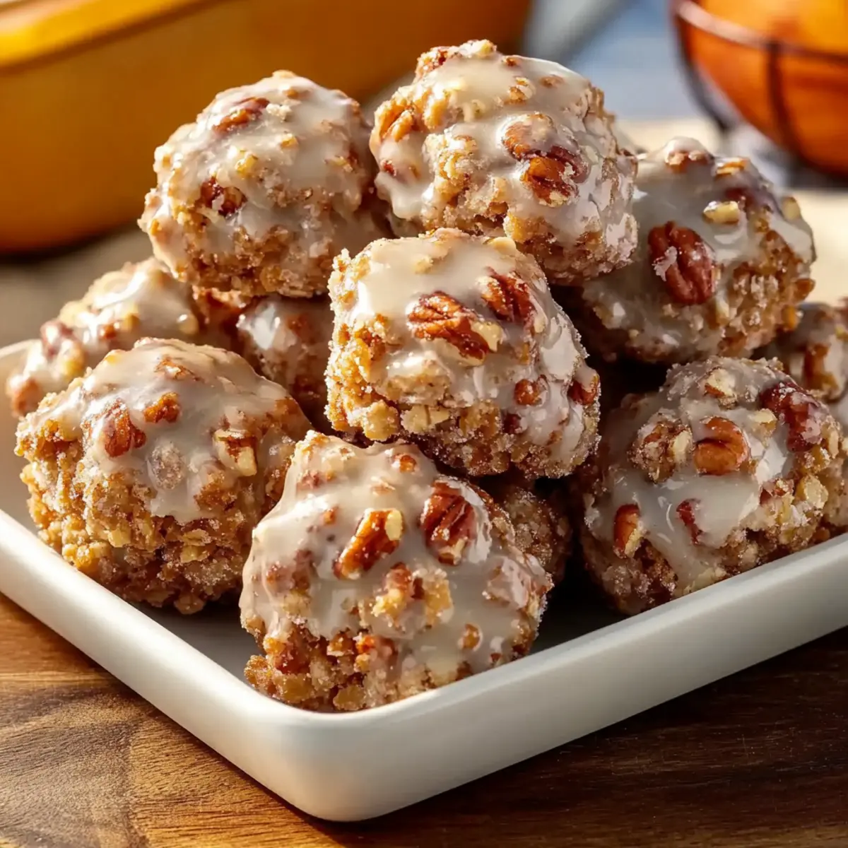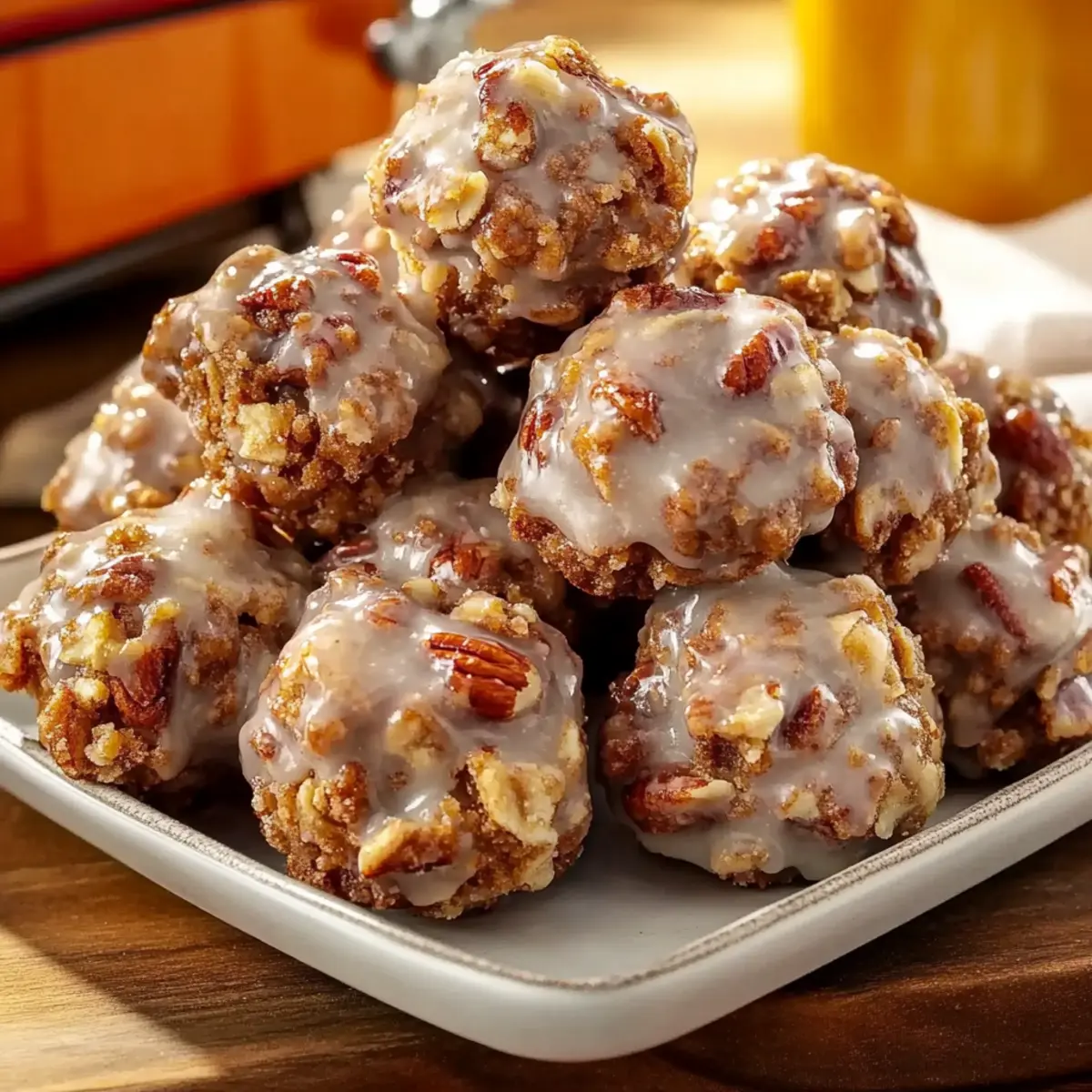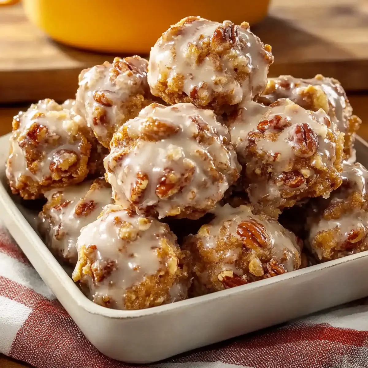 With the hum of the kitchen and the sweet aroma of melting butter, I found myself swept away by a wave of nostalgia, reminiscent of my favorite childhood treats. Enter the Pecan Crunch Glazed Bites—your new go-to no-bake delight that’s not just incredibly easy to whip up but also free of gluten. These charming bites marry the crunch of pecans with chewy oats, all snugly coated in a rich glaze, promising a satisfying texture that won’t crumble apart. Ideal for when you’re pressed for time yet seeking a homemade touch, these little gems will leave your taste buds dancing and your friends asking for seconds. Want to craft a sweet treat that’s a perfect snack for any occasion? Keep reading to learn how to make these heavenly bites! Why are Pecan Crunch Glazed Bites a must-try? Simplicity at its Best: With minimal ingredients and straightforward steps, anyone can master these no-bake treats. Irresistible Crunch: The combination of crispy rice and pecans delivers a satisfying texture you won’t forget. Flavor-Packed Glaze: A rich, sweet glaze elevates every bite, balancing perfectly with the nutty flavors. Perfect for Any Occasion: Whether it’s a party, dessert, or a quick snack, these bites fit the bill effortlessly. If you’re looking for more easy recipes, check out our Baked Chicken Tenders and Chicken Katsu Discover. No-Bake Convenience: Ideal for hot days or busy schedules—whip them up without ever turning on the oven! Crowd-Pleasing Appeal: Bring these to gatherings, and you’ll be the star of the show; they disappear fast! Pecan Crunch Glazed Bites Ingredients For the Bites Butter – Essential for richness and binding; substituting with plant-based butter keeps it dairy-free. Granulated Sugar – Adds the necessary sweetness and works with brown sugar for binding. Light Brown Sugar – Provides depth of flavor and moisture to enhance the bites. Milk (or Non-Dairy Alternative) – Hydrates the mixture; any non-dairy milk works as a substitute. Vanilla Extract – Elevates the nutty flavor and adds aromatic sweetness. Old-Fashioned Rolled Oats – Gives chewy texture and structure—quick oats will alter the final product. Crispy Rice Cereal – Creates a delightful crunch; feel free to swap for finely crushed cornflakes if needed. Chopped Pecans – The star ingredient; toasting lightly before using greatly enhances their flavor. For the Glaze Powdered Sugar – Creates a smooth glaze that sets perfectly on the bites. Milk (for Glaze) – Use to achieve your desired pourable consistency. Vanilla Extract (for Glaze) – Adds that familiar aromatic sweetness, tying the flavors together seamlessly. These Pecan Crunch Glazed Bites are not only a breeze to prepare, but they are also gluten-free and guaranteed not to crumble! Step‑by‑Step Instructions for Pecan Crunch Glazed Bites Step 1: Prepare Your Baking Sheet Start by lining a baking sheet with parchment paper, ensuring it covers the entire surface for easy cleanup. This preparation step is crucial as it prevents the Pecan Crunch Glazed Bites from sticking, allowing you to remove them effortlessly once they’ve set. Step 2: Combine Dry Ingredients In a large heatproof bowl, mix together the old-fashioned rolled oats, crispy rice cereal, and chopped pecans. This blend will create the hearty base for your Pecan Crunch Glazed Bites, providing both texture and flavor. Ensure the ingredients are evenly distributed for a consistent crunch in every bite. Step 3: Heat the Sugar Mixture In a medium saucepan, combine the butter, granulated sugar, light brown sugar, and milk over medium heat. Stir continuously until the mixture comes to a boil, which should take about 3-5 minutes. Once bubbling, allow it to boil for exactly 1 full minute; this step is essential for achieving the right bind and texture in the bites. Step 4: Add Vanilla to the Mixture After boiling for a minute, promptly remove the saucepan from heat and stir in the vanilla extract. The warm mixture should smell deliciously aromatic as you combine the ingredients. Be careful, as the mixture is hot, and make sure the vanilla is fully incorporated before proceeding to the next step. Step 5: Mix Wet and Dry Ingredients Pour the hot sugar mixture over your bowl of dry ingredients. Quickly mix everything together using a spatula or spoon until the oats, pecans, and crispy rice are coated evenly. You’ll notice the ingredients sticking together; this indicates that your Pecan Crunch Glazed Bites are well on their way to becoming a delightful treat! Step 6: Shape the Bites Using a spoon, scoop the mixture and form rounded spoonfuls onto the prepared baking sheet. Leave a little space between each bite to allow for slight spreading. The mixture should hold together without crumbling, creating a perfect shape as they are placed on the sheet. Step 7: Chill the Bites Place the baking sheet in the refrigerator to chill for at least 30 minutes or until the bites are firm. This step is vital as it allows the mixture to set properly, ensuring they hold their shape when served. Check for firmness before moving on to the final step. Step 8: Prepare the Glaze While the bites are chilling, whisk together the powdered sugar, milk, and vanilla extract in a medium bowl until smooth. Adjust the consistency by adding more milk if needed, ensuring it is pourable yet thick enough to beautifully coat your Pecan Crunch Glazed Bites. Step 9: Drizzle the Glaze Once the bites are firm, drizzle the prepared glaze over each bite generously using a spoon or a piping bag for a more artistic touch. The glaze will add sweetness and a lovely sheen to your Pecan Crunch Glazed Bites, enhancing their presentation and flavor. Step 10: Allow to Set After glazing, let the bites sit at room temperature for a few minutes until the glaze hardens slightly. This will perfect the final texture, creating a delightful contrast between the crunchy exterior and soft, chewy center—all without needing to bake! Ex