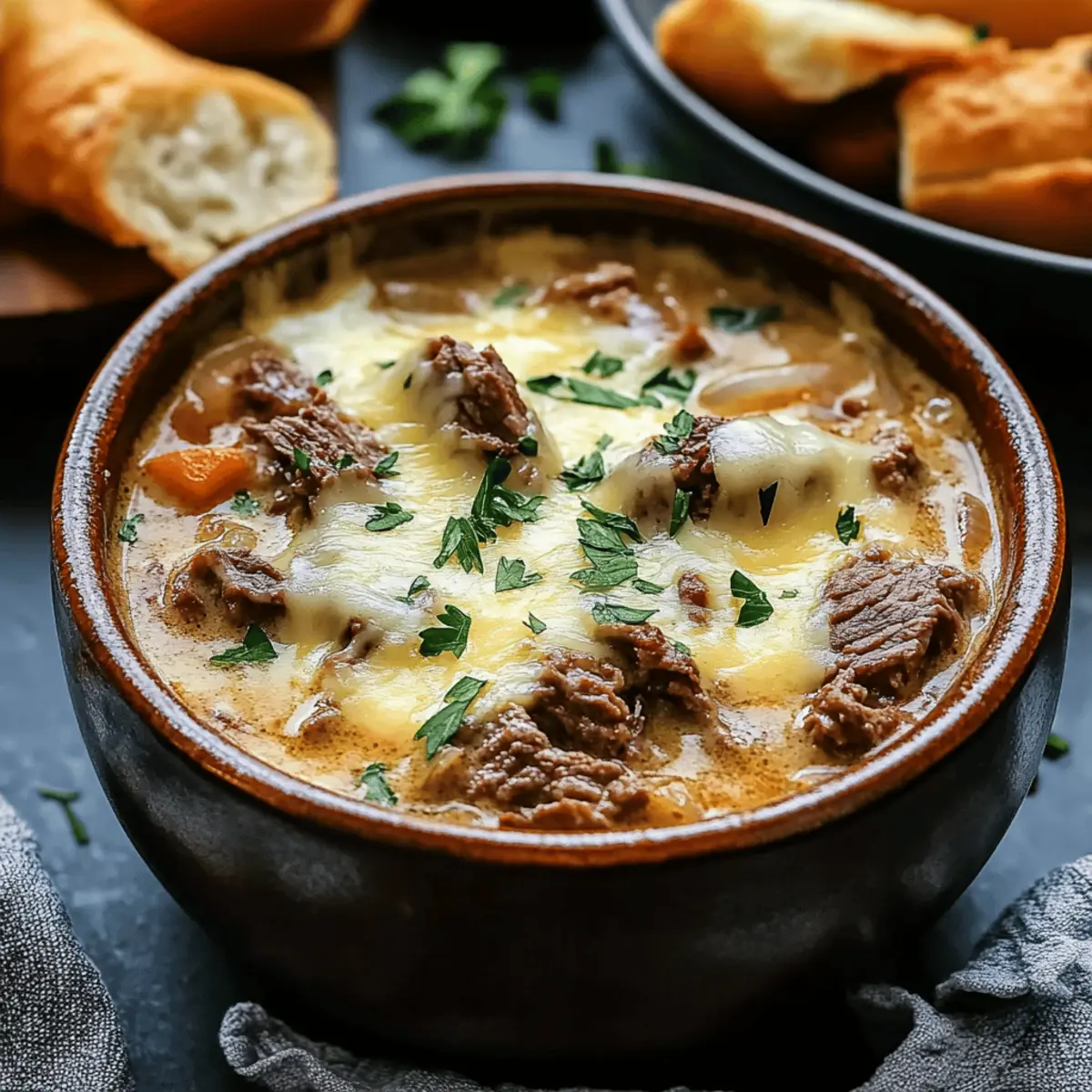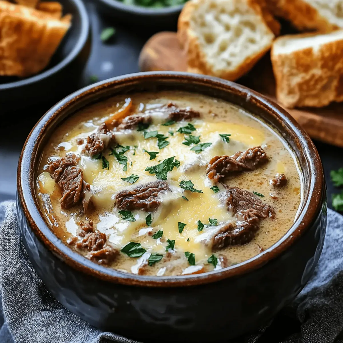 As I stood over the stove, the rich aroma of sizzling beef began to fill my kitchen, instantly transporting me to a cozy corner of a Philadelphia diner. This is how my love for Philly Cheese Steak Soup blossomed, turning a classic sandwich into a comforting bowl of warmth. A hearty meal that’s easy to whip up, this soup not only captures the beloved flavors of its namesake but also offers the flexibility to suit your dietary needs—whether you’re looking to swap in a different cut of meat or adjust for gluten-free options. Perfect for those chilly evenings or casual get-togethers, this Philly Cheese Steak Soup is a crowd-pleaser that everyone will adore. Ready to dive into a creamy, savory delight? Why is Philly Cheese Steak Soup a Must-Try? Comforting warmth: Each spoonful of this soup delivers the nostalgic flavors of a classic cheesesteak, ideal for those cozy nights in. Customizable delight: Easily adapt the recipe to accommodate dietary preferences; substitute beef cuts or make it gluten-free without sacrificing flavor. Rich, creamy texture: The addition of heavy cream and provolone transforms this soup into a luxurious dish that feels indulgent yet heartwarming. Quick preparation: Whip it up in under 30 minutes, saving you time for what really matters—spending it with loved ones. Crowd-pleasing favorite: Whether you’re hosting a dinner party or enjoying a family meal, this soup is sure to impress everyone at the table. Consider pairing it with a delicious Breakfast Grilled Cheese or a side of Broccoli Cheddar Soup for an even heartier meal! Philly Cheese Steak Soup Ingredients For the Soup Base Beef sirloin – Provides heartiness and flavor; substitute with ribeye or flank if desired. Olive oil – Adds richness and is used for sautéing. Onion – The flavor base that adds sweetness; shallots can be used for a milder taste. Green bell pepper – Adds crunch and Vitamin C; red bell pepper can be swapped for a sweeter taste. Garlic – Aromatic and enhances the overall flavor profile. Beef broth – Serves as the liquid base, enhancing umami; opt for low-sodium for less salt. For Creaminess and Flavor Heavy cream – Imparts luxurious creaminess; substitute with half-and-half for a lighter soup. Provolone cheese – Melts beautifully, contributing creaminess and flavor; mozzarella or mild cheddar can be used if provolone isn’t available. For Seasoning Salt and pepper – Essential seasonings that enhance the dish’s flavors; adjust to taste. Now that we’ve gathered all the delicious ingredients for the Philly Cheese Steak Soup, you’re one step closer to enjoying this heartwarming creation. Let’s move on to crafting the perfect bowl of comfort! Step‑by‑Step Instructions for Philly Cheese Steak Soup Step 1: Sauté the Beef In a large pot, heat 2 tablespoons of olive oil over medium heat. Add sliced beef sirloin, cooking for 4–5 minutes or until browned and cooked through. Make sure to stir occasionally to achieve even browning. Once finished, transfer the beef to a plate and set aside, allowing the remaining juices to flavor your soup. Step 2: Cook the Vegetables In the same pot, add the chopped onion and green bell pepper, cooking for about 3–4 minutes until they soften and become fragrant. Stir in minced garlic and continue to sauté for an additional minute until the garlic is aromatic. This step builds a robust flavor base for your Philly Cheese Steak Soup. Step 3: Simmer the Soup Return the cooked beef to the pot and pour in 4 cups of beef broth. Increase the heat to high and bring the mixture to a gentle boil. Once boiling, reduce the heat to low and let the soup simmer uncovered for 15 minutes, allowing all the flavors to meld beautifully together. Step 4: Incorporate Cream and Cheese After simmering, stir in 1 cup of heavy cream and 1 cup of provolone cheese. Mix thoroughly until the cheese is completely melted and the soup is creamy. Allow the soup to heat through for another 2–3 minutes, ensuring the flavors are well combined while maintaining that luxurious texture typical of a good Philly Cheese Steak Soup. Step 5: Season and Serve Finally, taste the soup and adjust the seasoning with salt and pepper to your liking. Give it a good stir to blend the flavors, and then ladle the hot soup into bowls. Serve immediately, garnished with fresh parsley or chives if desired, and enjoy this comforting Philly Cheese Steak Soup with some crusty bread on the side. How to Store and Freeze Philly Cheese Steak Soup Fridge: Store leftover Philly Cheese Steak Soup in an airtight container for up to 3 days. Gently reheat on the stove over low heat, stirring frequently to maintain creaminess. Freezer: It’s best to avoid freezing this soup due to the heavy cream; it may separate and alter the texture upon thawing. Reheating: If you have refrigerated soup, reheat gently on the stove. Add a splash of beef broth or cream if it thickens too much while reheating. Storage Tip: Ensure the soup has cooled completely before placing it in the fridge to maintain quality. Expert Tips for Philly Cheese Steak Soup Perfectly Browned Beef: Ensure your beef is browned well for a rich flavor. Use a hot pan and avoid overcrowding to achieve a nice sear. Hearty Consistency: For a thicker soup, add a cornstarch slurry made from 1 tablespoon cornstarch mixed with 2 tablespoons cold water, stirring in gradually until desired thickness is reached. Spice it Up: Want heat? Add red pepper flakes or diced jalapeños while cooking the vegetables; just a little can transform your Philly Cheese Steak Soup into a warm, zesty delight. Creamy Texture: For a creamy finish, be cautious with the heavy cream; add it off the heat to prevent curdling, and stir until smooth and incorporated. Smart Storage: If you’re making a big batch, store any leftovers in the fridge for up to 3 days, but avoid freezing—cream can separate and ruin the texture upon thawing. Make Ahead Options These Philly Cheese Ste