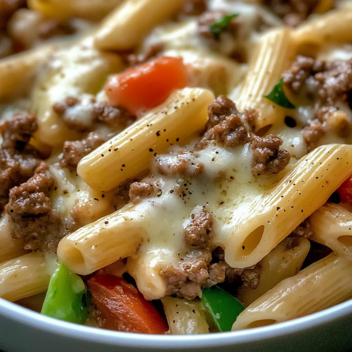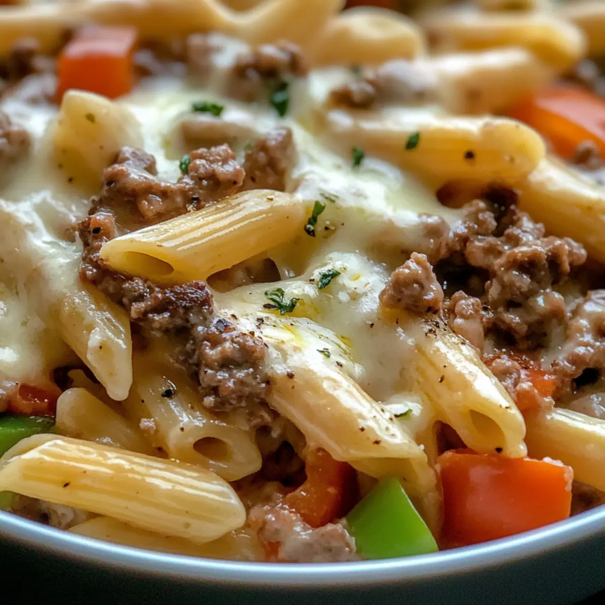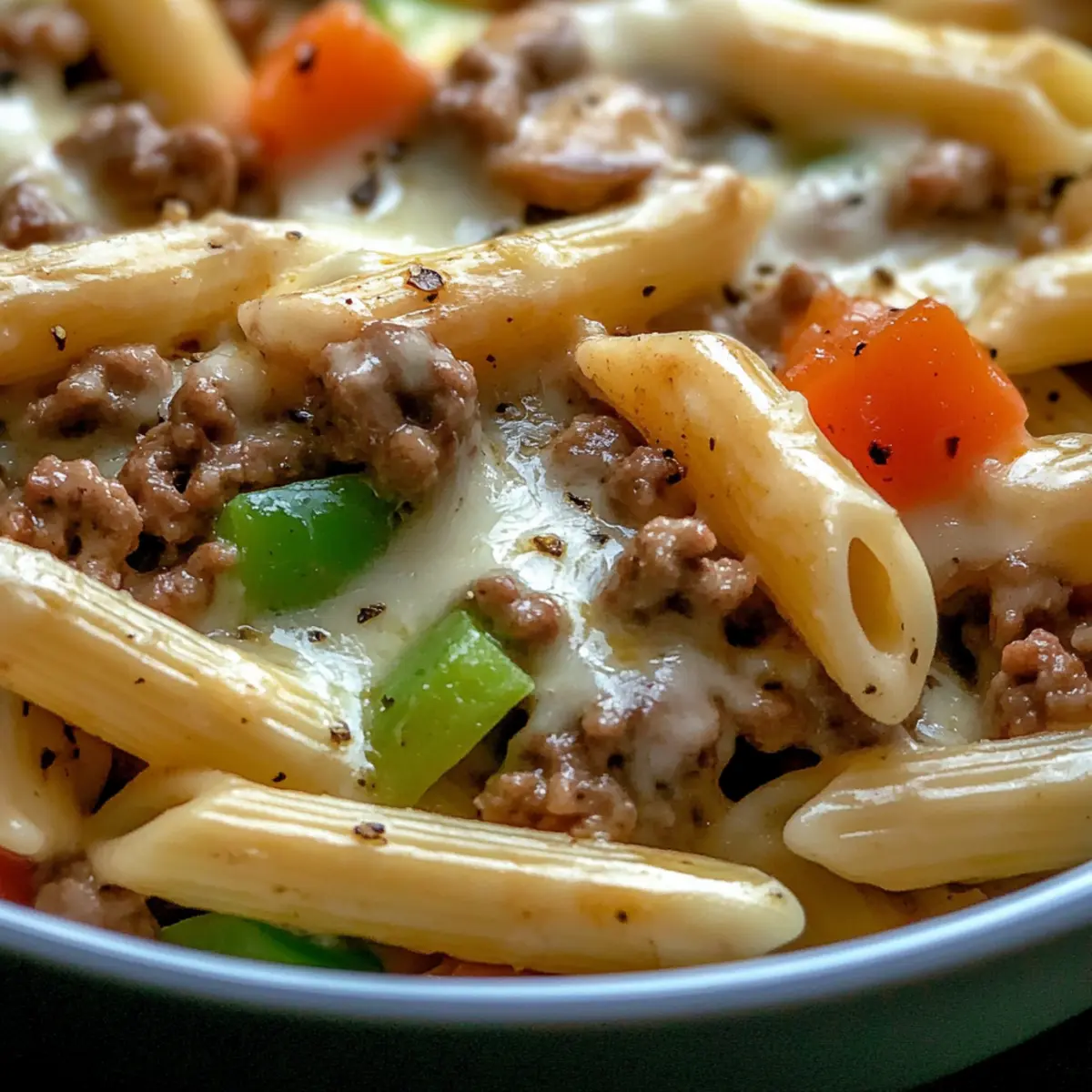 The aroma wafting from the kitchen transports me to a bustling street corner in Philadelphia, where the sight of cheesesteak sandwiches being grilled brings life to the city. Today, I’m recreating that magic in a quick family-friendly dish: cheesy Philly Cheesesteak Pasta. With savory ground beef, tender mushrooms, and colorful bell peppers, this one-pan wonder can be whipped up in just 30 minutes. It’s perfect for busy weeknights when you want to swap out fast food for a comforting meal that fills bellies and warms hearts. Whether you’re a seasoned home chef or just starting out, this dish is not only a guarantee for satisfied smiles, but it also offers versatility with simple ingredient swaps. What’s your favorite twist on a classic meal? Let’s dive into this delicious journey together! Why Will You Love This Recipe? Simplicity at its finest: The cooking process is straightforward and requires minimal prep time, letting you savor more family moments. Rich, Comforting Flavors: With a blend of savory ground beef, creamy cheese, and hearty vegetables, each bite is a delightful homage to the classic cheesesteak. Quick Cooking: Whip up this dish in just 30 minutes—perfect for those bustling weeknights when you need dinner on the table fast! Versatile Options: Swap out ingredients effortlessly! Whether using rotini instead of penne or adding your favorite veggies, customize it to please everyone at the table. Crowd-Pleaser: It’s family-friendly and sure to impress both kiddos and adults alike, making it a repeat favorite in your household. For other quick and delicious meals, check out my Garlic Parmesan Pasta or try the rich flavors of Shrimp Pasta Marry for a dinner that’ll win hearts! Philly Cheesesteak Pasta Ingredients • Here’s what you need to create this delicious dish: For the Pasta Penne Pasta – A classic choice; you can substitute with any shape like rotini or rigatoni for fun variations. For the Meat Sauce Ground Beef (1¼ lbs) – Adds rich, savory flavor; consider using thinly shaved steak for a more authentic texture. White Button Mushrooms (10 oz, sliced) – Infuses umami and texture; cremini mushrooms work as a tasty alternative. Onion (1 medium, chopped) – Enhances the overall flavor; yellow or red onions can provide a sweeter note. Green Bell Pepper (1, chopped) – Brings a pop of color and sweetness; swap for red or yellow peppers for a different twist. Condensed French Onion Soup (1 can, 10.5 oz) – Rich base for the sauce; make it homemade by sautéing onions with broth and seasonings. Worcestershire Sauce (1 tbsp) – Adds depth to the flavor; if you’re out, soy sauce can serve as a substitute. For Thickening the Sauce Cold Water (½ cup) – Helps blend with cornstarch for a velvety texture; no substitute needed. Cornstarch (1 tbsp) – Essential for thickening the sauce; flour works too, but adjust the quantity slightly. For the Cheesy Topping Provolone and Mozzarella Cheese (2 cups, shredded) – Creates a creamy, cheesy finish; feel free to use cheddar or a dairy-free option! For Seasoning Kosher Salt and Freshly Ground Black Pepper – Adjust to your taste, but be mindful of the saltiness of the soup and cheese. Now you’re ready to create a mouthwatering Philly Cheesesteak Pasta that will have your loved ones asking for more! Step‑by‑Step Instructions for Philly Cheesesteak Pasta Step 1: Preheat the Oven Begin by preheating your oven to 375°F (190°C). This ensures it’s hot enough to melt and brown the cheese later on. While the oven heats up, gather all your ingredients and equipment such as a large ovenproof skillet. Having everything ready will streamline the cooking process and make it more enjoyable. Step 2: Cook the Pasta Bring a large pot of salted water to a boil, then add the penne pasta. Cook it according to the package instructions until al dente, about 9-11 minutes. Once done, drain the pasta and set it aside. The pasta will absorb the delicious sauces later, making your Philly Cheesesteak Pasta even more flavorful. Step 3: Brown the Ground Beef In your large ovenproof skillet, heat over medium heat and add the ground beef. Cook until it’s nicely browned, stirring occasionally, which should take about 5-7 minutes. Once the beef is almost fully cooked, introduce the chopped onion, sliced mushrooms, and bell pepper to the skillet, cooking until the vegetables are tender and the beef is no longer pink, about another 5 minutes. Step 4: Add the Soup and Seasonings Lower the heat to medium-low and stir in the condensed French onion soup and Worcestershire sauce. In a small bowl, combine the cold water with cornstarch, whisking until smooth. Pour this mixture into the skillet, stirring continuously. Let it simmer for about 5 minutes until the sauce thickens and coats the meat and veggies beautifully. Step 5: Combine the Pasta Carefully fold the cooked penne pasta into the beef and vegetable mixture in the skillet. Use tongs or a spatula to mix thoroughly, ensuring that every piece of pasta is coated in the creamy sauce. This step is crucial as it brings all the flavors of your Philly Cheesesteak Pasta together in a delicious harmony. Step 6: Top with Cheese Once your pasta is well mixed, sprinkle the shredded provolone and mozzarella cheese evenly across the top of the dish. Make sure the cheese covers the entire surface, ready to melt into that gooey, comforting layer that makes cheesesteaks so irresistible. Step 7: Bake to Perfection Transfer the skillet to the preheated oven and bake for about 15 minutes, or until the cheese is melted and bubbly, with a slightly golden brown finish. The delicious aroma will fill your kitchen, signaling that your Philly Cheesesteak Pasta is almost ready to enjoy! What to Serve with Cheesy Philly Cheesesteak Pasta Create a delightful meal that pairs perfectly with the creamy, indulgent flavors of your pasta dish. Garlic Bread: Offers a crunchy texture that contrasts beautifully with the