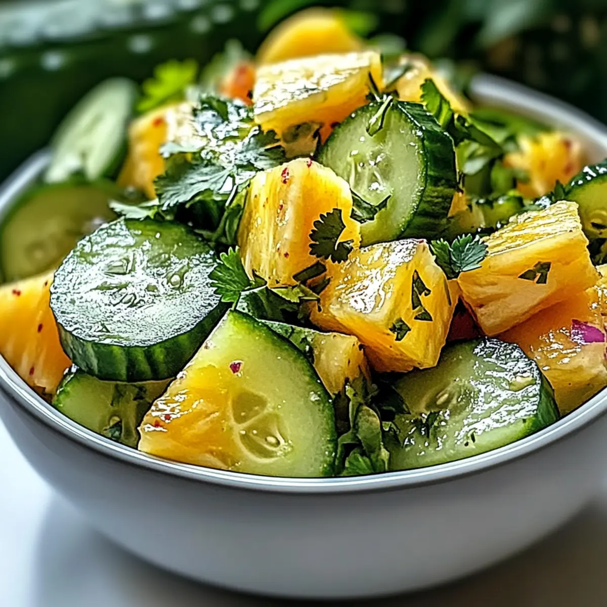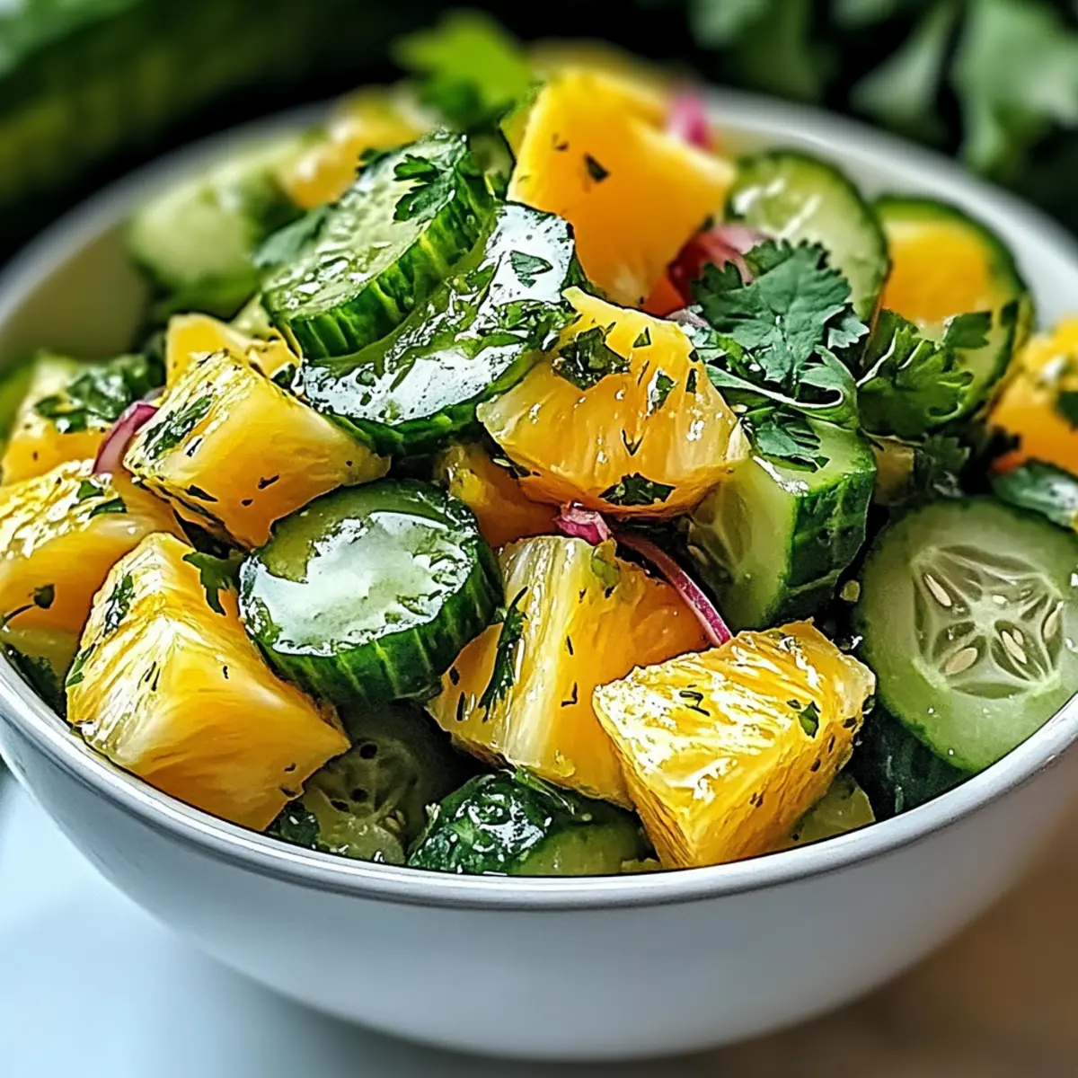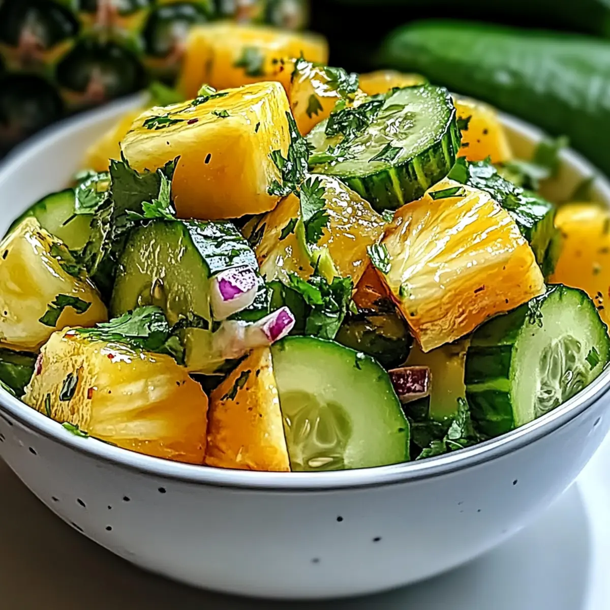As I stood in my kitchen, the scent of summer wafted through the air, whispering promises of balmy evenings and vibrant gatherings. That’s when I decided to whip up a refreshing Pineapple Cucumber Salad, a dish that feels like a tropical getaway in every bite. With its juicy pineapple, crunchy cucumber, and a hint of zesty chili-lime dressing, it’s a quick and easy recipe that packs a punch of flavor while keeping things low-calorie. This delightful salad isn’t just a feast for the eyes; it’s perfect for those sunny picnics or after a hearty workout when you’re craving something light but fulfilling. Are you ready to transform your meal with this tropical twist? Why is this Pineapple Cucumber Salad a Must-Try? Vibrant Flavors: With sweet pineapple and crisp cucumber, this salad bursts with tropical goodness that brightens your day. Quick and Easy: It takes just minutes to prepare, making it the perfect option for busy lifestyles. Health-Conscious: At around 150 calories per serving, it’s a guilt-free delight that fits perfectly into any diet. Adaptable: Feel free to customize with mango, avocado, or your choice of herbs for a personal touch, just like in our Pesto Pasta Salad. Crowd-Pleaser: Serve it at barbecues, parties, or family gatherings, and watch it disappear quickly! Pineapple Cucumber Salad Ingredients For the Salad Fresh Pineapple – Provides natural sweetness and tropical flavor. Optional: Canned pineapple in juice for convenience. Cucumber – Adds a refreshing crunch and hydration. Substitution: Zucchini for a different flavor profile. Red Onion – Contributes a mild sharpness that balances sweetness. Substitute: Green onions for a milder taste. For the Dressing Chili Powder – Adds heat and a hint of smokiness. Optionally use cayenne for more spice. Lime Juice – Provides acidity that brightens flavors. Substitution: Lemon juice if lime is unavailable. Honey or Maple Syrup – Enhances overall sweetness. Use maple syrup for a vegan version. Salt – Balances and enhances flavors. For the Finishing Touch Fresh Cilantro or Mint – Adds a fragrant herbal finish. Omit if not preferred or replace with parsley. Step‑by‑Step Instructions for Pineapple Cucumber Salad Step 1: Combine Ingredients In a large mixing bowl, carefully combine diced fresh pineapple, crisp cucumber slices, and finely sliced red onion. Gently stir to ensure even distribution of the ingredients, bringing together the sweetness of the pineapple and the crunchiness of the cucumber. Aim for a vibrant mix that looks colorful and appetizing, setting the stage for our delicious Pineapple Cucumber Salad. Step 2: Prepare Dressing In a separate small bowl, whisk together chili powder, freshly squeezed lime juice, honey (or maple syrup), and a pinch of salt until the mixture is smooth and well combined. The dressing should have a bright and tangy aroma that elevates the salad. Make sure to taste and adjust the sweetness or spice level according to your preference to create a zesty flavor that complements the salad perfectly. Step 3: Dress the Salad Pour the prepared dressing over the pineapple, cucumber, and onion mixture in the large bowl. Using a pair of salad tongs, gently toss the salad to coat all ingredients evenly with the dressing, ensuring that each bite is bursting with flavor. The vibrant colors should meld beautifully, enhancing the overall visual appeal of your Pineapple Cucumber Salad. Step 4: Rest the Salad Allow the dressed salad to sit at room temperature for about 10–15 minutes. This resting period lets the flavors meld together and become more pronounced, creating that sought-after delightful harmony. During this time, you can prepare any additional garnishes or get ready for serving, knowing that your salad will only taste better with a little time. Step 5: Garnish Just before serving, take a handful of freshly chopped cilantro or mint and sprinkle it over the salad for aroma and a burst of herbal freshness. This final touch adds an enticing scent and a pop of green that brightens up your Pineapple Cucumber Salad, making it not only delicious but visually appealing for any gathering or picnic. How to Store and Freeze Pineapple Cucumber Salad Fridge: Store leftovers in an airtight container for up to 1 day. The salad may become soggy as it sits, so enjoy it fresh for the best taste! Make Ahead: You can prep the diced pineapple and sliced cucumber up to 24 hours ahead. Keep them in separate airtight containers until you’re ready to combine with the dressing. Freezer: It’s not recommended to freeze Pineapple Cucumber Salad due to the high water content in fresh vegetables. Freezing may alter the texture once thawed. Reheating: This salad is best served cold or at room temperature, so no reheating is needed! Just give it a gentle mix before serving. Make Ahead Options These Pineapple Cucumber Salad components are perfect for meal prep, allowing you to enjoy this refreshing dish with minimal fuss. You can chop the fresh pineapple and cucumber up to 24 hours in advance and store them separately in airtight containers in the refrigerator to maintain their crispness. The red onion can also be sliced ahead of time. However, it’s best to prepare the zesty chili-lime dressing and dress the salad just before serving to keep the ingredients fresh and vibrant. This way, you’ll have a quick and easy dish ready to enjoy just when you need it, saving you time on busy weeknights! Expert Tips for Pineapple Cucumber Salad Use Ripe Pineapple: Choose a ripe pineapple for maximum sweetness and flavor; it should smell fragrant and yield slightly to pressure. Chill Ingredients: For an even more refreshing salad, chill your pineapple and cucumber slices before mixing. This enhances the cooling effect. Adjust Spice Level: If you’re unsure about the heat, start with less chili powder and adjust to your taste to avoid overwhelming the tropical flavors. Experiment with Herbs: Fresh cilantro or m