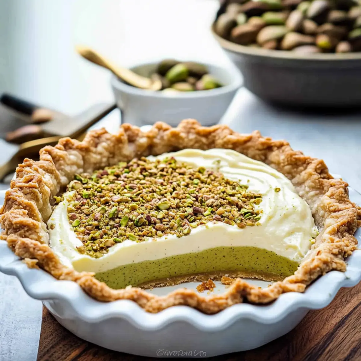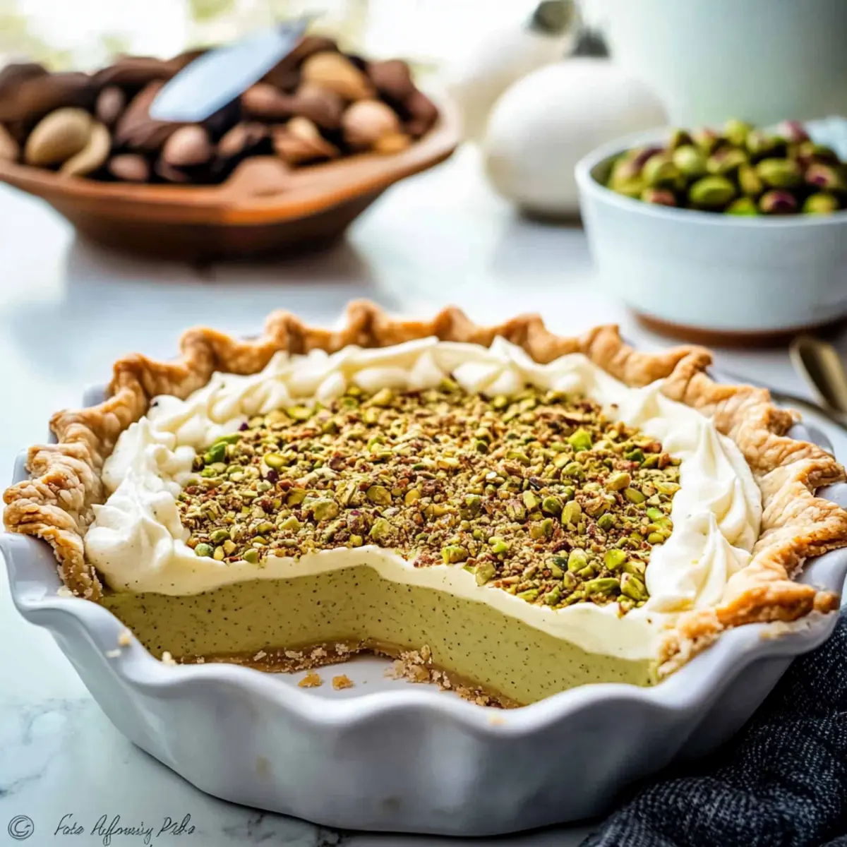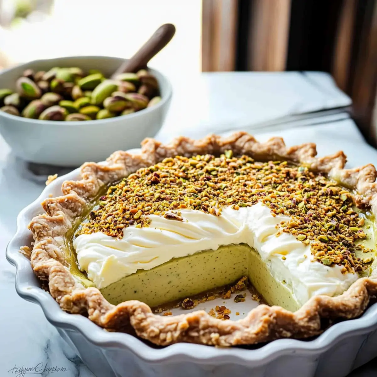 The sweet aroma of freshly baked custard pie wafted through the air, immediately transporting me to a cozy holiday gathering where laughter and joy intersected. This Creamy Pistachio Custard Pie is a standout dessert that effortlessly elevates any occasion. Picture a buttery, nutty crust cradling a sumptuous filling made with velvety cream cheese, rich eggs, and the delightful crunch of lightly salted pistachios. Not only is this pie a true crowd-pleaser, but it also requires minimal prep time, making it perfect for those busy holiday seasons. If you’ve been searching for a creamy dessert that will wow your guests, look no further! So, ready to discover how this delightful slice of heaven comes together? Why is this pie a must-try? Creamy, Irresistible Flavor: Each bite of this Pistachio Custard Pie transports you to dessert heaven, with its lush filling harmoniously blending sweetness and nutty richness. Effortless Elegance: Impress your guests without spending hours in the kitchen; this recipe is as simple to prepare as it is delightful to serve. Versatile Variations: Feel free to experiment by swapping the nuts for your favorites, or even adding a layer of chocolate ganache for an extra treat. Holiday Showstopper: Perfect for festive gatherings, it not only looks stunning on the table but also elicits smiles with every slice shared, much like a comforting Chicken Pot Pie warms the heart. Make-Ahead Convenience: Chilling the pie not only enhances the flavors but allows you to prep ahead, giving you more time to enjoy the company of loved ones. Pistachio Custard Pie Ingredients For the Crust • All-Purpose Flour – Provides structure to the crust; substitute with gluten-free flour for a gluten-free version. • Salt – Enhances flavor; use sea salt for a gourmet touch. • Granulated Sugar – Sweetens the crust; brown sugar can add a molasses-like flavor. • Cold Salted Butter – Creates a flaky, tender crust; for a non-dairy option, use coconut oil or vegan butter. • Finely Chopped Pistachios – Adds flavor and texture to the crust; can be substituted with finely chopped almonds for variation. • Ice Water – Binds the dough together; ensure it’s very cold to maintain dough texture. For the Filling • Lightly Salted Roasted Pistachios – Main flavor component of the filling; unsalted pistachios can be used, just adjust added salt accordingly. • Cream Cheese – Provides creaminess and body to the filling; for a lighter alternative, use whipped ricotta. • Large Eggs – Acts as a thickening agent for the custard; for a vegan alternative, use flax eggs or a commercial egg replacer. • Vanilla Extract – Adds depth of flavor; choose pure vanilla extract for the best quality. • Almond Extract – Enhances the nutty flavor profile; can be omitted or replaced with additional vanilla. • Whole Milk – Contributes creaminess; substitute with almond milk or coconut milk for a dairy-free version. For Topping • Whipped Cream – Adds an elegant finish; for a lighter option, use coconut whipped cream. Ready to create your own delightful Pistachio Custard Pie? Let these fresh ingredients be the stars of your next festive gathering! Step‑by‑Step Instructions for Pistachio Custard Pie Step 1: Prepare the Crust In a large mixing bowl, combine all-purpose flour, salt, and granulated sugar. Cut in cold salted butter using a pastry cutter or your fingers until the mixture resembles pea-sized crumbs. Stir in finely chopped pistachios, then slowly drizzle in ice water, mixing until the dough forms. Shape it into a disk, wrap in plastic, and chill in the refrigerator for 30 minutes. Step 2: Make the Filling While the crust chills, prepare the creamy filling for your Pistachio Custard Pie. In a food processor, blend lightly salted roasted pistachios with half of the sugar until finely ground. In a separate bowl, beat cream cheese and the remaining sugar until smooth. Gradually add large eggs, one at a time, mixing well after each addition, followed by vanilla and almond extracts, and whole milk until fully incorporated. Step 3: Assemble the Pie Preheat your oven to 350°F (175°C). On a lightly floured surface, roll out the chilled dough into a 9-inch pie dish, ensuring an even thickness. Crimp the edges neatly and pour the prepared filling into the crust, smoothing the top. Make sure to pour gently to avoid bubbles, which will help achieve a creamy finish for your Pistachio Custard Pie. Step 4: Bake the Pie Carefully place the pie in the preheated oven and bake for 45-55 minutes. The edges should be set while the center remains slightly jiggly when you gently shake the pie. This visual cue indicates the custard is perfectly baked, providing the ideal creamy texture. Step 5: Cool & Serve Once baked, remove the pie from the oven and let it cool completely on a wire rack. After cooling, refrigerate your Pistachio Custard Pie for at least 3 hours, allowing the flavors to meld beautifully. Serve chilled, topped with a dollop of whipped cream and a sprinkle of finely chopped pistachios for an elegant finish. How to Store and Freeze Pistachio Custard Pie Fridge: Store your Pistachio Custard Pie covered in the refrigerator for up to 3 days. This helps maintain its creamy texture and flavor. Freezer: Avoid freezing the pie after baking, as this can alter the texture of the custard. Covering: If you need to store leftovers, ensure they are well-covered with plastic wrap or in an airtight container to prevent drying out. Reheating: Serve the pie chilled or at room temperature; avoid reheating as it can change the custard’s creamy consistency. Expert Tips for Pistachio Custard Pie Avoid Dough Overworking: Handle your pie crust gently; overworking the dough can lead to a tough texture instead of the desired flaky crust. Chill Properly: Ensure your crust chills for at least 30 minutes. This step is crucial for achieving the right flakiness in your Pistachio Custard Pie. Visual Doneness 