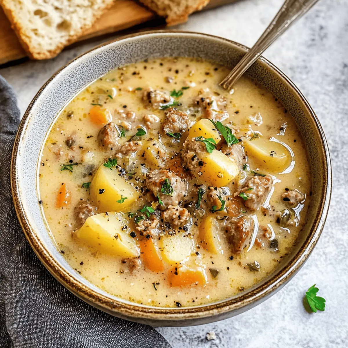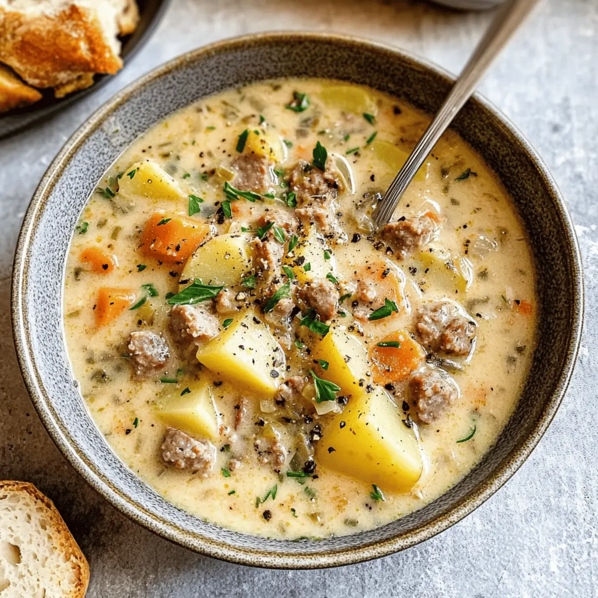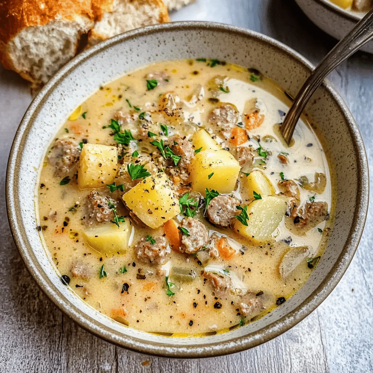 Rain drizzles outside, and all I crave is a cozy hug in a bowl. That’s where my creamy potato and sausage chowder comes in—a warm, delightful twist on traditional chowders. Imagine hearty chunks of tender potatoes swirled with the savory goodness of sausage, making it the ultimate comfort food. This family-friendly recipe not only warms the heart but also offers a quick prep time, so you can spend less time cooking and more time enjoying golden moments around the table. Whether you’re looking for a satisfying weeknight dinner or something to impress your guests, this chowder is sure to deliver. Are you ready to create a comforting masterpiece that’s as easy as it is delicious? Let’s dive into this creamy bowl of happiness together! Why is this chowder a must-try? Comforting Warmth: There’s nothing quite like a bowl of creamy chowder on a chilly night to provide instant comfort. Hearty Ingredients: With tender potatoes and flavorful sausage, this dish is a filling meal perfect for the whole family. Easy Prep: The simple steps make it accessible for cooks of all levels, letting you whip it up without hassle. Crowd-Pleasing Flavor: This chowder is an impressive way to bring people together, perfect for gatherings or casual dinners. Versatile Enjoyment: Pair it with homemade bread or Garlic Mashed Potatoes for a complete comfort experience. Time for some cozy cooking—get ready to savor every delicious spoonful! Potato and Sausage Chowder Ingredients For the Base • Olive Oil – Base for sautéing vegetables; can be substituted with canola or vegetable oil. • Onions (1, chopped) – Adds depth and sweetness; shallots make a milder alternative. • Celery (2 stalks, sliced) – Contributes crunch and aroma; leeks provide a subtler flavor. • Carrots (2, sliced) – Ensures sweetness and vibrant color; any root veggie can fit in. • Garlic (2 cloves, minced) – Boosts the overall flavor; garlic powder works as a quick substitute. For the Chowder • Sausages (400g / 6 sausages) – The heart of the dish, offering rich protein; feel free to choose any flavor. • Dried Thyme (1/2 tsp) – Fills the chowder with herbal charm; fresh thyme (1 tsp) gives a fresher punch. • All-Purpose Flour (3 tbsp) – Helps thicken the chowder; swap for corn flour for a gluten-free option. • Chicken or Vegetable Stock (1 liter / 4 cups) – Acts as the liquid foundation; homemade or store-bought both work well. • Bay Leaves (2) – Infuses aromatic flavor; remember to remove before serving. • Wild Rice (100g / 1/2 cup) – Adds great texture; brown rice or pearl barley can suit your needs. • Potatoes (3, medium, peeled and cut into chunks) – Key ingredient for warmth and comfort; Russet or Maris Piper are ideal. • Single/Light Cream or Half and Half (375ml / 1 1/2 cups) – Ensures creaminess; plant-based cream offers a dairy-free twist. Final Touches • Salt and Pepper – To taste; adjusting these can elevate the overall flavor dramatically. Embrace the riches of this Potato and Sausage Chowder as you gather your ingredients and prepare to cook up a delightful bowl of comfort! Step‑by‑Step Instructions for Potato and Sausage Chowder Step 1: Heat the Oil In a large soup pot, warm 2 tablespoons of olive oil over medium heat until shimmering, about 1-2 minutes. This oil will serve as the base for our delicious Potato and Sausage Chowder. Keep an eye on it; you want it hot enough to sauté but not smoking. Step 2: Cook the Sausage Remove the sausage from its casing and break it into bite-sized pieces. Add the sausage to the hot oil in the pot and cook until it’s browned and crispy, about 5-7 minutes. Use a wooden spoon to stir occasionally, ensuring it cooks evenly. Once done, transfer the sausage to a plate and set aside. Step 3: Sauté the Vegetables In the same pot, add the chopped onion, sliced celery, and carrots. Sauté the mixture for about 10 minutes until the vegetables soften and the onions become translucent. Stir occasionally to ensure even cooking and to prevent anything from sticking to the bottom of the pot. Step 4: Add Garlic and Thyme Once the veggies are tender, add the minced garlic and dried thyme to the pot. Cook for an additional 30 seconds, stirring constantly until fragrant, and the garlic is golden but not burnt. This aromatic foundation will enhance the flavor of your Potato and Sausage Chowder beautifully. Step 5: Make the Roux Sprinkle 3 tablespoons of all-purpose flour over the sautéed vegetables, stirring well to combine. Cook for about 2 minutes, allowing the flour to absorb moisture and create a roux. This step ensures your chowder will be thick and creamy once the liquids are added. Step 6: Add Stock and Rice Gradually pour in 1 liter of chicken or vegetable stock, stirring continuously to avoid lumps. Bring the mixture to a gentle simmer, then add the bay leaves and 100g of wild rice. Let it simmer for about 30 minutes, stirring occasionally, until the rice is tender and the flavors meld beautifully. Step 7: Cook the Potatoes Next, add the cubed potatoes to the pot and continue to simmer for another 15 minutes, stirring occasionally. You’ll know it’s ready once the potatoes are fork-tender, and the chowder has thickened, presenting that inviting creamy texture you crave in your Potato and Sausage Chowder. Step 8: Finish with Cream and Seasoning Stir in 375ml of single cream or half-and-half, mixing well to combine. Taste your chowder, then season with salt and pepper according to your preference. Allow the chowder to warm through for an additional 5 minutes, but do not boil it after adding the cream. Step 9: Serve and Garnish Remove the bay leaves before serving. Ladle the warm Potato and Sausage Chowder into bowls, garnishing with freshly chopped parsley for a pop of color and freshness. Serve immediately with your favorite homemade bread or crusty rolls for a complete cozy experience. Storage Tips for Potato and Sausage Chowder Fridge