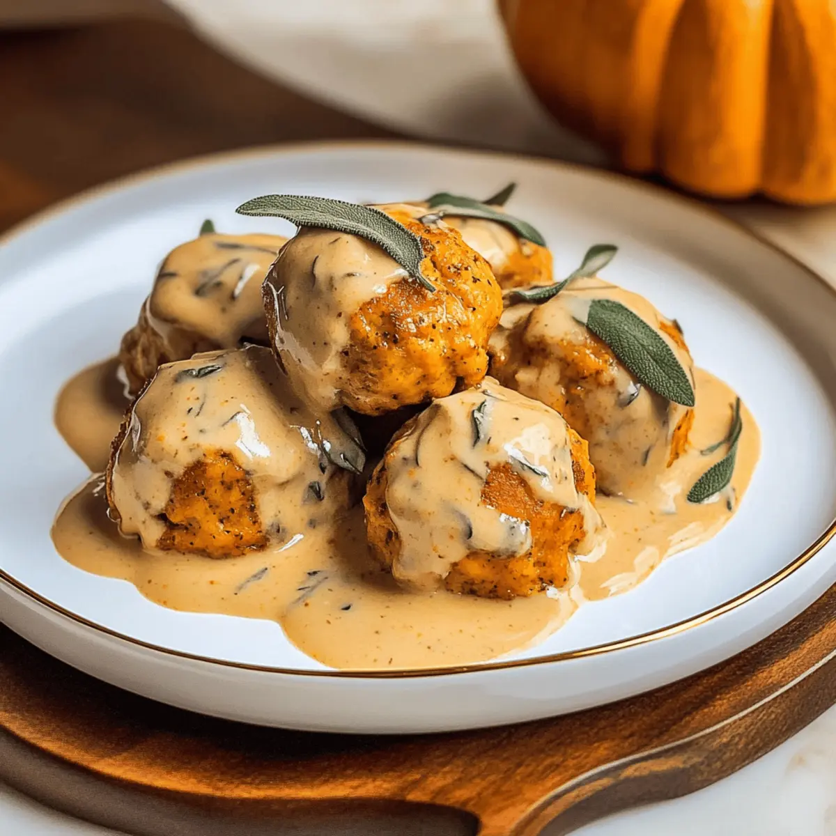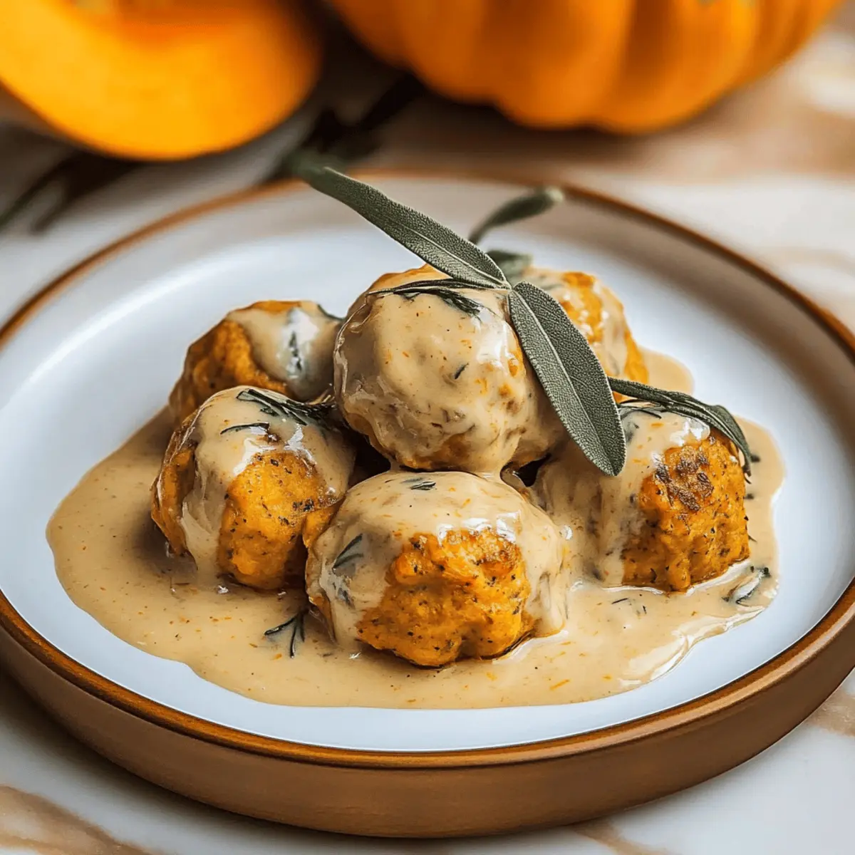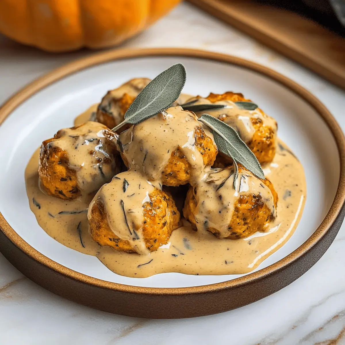 As I strolled through my local farmer’s market, the vibrant colors of autumn caught my eye, and suddenly I felt inspired to create a warm, inviting dish. Enter my Pumpkin Chicken Meatballs in Sage Cream Sauce! This recipe is not just about celebrating seasonal flavors; it offers an easy way to bring comfort food back into your weeknight rotation. Moist and juicy from the pumpkin purée, these meatballs are enveloped in a creamy sage sauce that adds a touch of elegance without the fuss. Moreover, they’re versatile enough to suit any dietary preference, with a dairy-free option available. Ready to impress your loved ones yet simple enough for a busy evening, this dish is bound to become a favorite at your table. Can you smell the cozy spices yet? Let’s dive into this culinary delight! Why Are These Meatballs So Irresistible? Juicy, Flavor-Packed Meatballs: Each bite is a burst of autumn flavors, with moist pumpkin purée bringing a unique twist to traditional meatballs. Creamy Sage Sauce: The rich sage cream sauce elevates the dish, creating a cozy, restaurant-quality experience right at home. Versatile Ingredients: You can easily swap out ground chicken for turkey or even beef, making this recipe adaptable to your pantry staples. Dairy-Free Option: Don’t miss out! A simple substitute for heavy cream gives everyone a chance to enjoy this comforting meal. Quick and Easy: This recipe is perfect for weeknights, ready in under 30 minutes without sacrificing flavor. Crowd-Pleasing Comfort Food: These pumpkin chicken meatballs are sure to impress family and friends, making them perfect for gatherings or cozy dinners. Try pairing them with a fresh salad or pasta for a well-rounded meal—it’s comfort food done right! Pumpkin Chicken Meatballs Ingredients • To make these delightful Pumpkin Chicken Meatballs, gather the following ingredients for a recipe that’s not only comforting but bursting with flavor! For the Meatballs Ground Chicken – Provides the main protein; substitute with ground turkey for a leaner option. Canned Pumpkin Purée – Adds moisture and starch, helping meatballs stay juicy; no substitute recommended. Plain Breadcrumbs – Acts as a binder and is essential for structure; gluten-free breadcrumbs work for a gluten-free version. Egg – Binds the ingredients together; no substitution needed for binding purposes. Garlic Clove (finely grated) – Adds depth of flavor; always use fresh garlic for the best results. Onion Powder – Delivers subtle onion flavor without the texture; fresh onion can be used but may alter consistency. Salt & Black Pepper – Essential seasonings; adjust to taste for your ideal flavor profile. For the Sauce Olive Oil – Used for pan-frying; can be substituted with vegetable oil if desired. Butter – Enhances the richness of the sauce; switch to dairy-free butter for a dairy-free option. Fresh Sage – Imparts an aromatic herby flavor; dried sage can work in a pinch, but fresh is preferred for depth. Heavy Cream – Enriches the sauce’s texture; use a dairy-free cream alternative for a dairy-free version. Nutmeg (optional) – Elevates the sauce’s flavor; can be omitted if you’re not a fan. These Pumpkin Chicken Meatballs in Sage Cream Sauce are sure to warm hearts and bellies alike! Step‑by‑Step Instructions for Pumpkin Chicken Meatballs in Sage Cream Sauce Step 1: Prepare the Meatball Mixture In a large mixing bowl, combine ground chicken, pumpkin purée, breadcrumbs, egg, finely grated garlic, onion powder, salt, and black pepper. Use your hands to gently mix until just combined—be careful not to overwork the mixture to ensure tender meatballs. Set aside your mixture for a moment while you prepare to shape the meatballs. Step 2: Shape the Meatballs Using your hands, scoop out about 1.5 tablespoons of the mixture and roll it into a meatball. Repeat this process until all the mixture is formed into approximately 16 meatballs, ensuring they are evenly sized for consistent cooking. Place the meatballs on a plate while you heat your skillet, adding a bit of anticipation to the cooking process! Step 3: Cook the Meatballs Heat 2 tablespoons of olive oil in a nonstick skillet over medium heat. Carefully add the meatballs to the skillet, making sure not to overcrowd them—this allows them to brown beautifully. Cook for 2–3 minutes on each side, until golden brown and cooked through. You may need to do this in batches if your skillet isn’t large enough. Step 4: Prepare the Sauce Base While the meatballs are cooking, grab a separate saucepan. Melt 3 tablespoons of butter over medium heat, then add a minced garlic clove and chopped fresh sage. Stir frequently for about 30 seconds until fragrant, making sure the garlic doesn’t burn—this will infuse your sauce with warmth and depth. Step 5: Create the Cream Sauce Next, slowly stir in 1 cup of heavy cream into the garlic and sage mixture, allowing it to come together. Season the sauce with salt, pepper, and optional nutmeg, stirring gently. Let it simmer on low for about 3–4 minutes until it thickens slightly, creating that rich, creamy sauce to envelop the pumpkin chicken meatballs. Step 6: Combine Meatballs and Sauce Once the meatballs are browned and fully cooked, gently place them into the creamy sage sauce, ensuring they are well coated. Simmer the meatballs in the sauce for an additional 5–7 minutes to meld the flavors, allowing the dish to truly shine. This step ensures every bite of your Pumpkin Chicken Meatballs in Sage Cream Sauce is loaded with delicious flavor. Step 7: Serve and Garnish Now it’s time to serve! Plate your pumpkin chicken meatballs and drizzle them generously with the creamy sage sauce. For a beautiful presentation, garnish with extra chopped sage and a crack of fresh black pepper. The inviting aroma and cozy appearance will have everyone eager to dig into this delightful meal! Pumpkin Chicken Meatballs in Sage Cream Sauce Variations Feel free to