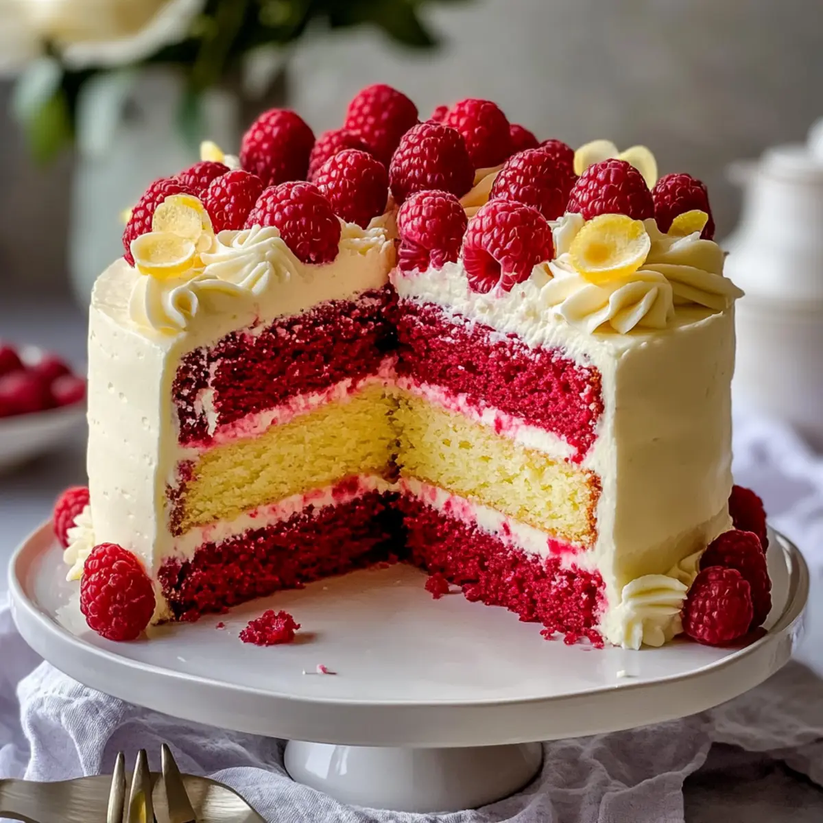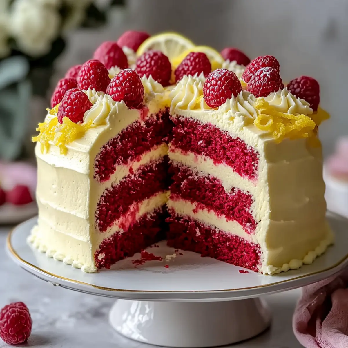 After a long week, there’s nothing quite like the joy of baking to elevate my spirits, especially with this Raspberry Cake with Lemon Buttercream. The vibrant red of the fresh raspberries against a fluffy, moist backdrop offers a tantalizing escape—perfect for those summer days when you crave something sweet yet refreshing. This delightful cake is not only a crowd-pleaser, but it also features gluten-free and vegan-friendly variations to ensure everyone can indulge. Plus, the zesty lemon buttercream adds a smooth, tangy touch that perfectly complements the sweet and tart flavors. Trust me, it will have you daydreaming of picnics and sunny gatherings. Intrigued to whip up this slice of bliss? Let’s dive into the recipe! Why is this Raspberry Cake a must-try? Irresistible Flavor: The harmony of sweet raspberries and zesty lemon creates a tantalizing taste explosion that’s impossible to resist. Versatile Options: With gluten-free and vegan adaptations, everyone can enjoy this delightful treat, no matter their dietary preferences. Easy Preparation: The recipe is approachable for all home bakers, allowing you to create an impressive dessert with minimal fuss. Visual Appeal: Its vibrant colors make it a stunning centerpiece for any gathering, perfect for summer parties or just a cozy afternoon tea. Quick Enjoyment: Whether you’re making it to unwind or sharing it with friends, it comes together swiftly, letting you enjoy your time in the kitchen. If you’re looking for more refreshing recipes, don’t miss out on my Baked Lemon Butter Chicken or Protein Pancakes Healthy. Raspberry Cake With Lemon Buttercream Ingredients For the Cake • All-Purpose Flour – Provides structure to the cake; substitute with rice and tapioca flour for a gluten-free version. • Granulated Sugar – Adds sweetness and aids in browning; no direct substitutions recommended. • Unsalted Butter (2x ½ cup) – Contributes richness and moisture; for vegan, use plant-based butter instead. • Whole Milk – Adds richness; substitute with plant-based milk for a vegan option. • Large Eggs (3) – Gives structure and stability; for vegan, use aquafaba as an egg substitute. • Baking Powder – A leavening agent; no substitutions recommended. • Vanilla Extract – Enhances flavor depth; no substitutions recommended. • Salt (½ teaspoon + pinch) – Balances flavors; no substitutions recommended. • Fresh Raspberries (1 cup) – Adds tartness and moisture to the cake; no substitutions recommended. For the Lemon Buttercream • Powdered Sugar (4 cups) – Sweetens and thickens the buttercream; no direct substitutions recommended. • Lemon Juice (3 tablespoons) – Provides tanginess to the buttercream; no substitutions recommended. • Zest of 1 Lemon – Enhances flavor and aroma; no substitutions recommended. This Raspberry Cake with Lemon Buttercream is not just a dessert; it’s a celebration of flavors, perfect for summer gatherings or cozy afternoons at home. Happy baking! Step‑by‑Step Instructions for Raspberry Cake With Lemon Buttercream Step 1: Preheat and Prepare Pans Begin by preheating your oven to 350°F (175°C). While the oven warms up, grease and flour two 9-inch round cake pans to ensure that your Raspberry Cake releases easily once it’s baked. Make sure to coat the pans evenly for a smooth release. Step 2: Cream Butter and Sugar In a large mixing bowl, cream together softened unsalted butter and granulated sugar using an electric mixer on medium speed for about 3-4 minutes, until the mixture is light and fluffy. This process will incorporate air, which is essential for a light texture in your cake. Step 3: Add Eggs and Vanilla Now, crack in the large eggs one at a time, mixing well after each addition to ensure they are fully incorporated. Add in the vanilla extract to infuse the batter with rich flavor. Continue mixing until the batter is smooth and creamy. Step 4: Combine Dry Ingredients In a separate bowl, sift together all-purpose flour, baking powder, and salt. Gradually add this dry mixture to the butter and sugar mixture, alternating with the whole milk. Mix on low speed until just combined, being careful not to overmix. This will help maintain a tender crumb in your Raspberry Cake. Step 5: Fold in Raspberries Gently fold in the fresh raspberries using a rubber spatula, taking care to avoid breaking them. Their vibrant color and tart flavor are what make this Raspberry Cake so delightful. Ensure they are evenly distributed throughout the batter for a burst of flavor in every bite. Step 6: Bake the Cakes Divide the batter evenly between the prepared cake pans, smoothing the tops with a spatula. Place the pans in the preheated oven and bake for 30-35 minutes. You’ll know they are done when a toothpick inserted into the center comes out clean and the cake springs back when gently pressed. Step 7: Cool the Cakes Once baked, remove the cakes from the oven and let them cool in the pans for about 10 minutes. This resting time allows for easier removal. Then, carefully transfer the cakes to a wire rack to cool completely before frosting. A well-cooled cake allows the lemon buttercream to adhere better. Step 8: Make the Lemon Buttercream While the cakes cool, prepare the lemon buttercream. In a medium bowl, beat softened butter until creamy, about 2 minutes. Gradually add powdered sugar, followed by lemon juice, lemon zest, vanilla extract, and a pinch of salt. Beat until the buttercream is fluffy and well combined, perfect for adorning your Raspberry Cake. Step 9: Frost the Cake Once the cakes have fully cooled, take one layer and place it on a serving platter. Spread a generous layer of lemon buttercream on top; this adds a lovely tart contrast to the sweetness of the cake. Gently place the second layer on top and frost the entire cake with the remaining buttercream for a beautiful finish. Step 10: Garnish and Serve For an optional touch, you can garnish your Raspberry Cake with 