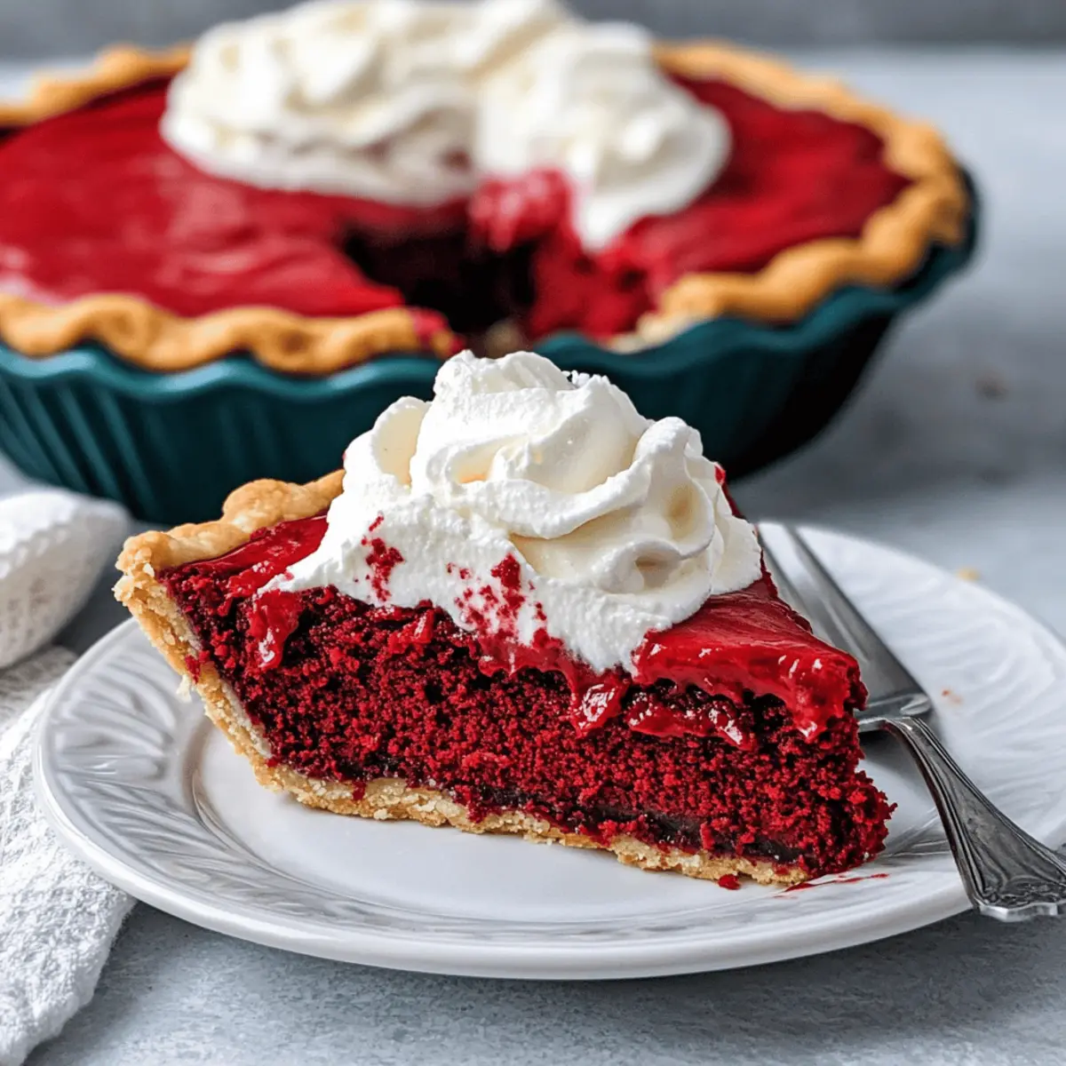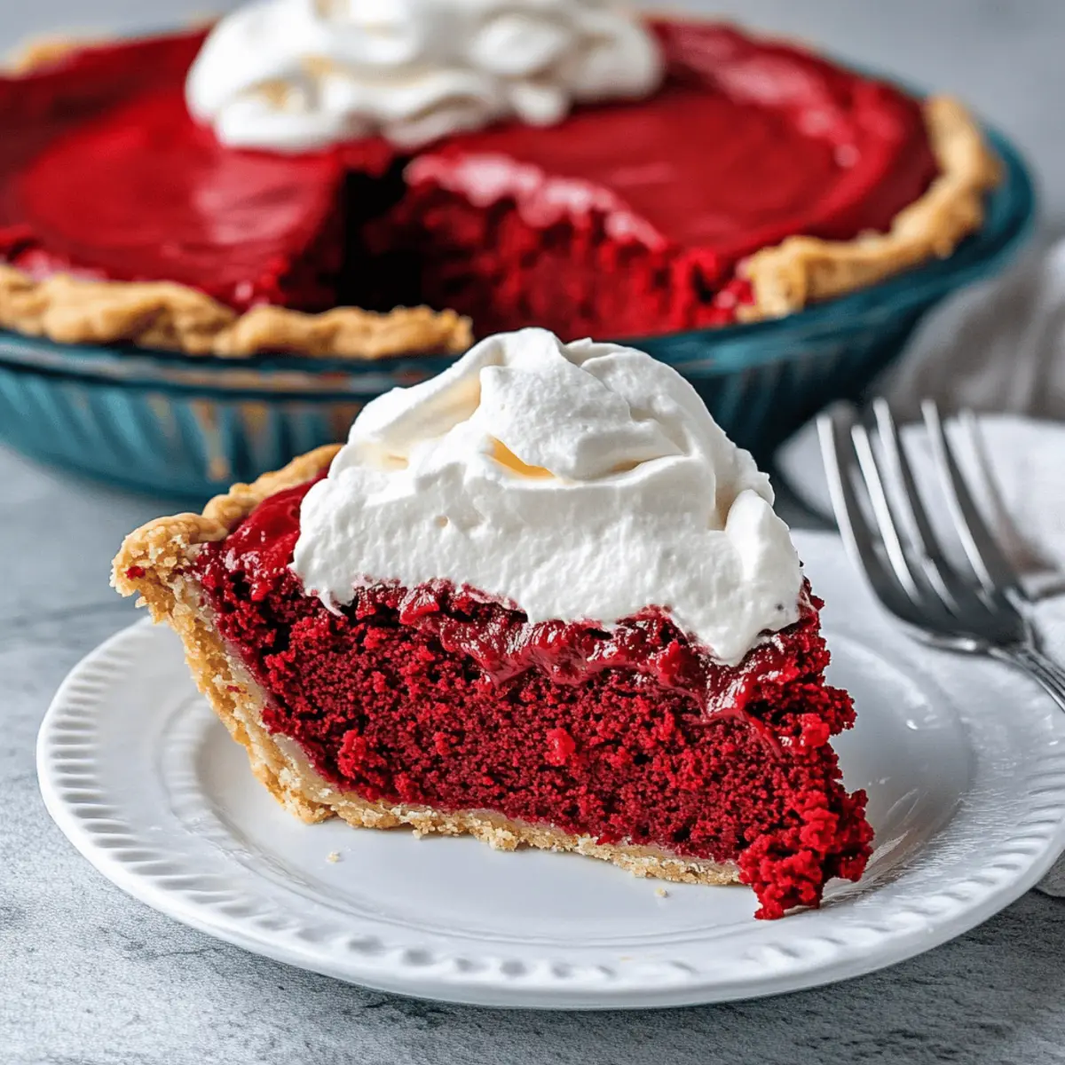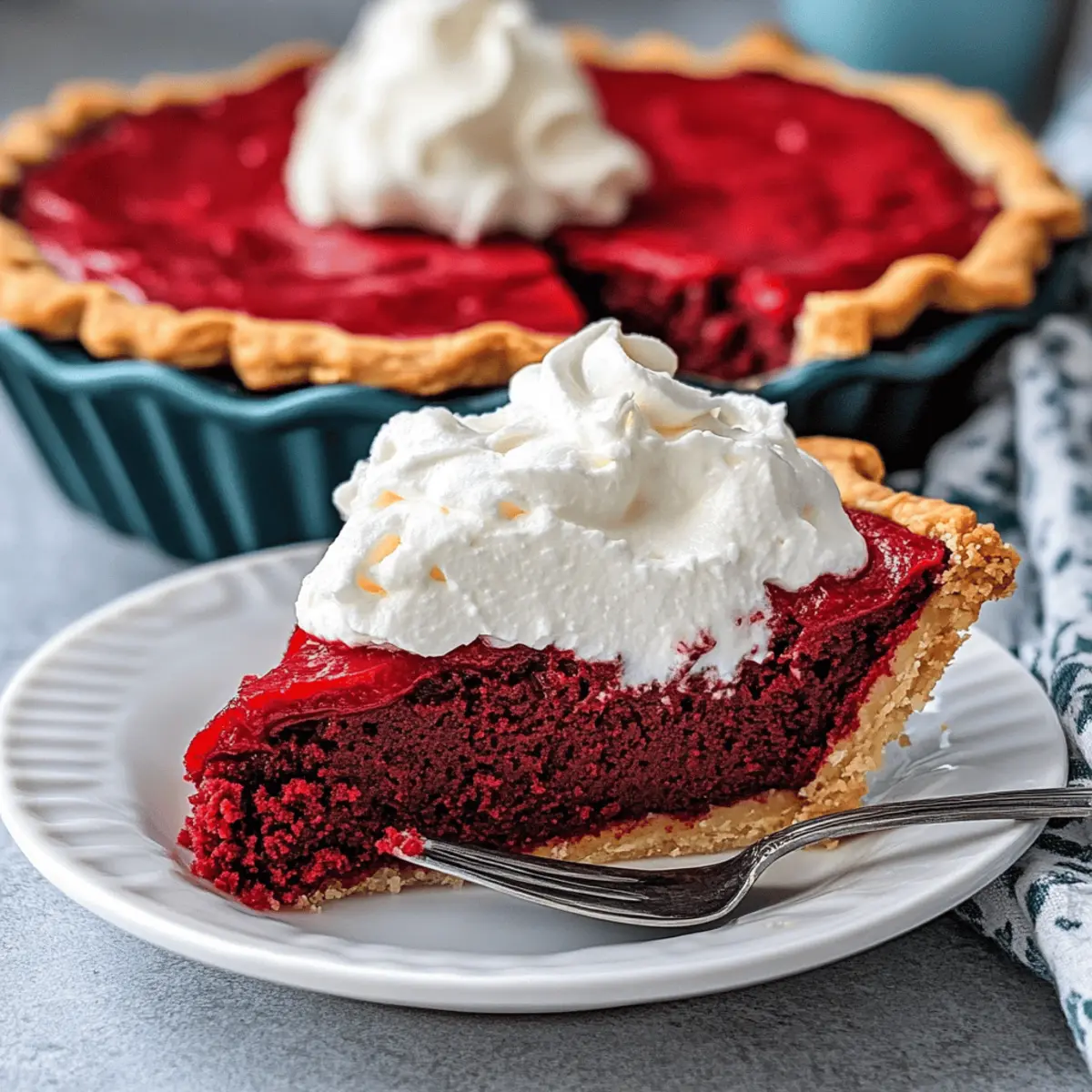 Standing in my kitchen, I suddenly felt the urge to create something extraordinary. Enter the Red Velvet Pie—an innovation that merges the beloved textures of rich red velvet cake with the gooey goodness of a brownie, all wrapped in a flaky pie crust. This dessert is not only a showstopper, but it also comes together quickly, making it perfect for unexpected guests or cozy family gatherings. Whether you adorn it with a luscious cream cheese whipped cream or try a cheeky blue velvet twist, this pie promises to satisfy your sweet cravings and impress everyone at the table. What’s your favorite way to enjoy a slice of pie? Why is Red Velvet Pie So Special? Decadent Fusion: This pie combines the richness of traditional red velvet cake with the gooey texture of a brownie, creating a delightful dessert experience. Versatile Variations: Feel free to switch it up! You can easily make a blue velvet pie by substituting the food coloring. Quick & Easy: With straightforward steps, this pie comes together in no time—perfect for last-minute cravings or when entertaining guests. Crowd-Pleasing Delight: Its vibrant color and indulgent flavors are guaranteed to impress everyone at the table, making it a great choice for festive gatherings. Looking for more sweet inspiration? Check out my recipe for a luscious Lemon Velvet Cake to delight your friends and family! Red Velvet Pie Ingredients For the Filling • Unsalted Butter – Adds fat for richness and moisture. Substitute with margarine if preferred. • Brown Sugar – Provides sweetness and a hint of caramel flavor. Can use white granulated sugar for a lighter sweetness. • Eggs – Binds the ingredients and adds moisture. Use flax eggs for a vegan option. • Vanilla Extract – Enhances overall flavor. Can substitute with almond extract for a different twist. • Baking Powder – Provides leavening for a fluffy texture. Ensure it’s fresh for best results. • Unsweetened Cocoa Powder – Contributes the chocolate flavor typical of red velvet. No substitute recommended for flavor integrity. • Salt – Enhances the sweetness and overall flavor. Essential for balancing the taste. • All-Purpose Flour – Forms the base of the pie filling. Gluten-free flour can be used for a gluten-free version. • White Vinegar – Helps with texture and adds a slight tang. Can substitute with lemon juice. • Red Food Coloring – Gives the distinctive red color. Omit for a vanilla pie, or substitute with blue food coloring for a blue velvet pie. • Pie Crust – Provides structure. Use a pre-made crust for convenience or make from scratch. For the Cream Cheese Whipped Cream • Cream Cheese – Adds creaminess to the whipped cream. Use mascarpone for a different flavor. • Granulated Sugar – Sweetens the cream cheese. Adjust to taste depending on your sweetness preference. • Heavy Whipping Cream – Creates a light and airy texture for the whipped cream. Can substitute with a non-dairy whip for vegan needs. Embrace the joy of baking with this Red Velvet Pie that strikes a beautiful balance between the familiar comfort of classic desserts and an exciting new twist! Step‑by‑Step Instructions for Red Velvet Pie Step 1: Preheat the Oven Begin by preheating your oven to 350°F (175°C). This ensures that the oven reaches the perfect temperature for baking your Red Velvet Pie. While the oven heats up, gather your ingredients and equipment, including a mixing bowl, whisk, and measuring cups, to make the process smoother. Step 2: Prepare the Pie Crust Roll out your pie crust to fit a 9-inch pie plate, ensuring it’s even and not too thick. Carefully place the crust in the pie plate and trim any excess hanging over the edges. Chill the crust in the refrigerator while you prepare the pie filling, allowing it to firm up for a better texture. Step 3: Cream the Butter and Sugar In a mixing bowl, cream together the softened unsalted butter and brown sugar until the mixture becomes light and crumbly. This should take about 2-3 minutes of vigorous mixing. The airy texture will help incorporate air into your Red Velvet Pie, creating a delightful lift as it bakes. Step 4: Add Eggs and Flavorings Beat in the eggs, vanilla extract, and baking powder to the creamed butter and sugar mixture. Continue mixing until everything is well combined and smooth, taking care to scrape down the sides of the bowl to incorporate all ingredients. The batter should be glossy and fluffier at this stage. Step 5: Incorporate Dry Ingredients Gradually mix in the unsweetened cocoa powder and all-purpose flour, followed by the white vinegar and red food coloring. Stir until just combined, ensuring there are no dry flour pockets left. The mixture should have a rich, velvety red hue, indicative of your soon-to-be delicious Red Velvet Pie. Step 6: Pour the Batter into the Crust Pour the prepared batter into the chilled pie crust, spreading it evenly with a spatula. To avoid any mess in your oven, place the pie on a cookie sheet to catch any overflow. This step also helps with easy transportation in and out of the oven. Step 7: Bake the Pie Bake your Red Velvet Pie in the preheated oven for 50-60 minutes. You’ll know it’s done when the edges are cracked and the center is puffed but slightly jiggly. This texture is key for that perfect, gooey brownie-like consistency right in the middle. Step 8: Cool the Pie Once baked, remove the pie from the oven and allow it to cool on a wire rack for at least 30 minutes. It might look a little undercooked in the center, but fear not, as it will continue to set as it cools. This cooling period creates the inviting, fudgy texture you’ll love. Step 9: Prepare the Whipped Cream In a separate bowl, beat the softened cream cheese, granulated sugar, and vanilla extract until smooth and well combined. Gradually add the cold heavy whipping cream and continue beating until stiff peaks form, resulting in a light and airy cream perfect for topping your Red V