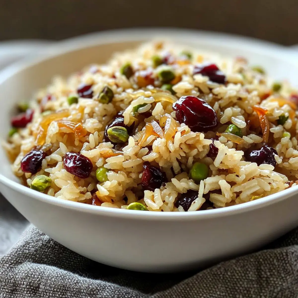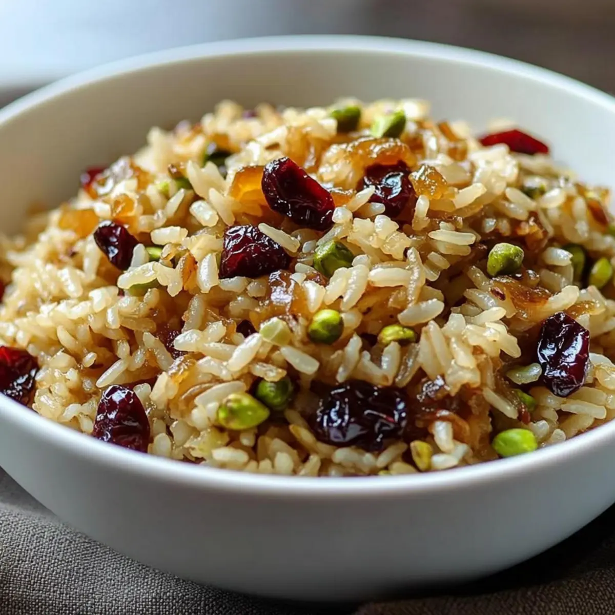 This Rice Pilaf with Caramelized Onion, Orange, Cherry & Pistachio is a delightful blend of flavors, perfect for any dinner occasion.
