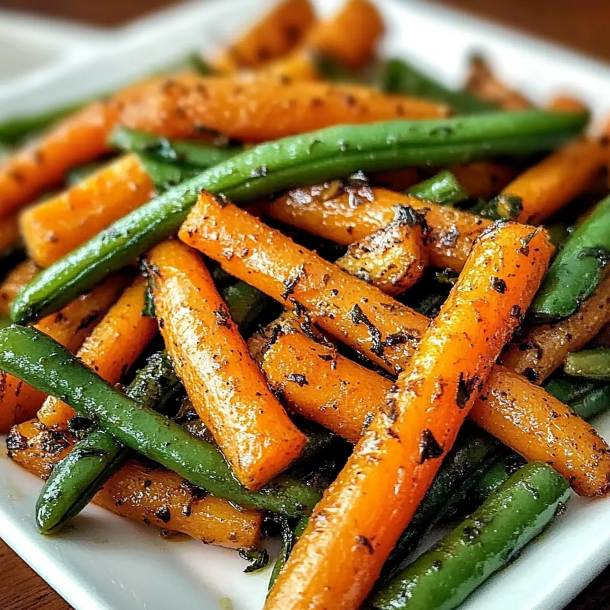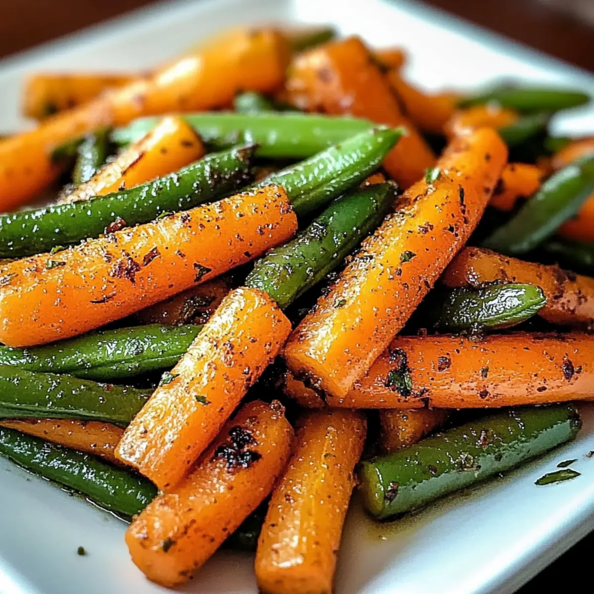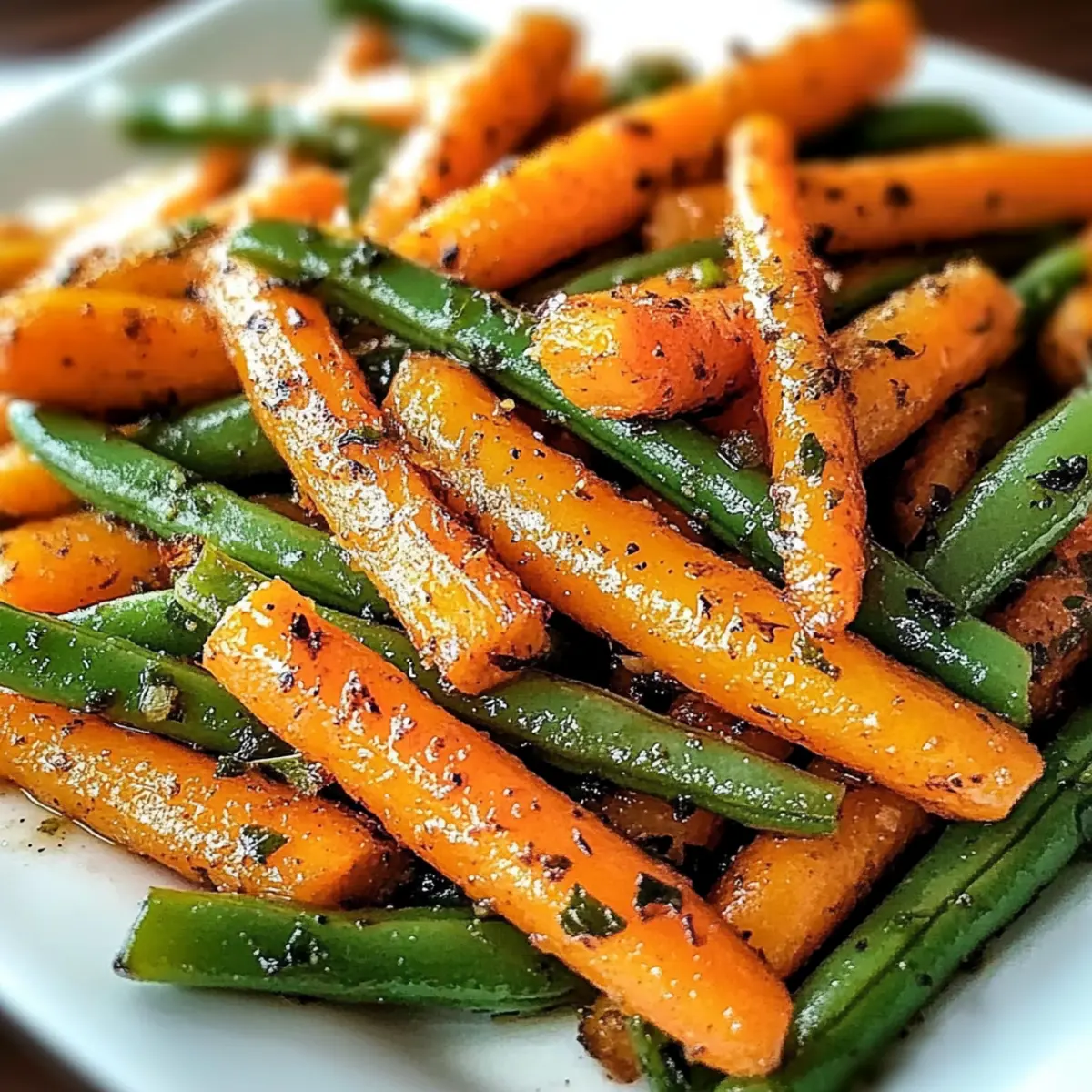 As the warmth of the late afternoon sun streams through my kitchen window, the rich aroma of roasted vegetables fills the air. Today, I’m excited to share my recipe for Oven-Roasted Carrots and Green Beans—a vibrant and nutritious side dish that effortlessly elevates any meal. These beautifully caramelized carrots, with their natural sweetness, paired with the crisp freshness of green beans, create a delightful contrast that’s simply too good to resist. Not only is this dish incredibly easy to prepare, but it’s also a fantastic healthy side option that your family and friends will adore. Whether you’re adding a pop of color to your weeknight dinner or impressing guests at a gathering, these roasted vegetables are sure to leave a lasting impression. Got a favorite twist you’d love to try with this recipe? Let’s discover the endless possibilities together! Why are roasted carrots and green beans must-try? Vibrant, delicious dish: This roasted carrots and green beans recipe bursts with color and flavor, transforming simple ingredients into a stunning side that enhances any meal. Healthy goodness: Packed with essential vitamins and nutrients, this dish is not only tasty but also a nutritious option, making it perfect for health-conscious eaters. Easy to make: With straightforward steps and minimal prep time, this recipe is ideal for busy weeknights. Simply toss, roast, and serve! Versatile variations: Feeling adventurous? Try adding a drizzle of balsamic vinegar or a sprinkle of parmesan cheese to create a flavor profile that fits any cuisine! Crowd-pleaser: Perfect for both family dinners and special occasions, this side dish will impress your guests and keep everyone coming back for more. Enjoy with Roasted Chicken Garlic for a delightful pairing! Roasted Carrots Green Beans Ingredients For the Vegetables • Carrots – Core vegetable providing sweetness and color; ensure uniform cutting for even roasting. • Green Beans – Adds crunch and freshness to the dish; trim ends before roasting. For the Seasoning • Olive Oil – Promotes roasting, adding flavor, and helping to caramelize the vegetables; substitute with avocado oil if desired. • Garlic Powder – Enhances flavor without overpowering the natural taste of the vegetables; fresh garlic can also be used for a stronger flavor. • Coarse Salt – Essential for flavor enhancement; it draws out moisture for better caramelization. • Black Pepper – Adds warmth and depth to the flavor profile; ensure it is freshly ground for best results. Step‑by‑Step Instructions for Roasted Carrots Green Beans Step 1: Preheat the Oven Begin by preheating your oven to 425°F (220°C). While the oven warms up, line a baking sheet with parchment paper to prevent sticking and make cleanup a breeze. This high temperature is essential for roasting, as it produces beautifully caramelized edges that enhance the flavors of your roasted carrots and green beans. Step 2: Prepare Your Vegetables Next, peel the carrots, ensuring to remove any skin for a smooth texture. Cut them into uniform sticks, approximately 3 inches long and ½ inch thick, to ensure even cooking. Simultaneously, trim the ends of the green beans, preparing them for roasting. This thorough preparation will lead to a more visually appealing dish. Step 3: Season the Vegetables In a large mixing bowl, combine the carrot sticks and green beans. Drizzle with olive oil, then sprinkle garlic powder, coarse salt, and freshly ground black pepper over the top. Toss everything together until the vegetables are evenly coated in the seasoning, creating a flavorful blend that enhances the overall taste of your roasted carrots and green beans. Step 4: Arrange on Baking Sheet Spread the seasoned carrots and green beans out in a single layer on the prepared baking sheet. Make sure to avoid overcrowding to facilitate proper roasting; a little space allows the hot air to circulate, creating that coveted caramelization. This careful arrangement will lead to perfectly roasted vegetables. Step 5: Roast the Vegetables Place the baking sheet in the preheated oven and roast for 20-25 minutes. Halfway through, give the vegetables a good stir to ensure they cook evenly, allowing all sides to caramelize. You’ll know they’re ready when the carrots are tender and slightly golden, while the green beans maintain a vibrant green and crisp appearance. Step 6: Serve and Enjoy Once your roasted carrots and green beans are caramelized and tender, carefully remove them from the oven. Transfer the vegetables to a serving dish, and serve warm as a delightful and healthy side to your main course. Their inviting aroma and colorful presentation will surely be a hit at your table. Roasted Carrots Green Beans Variations Feel free to get creative and make this recipe your own with these delightful twists! Balsamic Glaze: Drizzle balsamic vinegar in the last five minutes of roasting for a tangy, sweet touch that really uplifts the flavors. Parmesan Add-On: Sprinkle freshly grated parmesan over the hot vegetables after roasting for a creamy, savory richness that will have everyone asking for more. Mediterranean Vibes: Toss in cherry tomatoes and fresh oregano before roasting for a burst of color and vibrant Mediterranean flavors. Asian Inspiration: Enhance with a splash of sesame oil and ginger powder. This change transforms the dish into an enchanting fusion side that packs a punch! Nutty Appeal: Fold in roasted pecans or hazelnuts after cooking. They add a satisfying crunch and nutty flavor that pairs beautifully with the sweetness of the carrots. Spicy Kick: If you love a bit of heat, add a pinch of red pepper flakes before roasting. This subtle spice complements the sweetness of the vegetables perfectly. Cranberry Bliss: For a festive twist, toss in dried cranberries before serving. Their sweetness balances the roasted carrots and green beans, creating a delightful contrast. Herb Infusion: Change up the seasoni