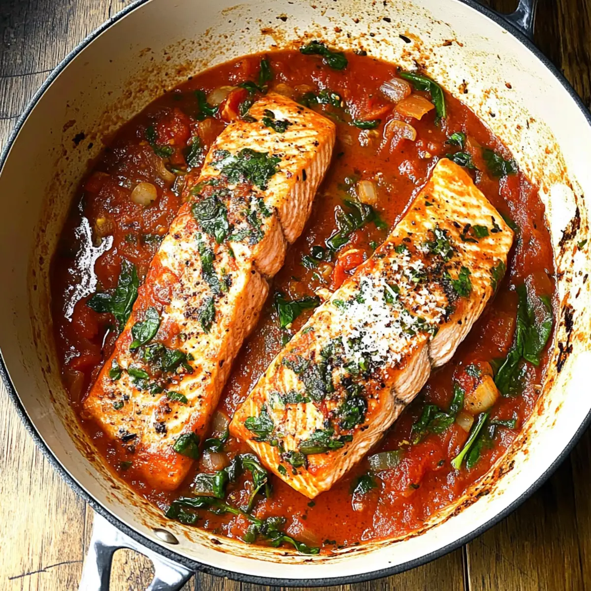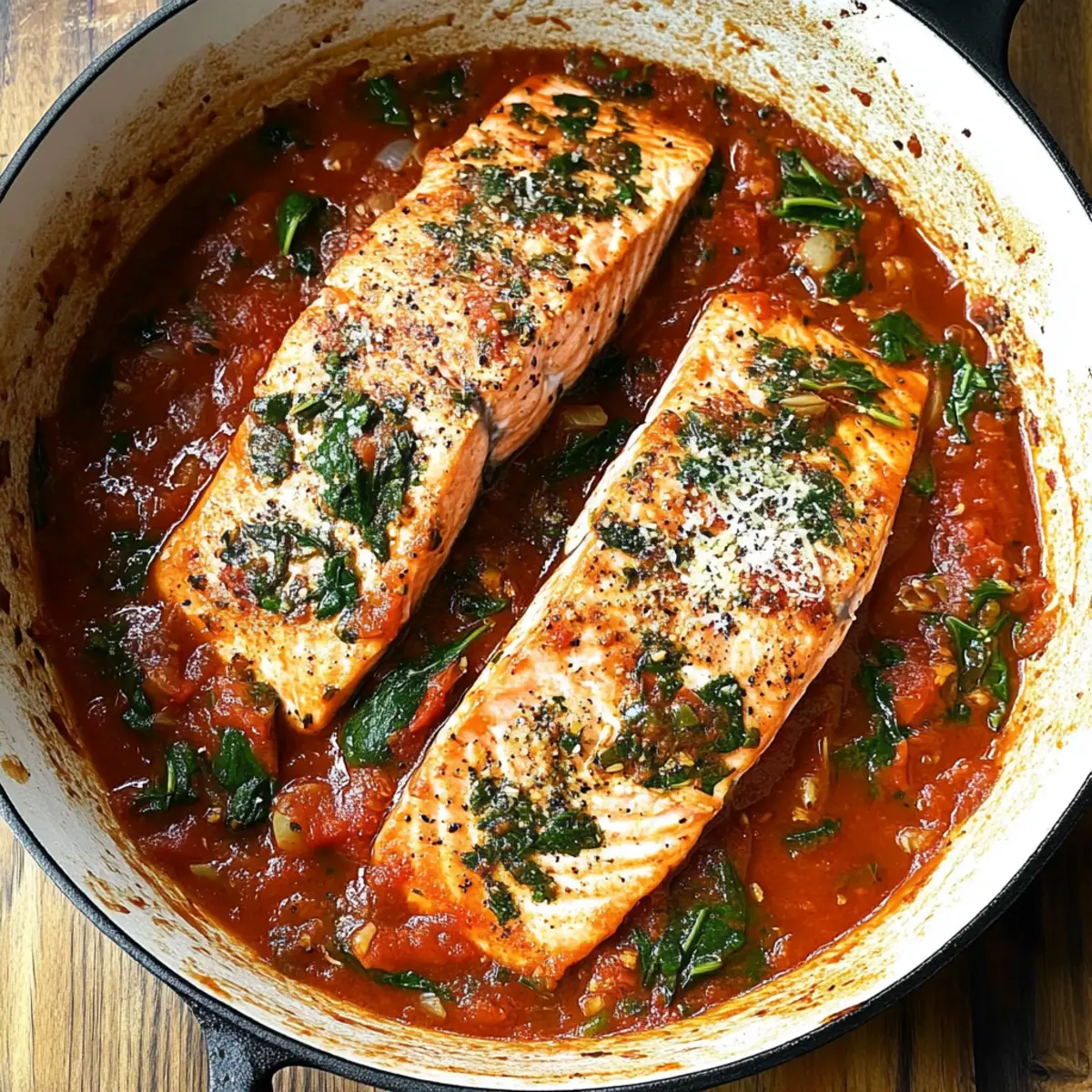 As I stood in my kitchen, the familiar aroma of garlic danced around me and took me back to sun-drenched Italian summers. This One-Skillet Salmon all’Arrabbiata combines the vibrant, spicy punch of traditional arrabbiata sauce with perfectly pan-seared salmon fillets, creating a dish that’s both comforting and exciting. Not only is this recipe a breeze to whip up in just 30 minutes, but it also packs a hearty protein punch, making it ideal for busy weeknights or a last-minute dinner party. The addition of wilted spinach adds a nutritious pop, transforming this meal into a satisfying delight for the senses. Curious how such bold flavors come together in a single pan? Let’s dive in! What makes this recipe a must-try? Quick and Easy: You can whip this up in just 30 minutes, perfect for those hectic weeknights. Bold Flavors: The spicy arrabbiata sauce beautifully complements the rich, flaky salmon, delivering a culinary experience that excites the palate. Healthy Twist: Packed with protein and nutrients from both salmon and spinach, this dish supports a balanced diet without sacrificing taste. One-Skillet Wonder: With minimal cleanup, you can savor the deliciousness without the stress of a messy kitchen. It’s a win-win! Versatile Base: Serve it over pasta or with crusty bread, making it adaptable for any gathering, from family dinners to casual get-togethers. Elevate your meal game today and explore more from my other delicious seafood recipes! Salmon all’Arrabbiata Ingredients • Ready to dive into bold flavors? Here’s what you’ll need! For the Salmon Salmon Fillets – Look for skinless fillets for ease; chicken breasts can be a tasty substitute. Olive Oil – This is your sautéing base; a neutral oil like canola works too. Unsalted Butter – Adds richness to the dish; ghee is a great dairy-free swap. For the Arrabbiata Sauce Garlic Cloves – Fresh garlic enhances flavor; you can use ¼ teaspoon garlic powder in a pinch. Yellow Onion – This aromatic staple sets the base; shallots offer a milder twist. Dried Oregano and Sage – These herbs lend depth; other Italian herbs like thyme work too. Salt – Essential for flavor enhancement; opt for sea salt or kosher salt. Black Pepper – Freshly cracked is best; white pepper delivers a milder flavor. Sweet Paprika – Adds sweetness and color; smoked paprika gives an extra depth. Fresh Chili or Red Chili Flakes – Adjust the heat to your liking; bell pepper provides a milder option. Anchovy Fillet – Adds umami richness; omit for a vegetarian version, or use miso for similar depth. Tomato Paste – Concentrated flavor to the sauce; tomato purée can substitute seamlessly. Crushed Tomatoes – The heart of your arrabbiata; whole peeled tomatoes can be crushed by hand in a pinch. Chicken Broth – A flavorful liquid base; vegetable broth keeps it vegetarian-friendly. For the Finishing Touch Spinach – Packs in nutrients; kale works just as well. Grated Parmesan – The perfect finishing touch for flavor; nutritional yeast is a great dairy-free option. Chopped Parsley – A fresh herb garnish; basil or cilantro can add a different twist. This is your essential ingredient list for crafting a delicious Salmon all’Arrabbiata that’s sure to impress! Step‑by‑Step Instructions for Salmon all’Arrabbiata Step 1: Prep the Ingredients Begin by finely chopping one yellow onion and mincing 3 garlic cloves. In the meantime, season 2 skinless salmon fillets with salt and freshly cracked black pepper on both sides. Having all your ingredients prepped will ensure a smooth cooking flow for your Salmon all’Arrabbiata. Step 2: Sear the Salmon Heat 2 tablespoons of olive oil and 1 tablespoon of unsalted butter in a large nonstick skillet over medium heat. Once the butter is melted and starts to foam, carefully place the seasoned salmon fillets in the skillet. Sear them for about 3-4 minutes on each side until they develop a crispy, golden-brown exterior, then transfer the fillets to a plate and set aside. Step 3: Cook the Aromatics Reduce the heat to low, and add the chopped onion to the same skillet. Sauté for about 2 minutes until the onion becomes translucent and fragrant. Next, stir in the minced garlic and continue to cook for another 30 seconds, ensuring not to burn the garlic, as it will affect the flavor of your arrabbiata sauce. Step 4: Create the Sauce Base To create the rich arrabbiata sauce, stir in one anchovy fillet and finely chopped fresh chili (or ½ teaspoon red chili flakes) along with the remaining salt, black pepper, and 1 teaspoon each of dried oregano and sage. Next, add 2 tablespoons of tomato paste and cook for about 1 minute to deepen the flavors, allowing it to caramelize slightly. Step 5: Simmer the Sauce Pour in 1 cup of chicken broth to deglaze the skillet, scraping up any browned bits that may have stuck to the bottom. Increase the heat to medium and let the mixture simmer for around 2 minutes, allowing the broth to reduce slightly before moving on to the next step. Step 6: Finish the Sauce and Add Spinach Stir in 1 can (14 ounces) of crushed tomatoes into the skillet, then reduce the heat to low and let it simmer for about 5 minutes. Afterward, fold in 2 cups of fresh spinach, cooking until it wilts, which should take around 2 minutes. This will add color and nutrients to your Salmon all’Arrabbiata. Step 7: Combine and Serve Finally, sprinkle in some grated Parmesan cheese, stirring gently until melted and incorporated into the sauce. Return the pan-seared salmon fillets to the skillet and let everything cook together for an additional 3 minutes, ensuring the salmon is heated through. Adjust the sauce’s consistency with more broth if needed, then serve hot, garnished with chopped parsley for a fresh finish. Salmon all’Arrabbiata Variations & Substitutions Feel like experimenting? Let your culinary creativity shine with these delightful twists on this already fantastic dish! Dairy-Free: Substitu