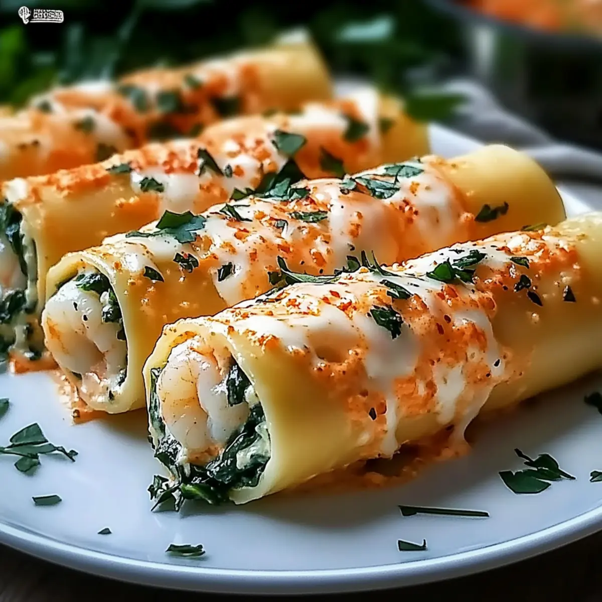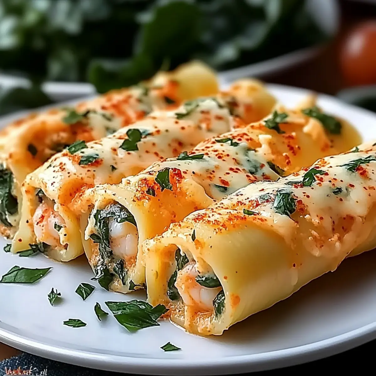 As I stood in my kitchen, the rich aroma of roasted red peppers wafted through the air, instantly transporting me to my favorite Italian bistro. Today, I’m excited to share my recipe for Shrimp & Spinach Stuffed Pasta Rolls with Roasted Red Pepper Cream Sauce—a dish that brings together the comforting allure of homestyle cooking and the elegance of fine dining. With just a few simple ingredients, you can create a high-protein meal that’s not only adaptable for gluten-free and vegetarian diets but also sure to impress family and friends. Perfect for cozy weeknights or special gatherings, this recipe offers the best of both worlds: hearty satisfaction and a touch of gourmet flair. Are you ready to roll into a delicious culinary adventure? Why are these pasta rolls a must-try? Comforting Delight: These Shrimp & Spinach Stuffed Pasta Rolls bring a cozy vibe to your dinner table, perfect for transforming ordinary nights into special occasions. Versatile Options: Whether you’re gluten-free or looking for vegetarian alternatives, you can easily customize this recipe to fit any dietary need. Flavor Explosion: The bold roasted red pepper cream sauce elevates the dish, making each bite savory and satisfying, reminiscent of your favorite Italian bistro. Quick and Easy: Simple preparation steps mean you’ll spend less time in the kitchen and more time enjoying delicious meals with your loved ones. Crowd-Pleasing Appeal: Ideal for gatherings, this dish is sure to impress with its beautiful presentation and rich flavors, making it a hit among family and friends. Pair it with a fresh salad or some delightful Garlic Shrimp Pasta for an unforgettable meal experience! Shrimp & Spinach Stuffed Pasta Rolls Ingredients • Get ready to create a delicious dish! For the Pasta Rolls Lasagna noodles – Provides structure to the dish; substitute with gluten-free sheets if needed. Shrimp – Adds delicate sweetness and protein; pre-cooked shrimp can save time. Fresh spinach – Offers nutrition and vibrant color; thawed frozen spinach also works well. Ricotta cheese – Creates a creamy base; cottage cheese can be a good substitute. Mozzarella cheese – Provides stretch and mild flavor; low-fat mozzarella is a lighter option. Parmesan cheese – Brings a salty umami depth; consider using nutritional yeast for a dairy-free alternative. Egg – Binds the filling together; omit for a vegan option or substitute with a flax egg. For the Sauce Garlic – Infuses flavor into both filling and sauce; adjust the quantity to your taste preference. Roasted red peppers – Acts as the sauce base; jarred versions simplify preparation. Heavy cream – Adds richness to the sauce; you can use half-and-half or a dairy-free cream as a substitute. Chicken broth – Thins the sauce and adds depth; feel free to use vegetable broth for a pescatarian version. Onion – Contributes savory complexity; can be omitted for a milder flavor. Paprika – Enhances the smokiness and color of the sauce; smoked paprika adds an extra layer of flavor. Enjoy the process of making these Shrimp & Spinach Stuffed Pasta Rolls, and savor the delightful flavors! Step‑by‑Step Instructions for Shrimp & Spinach Stuffed Pasta Rolls Step 1: Preheat the Oven Begin by preheating your oven to 350°F (175°C). This ensures that your Shrimp & Spinach Stuffed Pasta Rolls will bake evenly, creating that golden-brown top that is sure to impress. While the oven warms up, gather your ingredients and prepare your baking dish by lightly greasing it with cooking spray or olive oil. Step 2: Cook the Lasagna Noodles Cook the lasagna noodles according to the package instructions until they are al dente, which usually takes around 8-10 minutes. Drain and lay the noodles flat on an oiled baking sheet to prevent sticking. This step is crucial for rolling the pasta without breaking it, so keep them separate while you prepare the filling. Step 3: Make the Filling In a large mixing bowl, combine the chopped shrimp, fresh spinach, ricotta cheese, mozzarella cheese, Parmesan cheese, egg, minced garlic, salt, and pepper. Mix thoroughly until the ingredients are well combined and creamy. This flavorful filling is the heart of your Shrimp & Spinach Stuffed Pasta Rolls, bursting with deliciousness that your family will love. Step 4: Fill the Pasta Rolls Take each lasagna noodle and spoon an appropriate amount of the shrimp filling along one edge. Roll the noodle tightly, ensuring the filling is secure, and place the rolled pasta seam-side down in the greased baking dish. Repeat this process until all noodles are filled, making sure they are nestled closely together for an even bake. Step 5: Prepare the Sauce In a medium saucepan, sauté diced onion and minced garlic over medium heat until the onion is translucent, about 3-4 minutes. Add the roasted red peppers, heavy cream, chicken broth, and paprika. Stir gently and let it simmer for about 5-7 minutes until the sauce thickens slightly and becomes fragrant, creating a comforting layer for your Shrimp & Spinach Stuffed Pasta Rolls. Step 6: Assemble and Bake Spread a thin layer of your roasted red pepper cream sauce at the bottom of the baking dish. Carefully place the filled pasta rolls in a single layer over the sauce, then pour the remaining sauce generously over the top. Bake in the preheated oven for 40 minutes, or until the sauce is bubbly and the tops are golden, indicating a perfect finish. Step 7: Serve and Garnish Once baked, remove the dish from the oven and let it cool for about 5-10 minutes to allow the flavors to meld. Optionally, sprinkle some extra Parmesan cheese and chopped fresh herbs on top for added flavor and presentation. Now, it’s time to serve your beautiful Shrimp & Spinach Stuffed Pasta Rolls, a dish that’s sure to delight everyone at the table. How to Store and Freeze Shrimp & Spinach Stuffed Pasta Rolls Fridge: Refrigerate leftover rolls in an airtight container for up to 3 days. This helps the 
