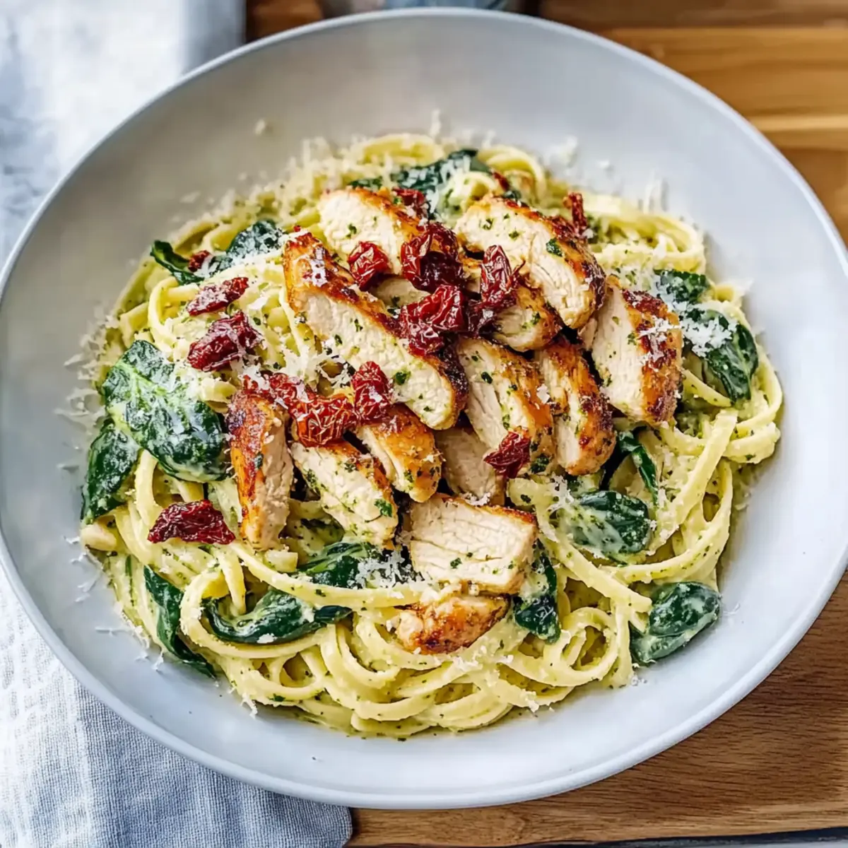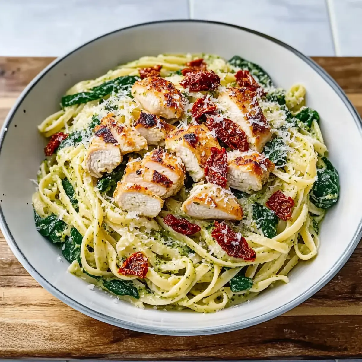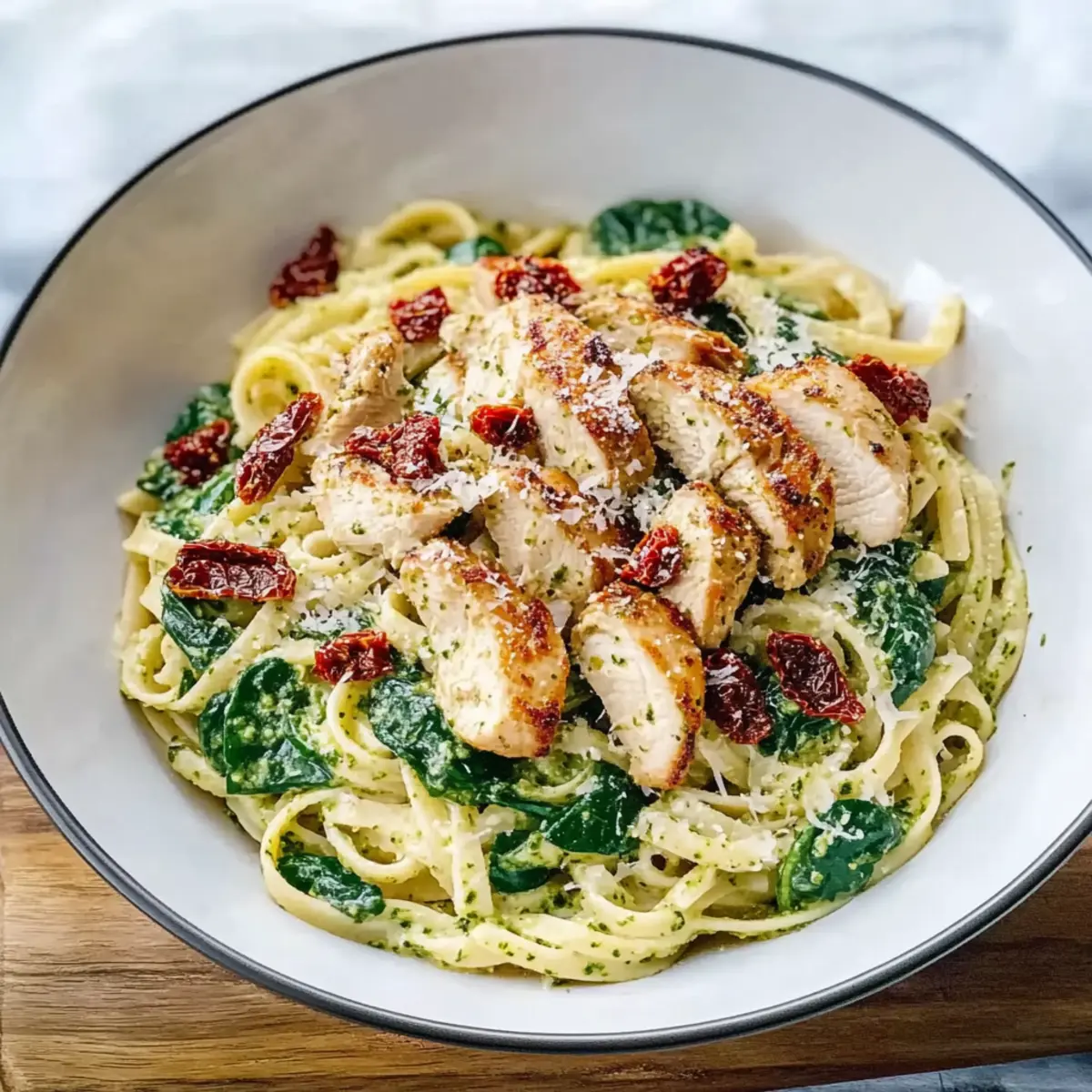 As the aroma of basil pesto wafts through the kitchen, I can’t help but feel a sense of comfort wash over me. In just 30 minutes, you can create an unforgettable meal with this Simple Creamy Chicken Pesto Pasta with Spinach. This recipe is not only a lifesaver for hectic weeknights but is also a total crowd-pleaser for families craving a balance of flavor and nutrition. The tender chicken mingles beautifully with the silky pesto cream sauce, while vibrant spinach and delightful sun-dried tomatoes add just the right touch of color and taste to the dish. Ready to whip up an effortless yet delicious weeknight dinner? Let’s dive into this recipe that will have everyone asking for seconds! Why is this pasta a weeknight winner? Quick Cooking: In just 30 minutes, you can serve an impressive dish, making it ideal for those busy evenings when time is tight. Flavorful and Satisfying: The creamy pesto sauce, combined with tender chicken and sweet sun-dried tomatoes, offers a delightfully balanced meal that your family will adore. Versatile Ingredients: This recipe allows for simple substitutions, whether you choose to swap chicken for turkey or use different pasta shapes, ensuring it fits your pantry. Crowd-Pleaser: With its rich flavors and vibrant colors, this dish will appeal to both kids and adults alike, making it a go-to for family dinners. Easy Prep: With minimal prep and cleanup, you’ll have more time to relax and enjoy dinner together. Plus, find inspiration for your next meal with my delicious Spinach Stuffed Chicken or a comforting Butter Chicken on the side! Simple Creamy Chicken Pesto Pasta Ingredients For the Pasta • Pasta – Any short pasta shape (like penne or rotini) works perfectly as the base. For the Chicken • Chicken Breasts – Pan-sear for flavor; substituting with thinly sliced turkey can lighten the dish. • Garlic Powder – Enhances flavor; fresh minced garlic can add a bolder aroma. • Salt and Pepper – Key seasonings to elevate the overall taste. For the Sauce • Olive Oil – Adds richness to your chicken; avocado oil is a delightful alternative. • Butter – Enriches the sauce for a smooth texture; swap for more olive oil if dairy-free. • All-Purpose Flour – Thickens the sauce beautifully, but cornstarch can be used for gluten-free needs. • Chicken Broth – Adds depth; vegetable broth can work for a vegetarian option. • Heavy Cream – Creates a rich texture without excess heaviness; half-and-half or coconut milk are great substitutes. • Pesto – Brings a fresh, herby note to the dish; don’t hesitate to use store-bought for convenience. • Lemon Juice – Brightens the sauce, with fresh juice making a noticeable difference. • Sun-Dried Tomatoes – Adds sweetness and texture; fresh cherry tomatoes offer a lighter alternative. • Fresh Baby Spinach – Assures color and nutrition; switch to kale or arugula for variety. Topping (optional) • Freshly Grated Parmesan Cheese – Provides a salty, nutty finish, making the dish even more divine. This Simple Creamy Chicken Pesto Pasta with Spinach is sure to become a favorite, combining speed and flavor for your weeknight dinners! Step‑by‑Step Instructions for Simple Creamy Chicken Pesto Pasta with Spinach Step 1: Cook the Pasta Begin by bringing a large pot of salted water to a boil over high heat. Once boiling, add your chosen short pasta and cook until al dente, about 10-12 minutes, or according to package instructions. Just before draining, remember to reserve ½ cup of the pasta water to adjust the sauce later. Drain the pasta and set it aside. Step 2: Sear the Chicken While the pasta cooks, heat a large skillet over medium-high heat and add 1 tablespoon each of olive oil and butter. Season the chicken breasts with garlic powder, salt, and pepper, then add them to the hot skillet. Cook for 5-6 minutes on each side until the chicken is golden brown and reaches an internal temperature of 165°F. Remove from the skillet and let it rest for a few minutes before slicing. Step 3: Prepare the Sauce Base In the same skillet, reduce heat to medium and sprinkle in 2 tablespoons of all-purpose flour. Stir continuously for about 1 minute until the flour is lightly golden and fragrant. This creates a roux that will thicken our sauce. Step 4: Build the Creamy Sauce Gradually pour in 1 cup of chicken broth while stirring to prevent lumps. Once combined, add in ¾ cup of heavy cream, ½ cup of pesto, and the juice of ½ a lemon. Stir in ½ cup of chopped sun-dried tomatoes and let the mixture simmer for about 3-4 minutes, allowing it to thicken slightly and develop a creamy texture. Step 5: Incorporate the Spinach Add 3 cups of fresh baby spinach to the sauce and stir until wilted, which should take about 1-2 minutes. This not only adds a vibrant color but also infuses the dish with nutrients. Step 6: Combine Pasta and Sauce Next, add the drained pasta into the skillet with the creamy sauce, tossing it gently to ensure each piece is well-coated. If the sauce appears too thick, add some of that reserved pasta water little by little until you achieve your desired consistency. Step 7: Serve the Dish Finally, slice the rested chicken and either fold it into the pasta or place it on top for presentation. For an extra touch, garnish your Simple Creamy Chicken Pesto Pasta with Spinach with freshly grated Parmesan cheese, if desired, before serving. Enjoy this comforting dish! Simple Creamy Chicken Pesto Pasta Variations Feel free to let your creativity shine with these tasty twists to make this dish your own! Vegetarian: Swap chicken for sautéed mushrooms or chickpeas to maintain protein and heartiness. Dairy-Free: Replace heavy cream with coconut milk and use olive oil instead of butter for a creamy yet dairy-free experience. Gluten-Free: Use gluten-free pasta such as brown rice or quinoa pasta, ensuring everyone can enjoy this dish. Spicy Kick: Stir in red pepper flakes or a dash of hot sauce for an 