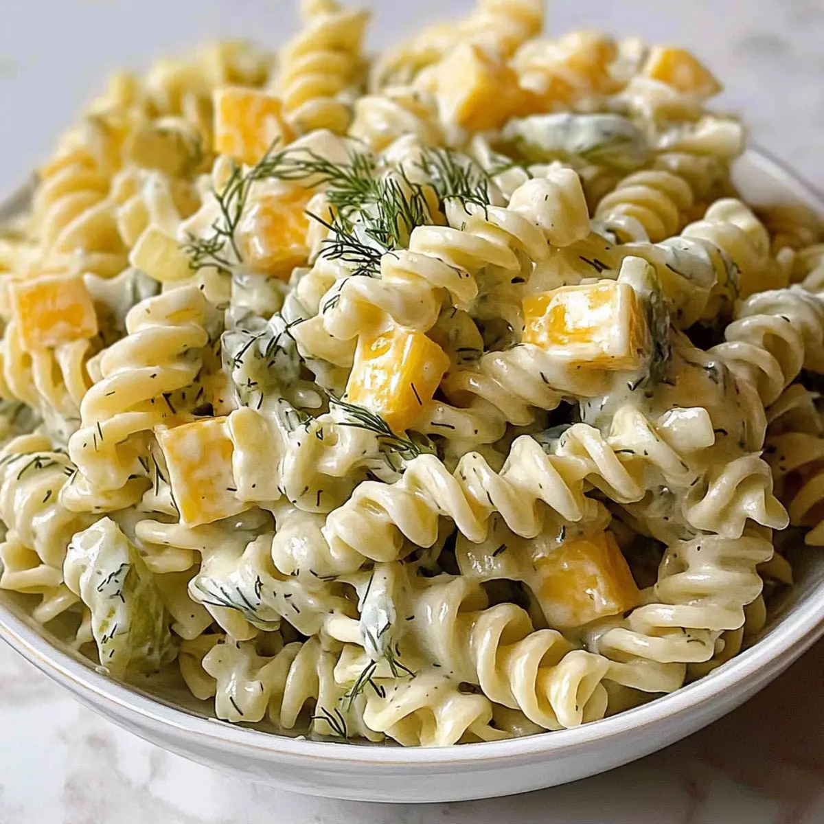 As I tossed together the ingredients for this Simple Dill Pickle Pasta Salad, the aroma of fresh dill wafted through my kitchen, instantly transporting me to carefree summer picnics. The beauty of this dish lies not just in its vibrant flavors but also in its flexibility—perfect for busy days when you need a quick, family-friendly meal. This pasta salad features tender rotini dancing with crunchy dill pickles and a creamy dressing that makes every bite a delight. It’s also a make-ahead marvel, allowing you to whip it up in advance and let the flavors meld beautifully. Whether you’re serving it at a barbecue or enjoying it as a satisfying lunch, this pasta salad is sure to become a staple in your home. What’s your favorite twist to make it uniquely yours? Why is this pasta salad a must-try? Versatile Ingredients: The Simple Dill Pickle Pasta Salad can be tailored to your taste; swap in proteins, fresh veggies, or alternative dressings to make it your own! Quick to Prepare: With just a few hassle-free steps, you can have a delightful salad ready in no time, perfect for those busy weeknights. Family-Friendly Delight: Theming it around pickles and creamy goodness means this dish appeals to kids and adults alike, leaving everyone wanting seconds! Make-Ahead Magic: Prepare it the night before for optimal flavor fusion—perfect for gatherings or meal prepping for the week. Crowd Pleaser: Bring it to your next picnic or BBQ, and watch it disappear as guests rave about the tangy goodness. Try serving it alongside dishes like Tomato Bacon Pasta for a fun meal duo! Simple Dill Pickle Pasta Salad Ingredients For the Pasta Rotini Pasta – This shape holds the creamy dressing well; you can substitute with penne or shells if desired. For the Crunch Dill Pickles – Adds tangy crunch that brightens the dish; feel free to switch to sweet pickles for a milder flavor. Fresh Dill – Offers a vibrant herbal freshness; dried dill can be used but reduce the amount to one-third. White Onion – Provides a mild onion flavor; green onions are a great substitute for a less intense bite. For the Creamy Dressing Colby Jack Cheese – Creamy and flavorful, this cheese complements the salad beautifully; cheddar is a good alternative. Mayonnaise – Serves as the creamy base of the dressing; Greek yogurt can lighten things up if you prefer. Sour Cream – Adds a tangy richness to the dressing; you can use plain yogurt as a substitute. Dill Pickle Brine – Essential for authentic flavor; it’s a key ingredient in Simple Dill Pickle Pasta Salad, but you can adjust the amount to suit your taste. Salt & Black Pepper – Brighten up the flavors; adjust to taste for the perfect seasoning balance. This ingredient lineup is not only simple but also packed with possibilities, ensuring that every family gathering has an extra splash of joy with this delightful pasta salad! Step‑by‑Step Instructions for Simple Dill Pickle Pasta Salad Step 1: Prep Ingredients Begin by prepping all your ingredients. Dice the Colby Jack cheese into small cubes for delightful bites, mince the white onion finely to ensure a mild flavor, and chop the dill pickles into bite-sized pieces. Don’t forget to measure out the fresh dill. This process should take about 10 minutes and will set the stage for easy assembly later. Step 2: Cook Pasta In a large pot, bring salted water to a rolling boil over high heat. Add the rotini pasta and cook for about 7-8 minutes, or according to package instructions, until al dente. Keep an eye on it—cooked pasta should be tender but still retain a slight bite; this ensures your Simple Dill Pickle Pasta Salad will have great texture. Step 3: Cool Pasta Once your pasta reaches the ideal al dente texture, drain it in a colander and immediately rinse it under cool water for about 30 seconds to stop the cooking process. This step is crucial for preventing mushiness. Return the cooled pasta to a large mixing bowl and prepare to bring it all together. Step 4: Brine Pasta While the pasta is still warm, mix in 1/3 cup of dill pickle brine directly into the bowl. This will enhance the flavor of the pasta and make sure it absorbs the tangy essence needed for the Simple Dill Pickle Pasta Salad. Stir gently to coat the pasta evenly with the brine. Step 5: Make Dressing In a separate bowl, combine the mayonnaise and sour cream, adding the remaining dill pickle brine to create a smooth dressing. Whisk these together for about 1-2 minutes until thoroughly blended. Incorporate the chopped fresh dill, salt, and pepper to taste, creating a creamy dressing that’s as delightful as the salad itself. Step 6: Combine Ingredients Carefully fold in the chopped dill pickles, diced cheese, and minced onion into the bowl with your brined pasta. Once well combined, pour the creamy dressing over the pasta salad. Gently mix everything together, ensuring each ingredient is coated with that luscious dressing, making the Simple Dill Pickle Pasta Salad truly shine. Step 7: Chill Cover the bowl with plastic wrap or a lid, and refrigerate the salad for at least 1-2 hours, preferably up to 3. This chilling time is vital, as it allows the flavors to meld beautifully and enhances the overall taste. When ready to serve, simply give the salad a quick toss before dishing it out! Make Ahead Options These Simple Dill Pickle Pasta Salad preparations are perfect for busy weeknights, allowing you to save time while still enjoying a fresh, flavorful dish. You can chop the dill pickles, dice the cheese, and mince the onion up to 24 hours in advance; store them separately in airtight containers to maintain their crunch. Additionally, you can cook and cool the rotini pasta up to 3 days ahead and refrigerate it. When you’re ready to serve, simply mix the prepared components with the dressing you created, toss everything together, and allow the salad to chill for at least 1 hour for the best flavor. This way, you’ll have a delightful meal with minimal 