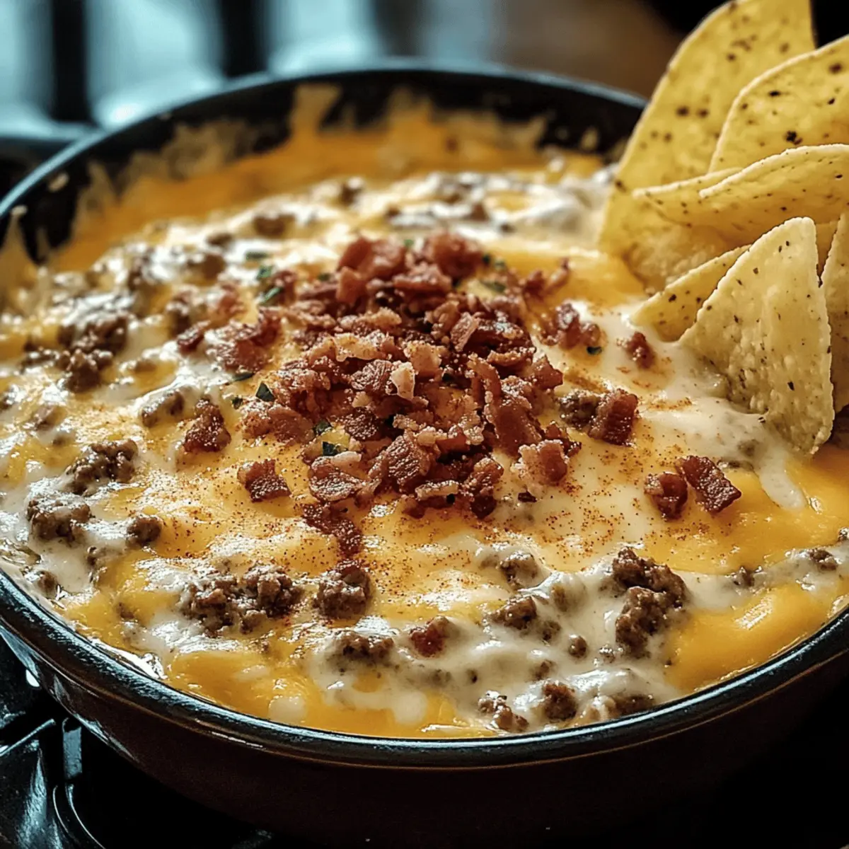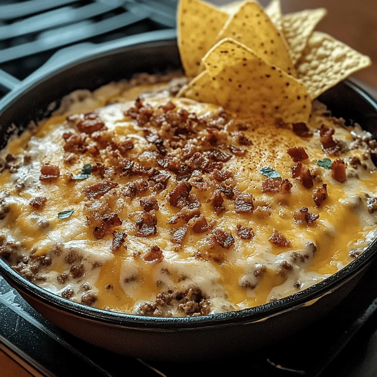 A creamy and cheesy dip bursting with the flavors of crispy bacon and savory ground beef, perfect for game-day gatherings.