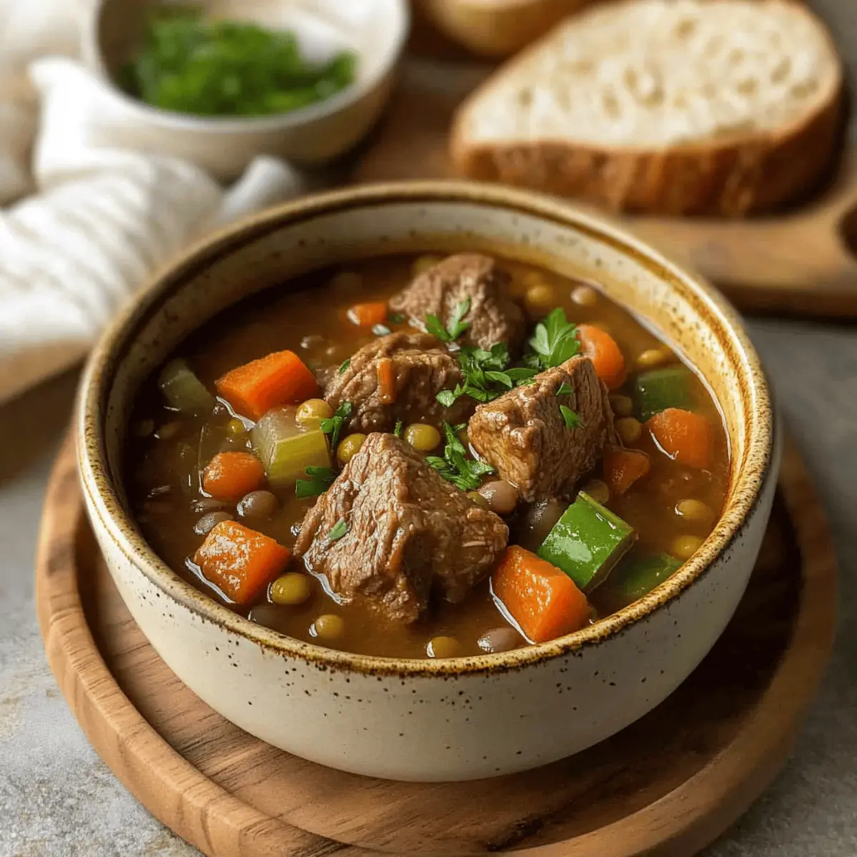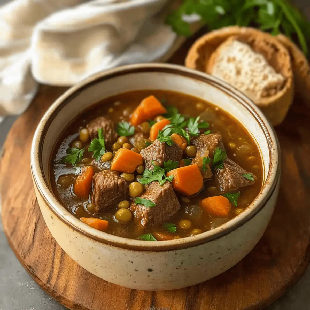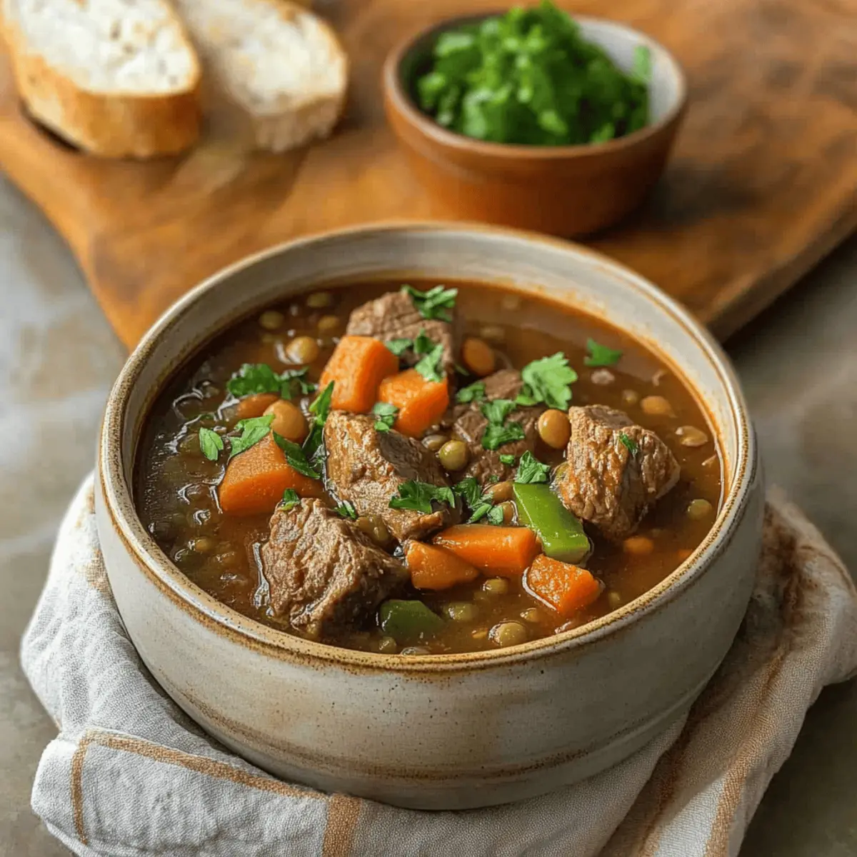 There’s something magical about the aroma of a simmering stew wafting through the house, isn’t there? When I prepare my Slow Cooker Beef and Lentil Stew, it instantly transforms my kitchen into a cozy haven. This hearty family favorite is perfect for busy weeknights, allowing you to enjoy an effortless, comforting meal without spending hours in the kitchen. Not only is it easy to whip up, but this budget-friendly dish packs in the protein and fiber that nourishes both body and soul. It’s the kind of meal that warms you from the inside out and brings everyone together around the table. Are you ready to discover your new go-to comfort food recipe? Why is this stew a must-try? Simplicity at Its Finest: With just a few basic ingredients, this Slow Cooker Beef and Lentil Stew makes cooking a breeze. Hearty and Nourishing: Packed with protein and fiber, this comforting meal keeps everyone satisfied. Flavorful Experience: The blend of spices and tender meat creates a rich, satisfying taste that fills the house with mouthwatering aromas. Family-Friendly: Perfect for gatherings, kids will love its hearty flavors, making it a hit at any table. Versatility Galore: Customize with your favorite veggies or lentil types to keep things exciting; the possibilities are endless! Embrace the warmth of this stew and pair it with some lovely crusty bread for the ultimate experience! Slow Cooker Beef and Lentil Stew Ingredients For the Stew Beef Stew Meat – Provides protein and heartiness; opt for chuck or round cuts for the best flavor. Dried Lentils (green or brown) – Adds fiber and nutrients; they hold their shape well during cooking, unlike red lentils which may break down. Onion – Base flavor that enhances the stew; shallots can be substituted for a milder taste. Carrots – Introduces sweetness and color; feel free to use any variety, including baby carrots whole. Celery – Contributes to the aromatic base; it’s optional, but using it enhances the flavor profile. Garlic – Adds depth of flavor; fresh is preferred, but pre-minced can save time on busy nights. Diced Tomatoes (14 oz can) – Brings acidity and moisture to the stew; fresh tomatoes can be used if you’re in the mood for chopping. Beef or Chicken Broth (4 cups) – Creates the stew’s liquid base; consider low-sodium options to keep it heart-healthy. Smoked Paprika – Provides a smoky depth; you can swap with regular paprika for a lighter taste. Ground Cumin – Adds warmth and earthiness; coriander makes a suitable substitute if you’re after a different flavor twist. Dried Thyme – Enhances herbaceous notes; fresh thyme works too, just remember to increase the amount used. Bay Leaf – Infuses the stew with a subtle flavor; this should be removed before serving. Salt and Black Pepper – Essential for seasoning; adjust to taste for optimal flavor balance. Optional Add-Ins Zucchini or Spinach – Stir in during the last hour of cooking for extra nutrition and freshness. Frozen Peas or Green Beans – Add these in the last 30 minutes for a delightful veggie boost. This Slow Cooker Beef and Lentil Stew is ready to bring warmth and nourishment to your family’s dinner table! Step‑by‑Step Instructions for Slow Cooker Beef and Lentil Stew Step 1: Prep Ingredients Begin by chopping the onion, carrots, celery, and garlic into bite-sized pieces. If you choose to sear the beef stew meat for added flavor, heat a skillet over medium-high heat, add a little oil, and quickly brown the beef on all sides for about 5 minutes. This step is optional but will enhance the overall depth of your Slow Cooker Beef and Lentil Stew. Step 2: Load Slow Cooker Place the prepared beef, lentils, chopped vegetables, and minced garlic into your slow cooker. Open a can of diced tomatoes and pour it in along with 4 cups of beef or chicken broth. Sprinkle in the smoked paprika, ground cumin, dried thyme, and bay leaf. Stir everything together until well combined, ensuring the lentils are evenly distributed in the mixture. Step 3: Cook Cover the slow cooker and set it to low for 8-10 hours or high for 4-6 hours. As it cooks, the beef will become tender and the lentils soft yet intact, merging into a hearty stew. After the time is up, check that the beef is fork-tender, and the lentils have absorbed flavors and created a rich broth. Step 4: Taste and Adjust When the cooking is complete, remove the bay leaf from your Slow Cooker Beef and Lentil Stew. Taste the stew for seasoning and adjust with salt and black pepper as needed. For a touch of heat, consider adding a splash of hot sauce or a sprinkle of red pepper flakes, depending on your preference. Step 5: Serve Scoop the delicious and hearty stew into bowls, making sure to include a generous portion of both beef and lentils. Serve your Slow Cooker Beef and Lentil Stew with crusty bread for dipping, or over a bed of rice, to soak up all the comforting flavors in each bite. What to Serve with Easy Slow Cooker Beef and Lentil Stew There’s nothing like a comforting bowl of stew to warm your heart and satisfy your cravings, and pairing it with the right sides can elevate your meal from delicious to unforgettable. Crusty Bread: Perfect for scooping up every last drop of the savory stew, the crunchy texture contrasts beautifully with the tender beef and creamy lentils. Rice Pilaf: A fluffy bed of seasoned rice adds a gentle flavor and helps soak up the rich broth, enhancing the hearty experience of the stew. Steamed Broccoli: Its bright green color and slight crunch provide a fresh contrast that balances the richness of the stew while adding vitamins to the meal. Green Salad: A light, crisp salad with a vinaigrette dressing refreshes the palate between bites, making it an excellent companion for your comforting stew. Garlic Mashed Potatoes: These creamy potatoes add a velvety texture that complements the stew’s heartiness while infusing each bite with delicious garlic flavor. Sourdough Rolls: The tangy fla