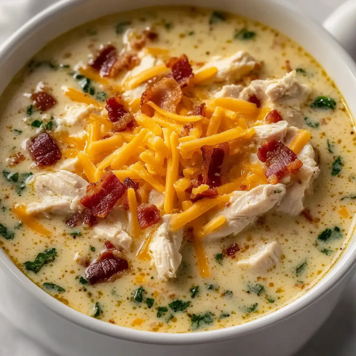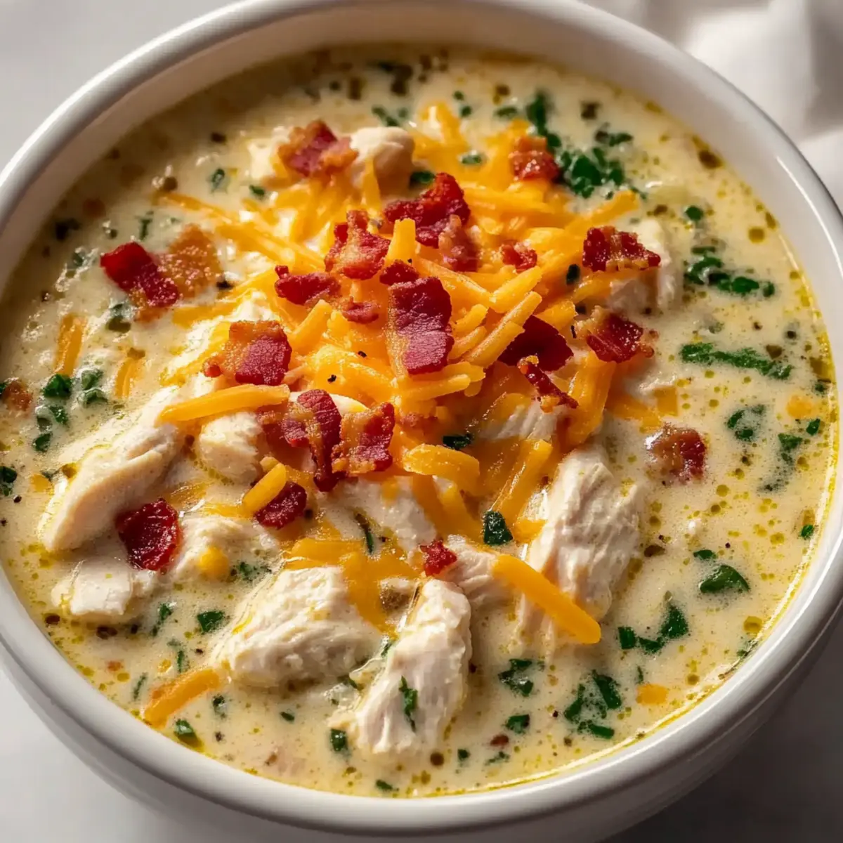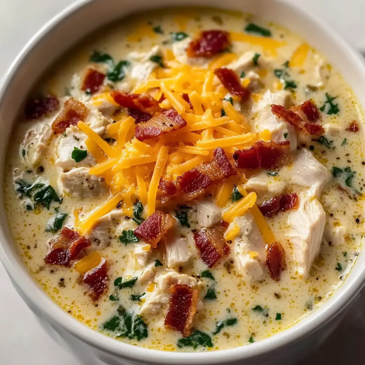 As the cool breeze whispers through the trees, my slow cooker hums softly in the background, filling the kitchen with a heavenly scent that’s hard to resist. That’s the moment I know I’m about to enjoy my favorite comfort food: Slow Cooker Crack Chicken Soup. This recipe transforms humble ingredients into a rich, creamy delight that’s perfect for cozy nights in or hosting intimate family gatherings. With minimal prep time and a hands-off cooking experience, it’s a dream for busy home chefs looking for something warming and satisfying. Plus, it’s easily adaptable for your specific tastes, whether you prefer a lighter version or with extra veggies. Are you ready to discover the secret to a bowl of pure comfort? Let’s dive into this delicious recipe! Why Is This Soup a Must-Try? Unmatched Comfort: A warm bowl of Slow Cooker Crack Chicken Soup feels like a comforting hug on a chilly evening, perfect for family gatherings or solo nights in. Effortless Preparation: Simply toss everything into your slow cooker, with no fancy techniques involved — perfect for beginner cooks! Versatile Ingredients: Easily swap out cheeses or mix in fresh veggies like spinach and carrots to fit your taste and dietary needs. Rich, Creamy Flavor: With the perfect balance of ranch seasoning and cream cheese, every spoonful is bursting with rich flavor, making it a crowd-pleaser. Meal Prep Friendly: This hearty soup stores well and reheats beautifully, making it simple to enjoy leftovers during your busy week. If you’re a fan of creamy soups, don’t forget to check out my One Pot Chicken Dumpling Soup for another comforting option! Slow Cooker Crack Chicken Soup Ingredients For the Soup Chicken Breast – Main protein source; use fresh or thawed for even cooking. Cream Cheese – Adds creaminess and richness; Greek yogurt can be a lighter substitute. Ranch Seasoning – Provides the flavorful profile; homemade ranch seasoning can be used instead. Chicken Broth – Base liquid for the soup; opt for low-sodium options for a healthier choice. For Extra Creaminess Shredded Cheddar Cheese – Adds texture and flavor; swap with mozzarella for a different taste. Bacon Strips – Adds crunch and smokiness; consider turkey bacon or vegetarian bacon if preferred. Optional Add-ins Spinach – Adds color and nutrition; kale or other greens can be substituted. Jalapeños – For a touch of spiciness; omit for a milder flavor. This delicious Slow Cooker Crack Chicken Soup is sure to become a family favorite! Step‑by‑Step Instructions for Slow Cooker Crack Chicken Soup Step 1: Prep Chicken Begin by placing your thawed chicken breasts in the bottom of your slow cooker. Make sure to arrange them evenly so they’ll cook properly. This crucial first step sets the foundation for your creamy Slow Cooker Crack Chicken Soup, ensuring that every bite is tender and flavorful. Step 2: Add Creaminess Next, gently lay the cream cheese over the chicken breasts, allowing it to slowly melt during the cooking process. This addition is key to achieving that rich, creamy texture that makes this soup so comforting. It will create a luscious base for the other ingredients to build upon as they meld together throughout cooking. Step 3: Season Sprinkle the ranch seasoning evenly over the chicken and cream cheese, enhancing the flavor profile of your soup. This step is essential for infusing that classic ranch taste which pairs beautifully with the creamy components. Take a moment to enjoy the aromatic blend that fills your kitchen at this stage! Step 4: Pour Broth Carefully pour the chicken broth over the ingredients, ensuring everything is mostly submerged. This liquid will not only help cook the chicken thoroughly but also create the rich broth that makes your Slow Cooker Crack Chicken Soup so delightful. Make sure to choose low-sodium broth if you prefer a healthier option. Step 5: Cook Set your slow cooker to low for 6-8 hours or on high for 4-6 hours. If you’ve got the extra time, cooking on low allows the flavors to meld beautifully, while high settings are perfect for a quick meal. As it cooks, the chicken will become tender and infuse the broth with rich flavors, turning your home into a cozy haven. Step 6: Mix and Add Cheese Once cooking is complete, carefully shred the chicken into bite-sized pieces using two forks right in the slow cooker. Stir in the shredded cheddar cheese and let it sit for a few minutes so that the cheese can melt and create a creamy texture throughout the soup. The addition of cheese elevates this Slow Cooker Crack Chicken Soup to a whole new level of comfort. Step 7: Final Touches Finally, just before serving, stir in the cream and any optional spinach or jalapeños for a pop of color and nutrition. Allow the greens to wilt for a few minutes, adding freshness to your rich soup. Once everything is combined, your comforting Slow Cooker Crack Chicken Soup is ready to be served hot, warming your soul with every spoonful. How to Store and Freeze Slow Cooker Crack Chicken Soup Fridge: Store leftover soup in an airtight container for up to 3 days. Reheat gently on the stove or in the microwave to enjoy that creamy texture again. Freezer: For longer storage, freeze the soup in airtight containers for up to 3 months. Allow it to cool completely before sealing to prevent freezer burn. Thawing: To enjoy your frozen Slow Cooker Crack Chicken Soup, thaw it overnight in the fridge before reheating. Ensure it’s warmed through before serving. Reheating: Reheat on the stove over medium heat, stirring occasionally until heated through. Add a splash of chicken broth or cream if the soup is too thick after freezing. Slow Cooker Crack Chicken Soup Variations Customize your Slow Cooker Crack Chicken Soup with these delightful variations that cater to different tastes and dietary needs. Dairy-Free: Substitute cream cheese with blended silken tofu and use coconut milk for a creamy base without dairy. This alternative 