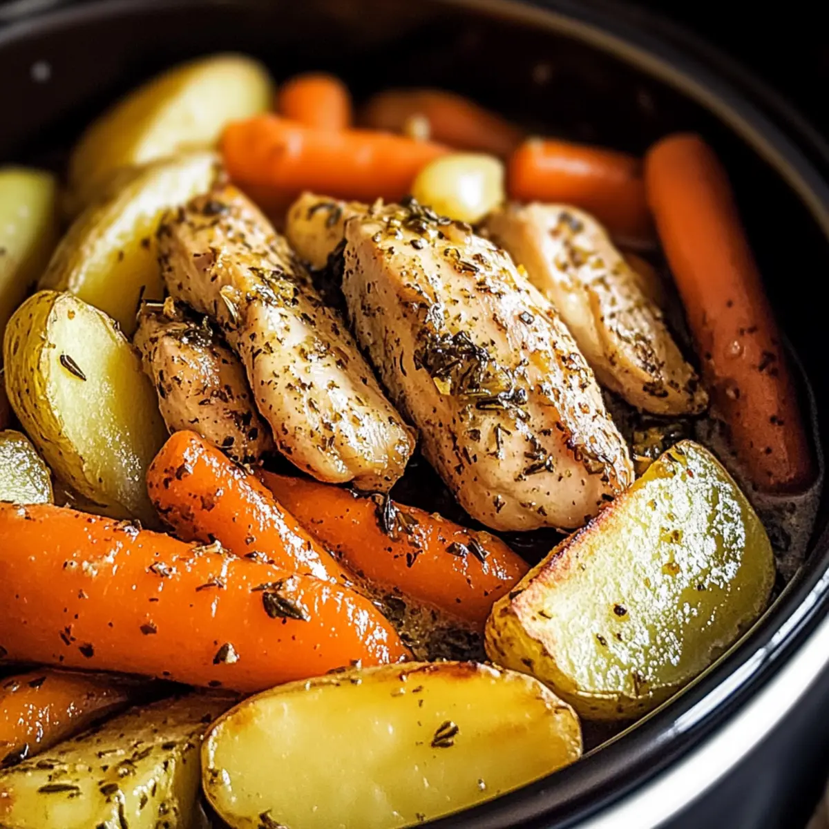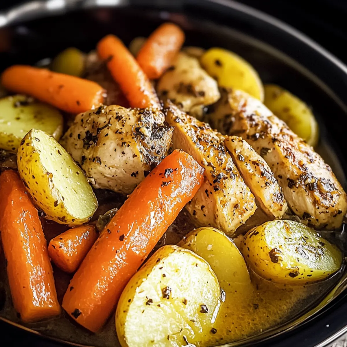 The smell of dinner beckons as I come home after a long day. Enter the Slow Cooker Garlic Butter Chicken and Veggies—a dreamy, family-friendly one-pot meal that transforms hectic weeknights into cozy gatherings. With just a few ingredients, including succulent chicken, vibrant veggies, and a rich garlic butter sauce, this dish offers both simplicity and satisfaction. What’s more, it’s incredibly customizable; you can swap in your favorite vegetables or even a dairy-free butter to meet any dietary needs. Imagine the joy of serving a comforting meal that not only fills bellies but also warms hearts. Are you ready to discover how easy it is to create this wholesome delight? Let’s dive in! Why is this recipe a game changer? Effortless Preparation: With minimal chopping and mixing, the slow cooker does all the heavy lifting, making mealtime a breeze. Flavor Explosion: The garlic butter sauce seeps into each bite, enhancing the chicken and veggies with a robust taste that’s sure to impress your family. Customizable Goodness: Use whatever vegetables you have on hand, whether they’re sweet potatoes or vibrant bell peppers, to create a dish that suits your tastes perfectly. One-Pot Wonder: Say goodbye to multiple pots and pans—just toss everything in your slow cooker and let the magic happen! Perfect for Busy Nights: Get that home-cooked essence without spending hours in the kitchen, freeing up your evenings for family time or relaxation. If you’re a fan of savory meals, you might also enjoy Garlic Butter Chicken or the creamy goodness of Butter Chicken Discover to mix things up! Slow Cooker Garlic Butter Chicken and Veggies Ingredients For the Chicken Chicken Tenderloins – The main protein source, providing tenderness; substitute with boneless skinless breasts if preferred. For the Vegetables Carrots – Add sweetness and vibrant color; cut into uniform pieces for even cooking. Potatoes – Serve as a filling side; sweet potatoes or other root vegetables can add different flavors. For the Garlic Butter Sauce Butter – Key fat for richness; olive oil or a dairy-free alternative can lighten the dish. Garlic – Essential for flavor; use fresh minced garlic for the best results. Salt & Pepper – Basic seasonings that enhance the overall taste; adjust according to your preference. Thyme & Parsley – Fresh herbs offer aromatic depth; if unavailable, dried versions can be used but fresh is preferred for maximum flavor. Feel free to explore variations with different vegetables to make this Slow Cooker Garlic Butter Chicken and Veggies your own! Step‑by‑Step Instructions for Slow Cooker Garlic Butter Chicken and Veggies Step 1: Prepare the Ingredients Start by placing the chicken tenderloins in the center of your slow cooker, ensuring they’re laid flat. Surround the chicken with evenly cut potato wedges and vibrant baby carrots for a beautiful presentation. This arrangement not only looks great but also allows for even cooking throughout the Slow Cooker Garlic Butter Chicken and Veggies. Step 2: Make the Garlic Butter Sauce In a medium bowl, combine melted butter, minced garlic, salt, pepper, thyme, and parsley. Stir the mixture thoroughly until everything is well incorporated, creating a rich and aromatic garlic butter sauce. This will be the flavor foundation for your Slow Cooker Garlic Butter Chicken and Veggies, enhancing both the chicken and vegetables as they cook. Step 3: Combine Ingredients Pour the garlic butter mixture evenly over the chicken and vegetables in the slow cooker. Use a spoon to ensure the chicken and veggies are nicely coated with the sauce, making sure every piece gets that delicious garlic flavor. This step is key to achieving the savory taste that will define your Slow Cooker Garlic Butter Chicken and Veggies. Step 4: Set to Cook Cover your slow cooker with the lid and set it on HIGH for 4 hours or LOW for 6-8 hours, depending on your schedule. The slow cooking process allows the flavors to meld beautifully, resulting in tender chicken and perfectly cooked veggies. You’ll know it’s done when the chicken reaches an internal temperature of 165°F and the veggies are fork-tender. Step 5: Serve and Enjoy Once cooking is complete, carefully remove the lid and let the steam escape. Serve the Slow Cooker Garlic Butter Chicken and Veggies hot, showcasing the tender chicken and the vibrant array of vegetables. Consider pairing it with a side of rice, fresh bread, or even tossing it into tacos for a delightful meal that will bring smiles to the entire family. Slow Cooker Garlic Butter Chicken Variations Feel free to get creative with this dish to match your tastes and dietary needs! Dairy-Free: Use olive oil or a dairy-free butter alternative to keep the garlic butter sauce rich yet light without dairy. Vegetarian: Swap chicken for chickpeas or tofu. These plant-based proteins absorb flavors well and keep the dish hearty. Heat It Up: Add a pinch of red pepper flakes to the garlic butter sauce for a pleasant kick that enhances the overall flavors beautifully. Extra Veggies: Toss in bell peppers, green beans, or zucchini for added nutrients and colorful vibrance that brings life to your plate. Sweet Potato Twist: Substitute traditional potatoes with sweet potatoes to introduce a delightful sweetness that complements the savory garlic butter. Beefy Version: For a heartier meal, replace chicken with beef chunks or stew meat and cook for a richer flavor experience. Herb Variations: Experiment with different herbs like rosemary or oregano instead of thyme and parsley for a fresh landscape of flavors. Citrusy Kick: Squeeze some lemon or lime juice over the finished dish for a zesty brightness that livens up the savory richness. With so many variations possible, your Slow Cooker Garlic Butter Chicken and Veggies can be a new surprise at every meal! What to Serve with Slow Cooker Garlic Butter Chicken and Veggies Experience a comforting meal that can be perfectly c