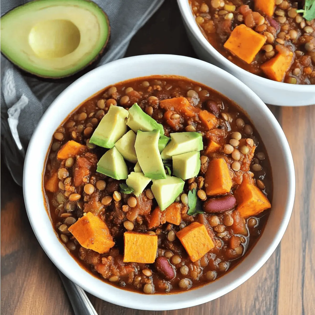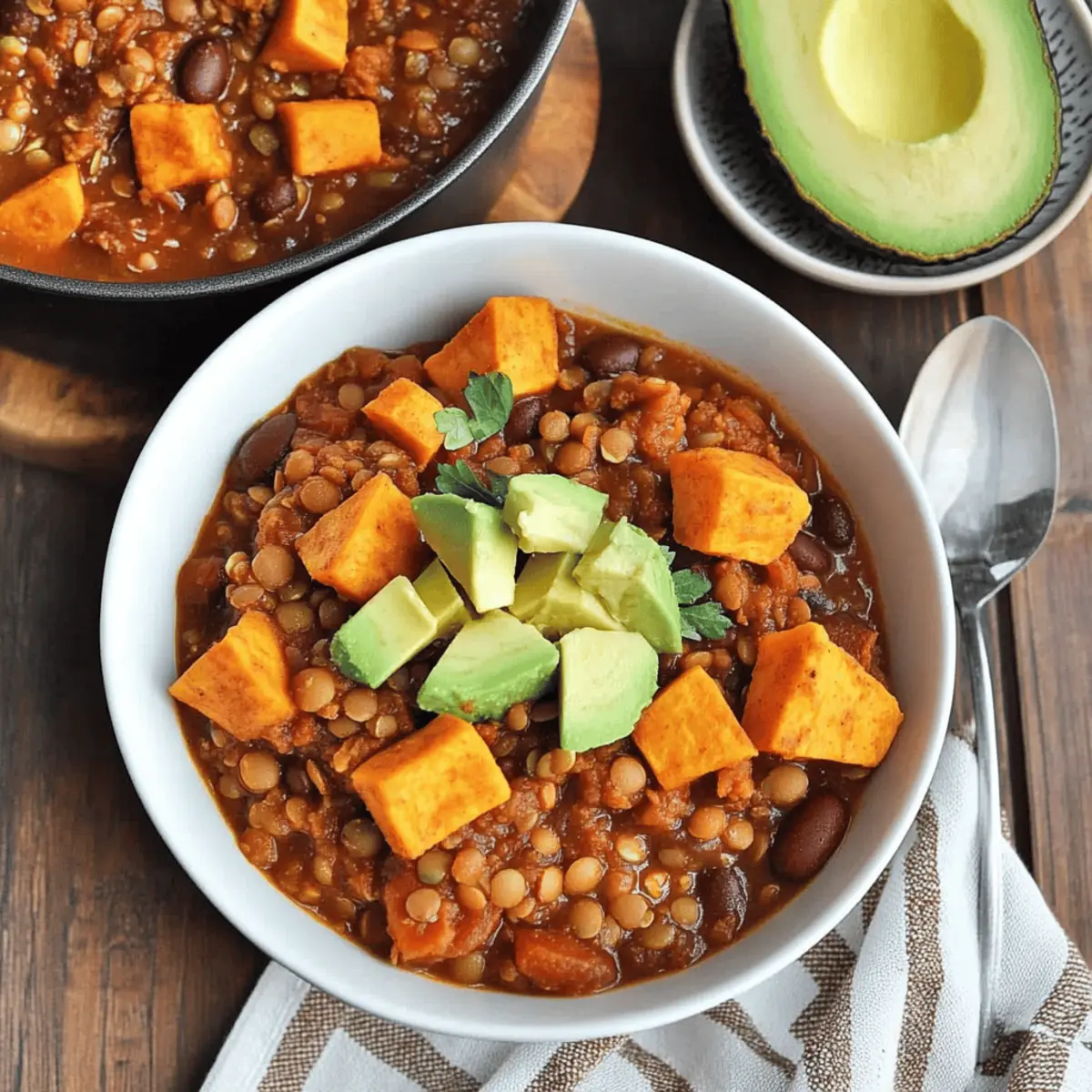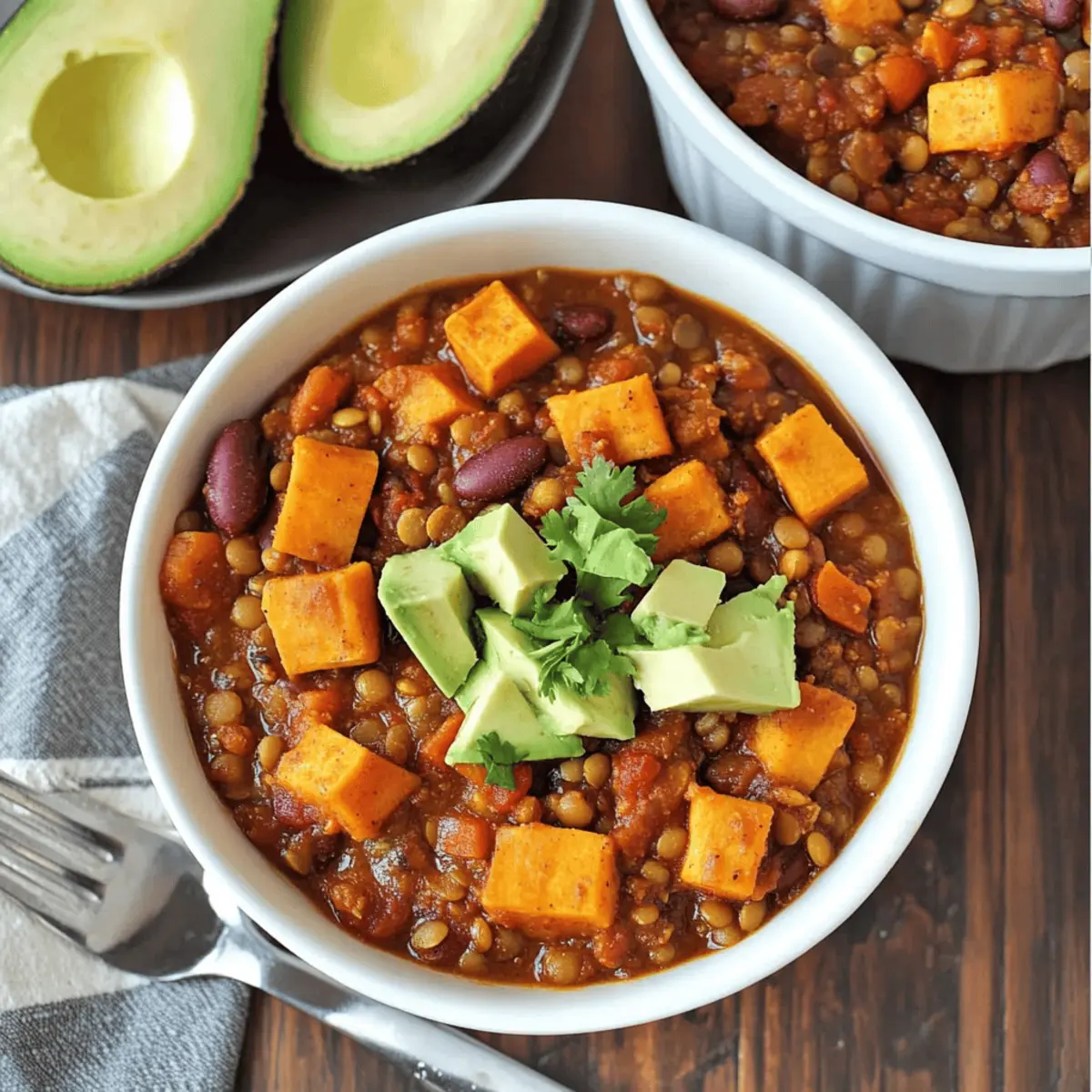 As the winds grow chillier and the days shorten, there’s something deeply satisfying about embracing the warmth of home-cooked meals. Enter my Slow Cooker Lentil Sweet Potato Chili—a dish that invites you to snuggle up with hearty goodness while delivering a punch of vibrant flavors. The comforting combination of tender lentils and sweet potatoes makes this vegan delight not only easy to whip up but also a superb meal prep option for busy weeknights. It’s gluten-free, making it perfect for everyone at the table, and simply begs for garnishes like creamy avocado or fresh herbs to elevate it further. Who says nutritious can’t be incredibly delicious? Ready to transform your kitchen into a haven of deliciousness? Let’s get cooking! Why is this chili a must-try? Hearty Comfort: This Slow Cooker Lentil Sweet Potato Chili offers a warm embrace on chilly days, making it the ultimate comfort food. Flavor Explosion: A blend of spices, sweet potatoes, and lentils creates a symphony of rich flavors you’ll adore. Easy Meal Prep: Perfect for busy weekdays, it’s a satisfying dish you can whip up with minimal effort. Versatile Ingredients: Feel free to mix in extra veggies or substitute lentils with quinoa for a delightful twist! Pair with Garlic Mashed Potatoes for a heartier meal or enjoy it alone. Health Conscious: Vegan, gluten-free, and packed with protein, this chili is a delicious and nutritious choice for everyone! Slow Cooker Lentil Sweet Potato Chili Ingredients For the Chili • Yellow Onion – Adds sweetness and depth to the flavor. • Garlic – Enhances the overall aroma and adds zest. • Sweet Potatoes – Provide natural sweetness and a creamy texture; can be substituted with regular potatoes if needed. • Diced Tomatoes (canned) – Acts as the base of the chili for moisture and flavor; opt for no-salt-added versions for a healthier option. • Red Kidney Beans – Adds protein and texture; can substitute with black beans if preferred. • Frozen Corn – Offers sweetness and a pop of color; fresh or canned corn can be used instead. • Vegetable Broth – Provides liquid and flavor; choose low-sodium to control salt content. • Dried Green Lentils – Main protein source, providing bulk; can substitute with brown lentils, but cooking time may vary. • Chili Powder – Adds heat and depth of flavor; adjust to taste according to spice preference. • Cumin – Enhances earthiness; can be substituted with coriander for a slightly different flavor. • Salt and Pepper – Used for seasoning; adjust as needed. For the Garnishes • Diced Avocado – Adds creaminess and freshness to your chili. • Fresh Parsley or Cilantro – Enhances presentation and adds a burst of flavor. This Slow Cooker Lentil Sweet Potato Chili is a delightful mix of wholesome ingredients, ideal for a cozy family meal! Step‑by‑Step Instructions for Slow Cooker Lentil Sweet Potato Chili Step 1: Prepare the Ingredients Begin by finely chopping one yellow onion and mincing three cloves of garlic. Peel and dice two medium sweet potatoes into bite-sized cubes for a creamy texture. Rinse and drain one can of red kidney beans, ensuring they’re ready to mix in. This preparation will set a solid foundation for your delicious Slow Cooker Lentil Sweet Potato Chili. Step 2: Combine Ingredients in the Slow Cooker In your slow cooker, add the prepared onion, garlic, sweet potatoes, one can of diced tomatoes, and the drained kidney beans. Sprinkle in one cup of frozen corn, one cup of dried green lentils, and then pour in four cups of vegetable broth. Finally, season the mixture with two tablespoons of chili powder, one teaspoon of cumin, salt, and pepper to taste. Stir well to combine all these vibrant ingredients. Step 3: Set the Slow Cooker Cover the slow cooker with its lid and cook the Slow Cooker Lentil Sweet Potato Chili on low for about eight hours. If you’re short on time, you can also cook it on high for approximately four and a half hours. Feel free to check occasionally to ensure everything is bubbling and fragrant, allowing the flavors to blend beautifully! Step 4: Adjust Seasoning Once cooking is complete, carefully taste the chili and adjust seasoning as needed. You may want to add more salt, pepper, or chili powder, depending on your spice preference. It should have a warm and comforting balance of flavors. This final adjustment ensures that your Slow Cooker Lentil Sweet Potato Chili is just right for your family’s taste. Step 5: Serve and Garnish Scoop generous portions of the hearty chili into bowls, and don’t forget to add your favorite garnishes! Top with diced avocado and a sprinkle of fresh parsley or cilantro for a refreshing touch. This finishing flourish not only enhances the visual appeal but also adds an extra layer of flavor to your delightful Slow Cooker Lentil Sweet Potato Chili. Make Ahead Options These Slow Cooker Lentil Sweet Potato Chili ingredients are perfect for meal prep enthusiasts! You can chop the onions, garlic, and sweet potatoes, and even rinse the beans up to 24 hours in advance. Simply store the prepped veggies in an airtight container in the refrigerator to maintain their freshness. Additionally, you can combine all the ingredients in your slow cooker insert and refrigerate it overnight, ensuring everything is ready to cook in the morning. When you’re ready to serve, just plug in your slow cooker and let it work its magic. Your chili will still be just as delicious, saving you time on busy weeknights without skimping on flavor! Storage Tips for Slow Cooker Lentil Sweet Potato Chili Fridge: Store leftovers in a sealed container in the refrigerator for up to 3 days. Allow the chili to cool completely before sealing to maintain freshness. Freezer: This chili freezes exceptionally well! Portion it into airtight containers or freezer bags, leaving some room for expansion. It can be stored for up to 3 months. Reheating: When ready to enjoy, thaw in the frid