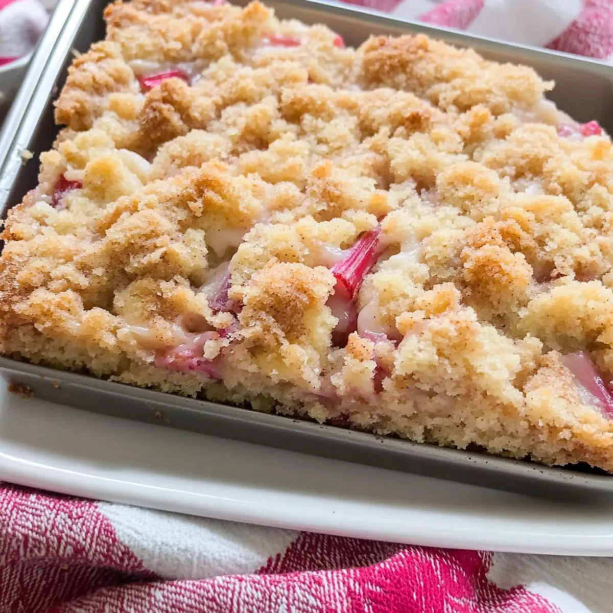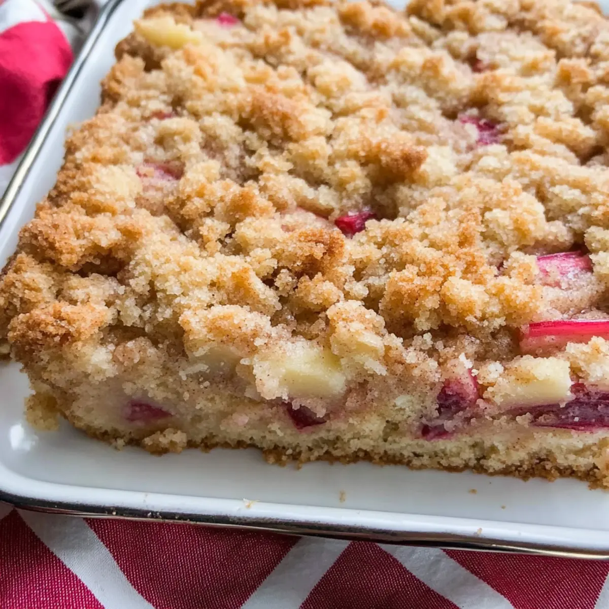 In a sun-drenched kitchen, the scent of freshly baked cake wafts through the air, promising a slice of summer delight. This Sour Cream Rhubarb Cake is my go-to dessert for those warm days when rhubarb is at its peak. With its tender crumb, enhanced by the tangy creaminess of sour cream, it strikes a perfect balance between sweet and tart that is simply irresistible. It’s incredibly easy to whip up, making it perfect for both novice bakers and seasoned pros seeking a minimal-effort treat. Plus, it’s as versatile as it is delicious—ideal for using fresh rhubarb or even frozen leftovers from last season’s bounty. Curious to see how this bright and moist dessert might steal the show at your next gathering? Let’s dive into the details! Why is this cake a summer favorite? Irresistible Flavor: The combination of tangy rhubarb and creamy sour cream creates a delightful contrast that keeps you coming back for more. Easy Preparation: With straightforward steps, this recipe is perfect for bakers of all levels, whether you’re whipping it up for a family gathering or an impromptu treat. Versatile Options: Not only does this cake shine with rhubarb, but you can easily swap in your favorite fruits like strawberries or blueberries for a unique twist! Crowd-Pleasing Appeal: Serve it at parties, and watch guests light up with delight, especially when paired with a scoop of vanilla ice cream or a dollop of whipped cream. Time-Saving Delight: Bake it in just over an hour, making it a quick and satisfying solution to dessert cravings without hours spent in the kitchen! Sour Cream Rhubarb Cake Ingredients • Here’s what you need to create this delightful cake! For the Cake All-Purpose Flour – Provides structure; swap with whole wheat flour for added nutrition. Granulated Sugar – Adds sweetness and moisture; coconut sugar works well for a lower glycemic index. Baking Soda – Acts as a leavening agent; make sure it’s fresh for the best rise. Ground Cardamom – Infuses warm spice; feel free to replace with nutmeg for a unique flavor twist. Salt – Enhances flavor; use sea salt for a more delicate taste. Eggs – Binds ingredients and adds moisture; flax eggs are a great vegan alternative. Sour Cream – Provides moisture and tang; Greek yogurt can be used in place of sour cream. Diced Rhubarb – The star of this cake; be sure to drain frozen rhubarb well before using. For the Topping Salted Butter – Adds richness; use unsalted if preferred and adjust salt accordingly. Additional All-Purpose Flour – Gives texture to the crumble; use the same type for consistency. Ground Cinnamon – Adds an aromatic warm touch; adjust based on personal preference. This Sour Cream Rhubarb Cake is sure to become a cherished recipe in your collection! Step‑by‑Step Instructions for Sour Cream Rhubarb Cake Step 1: Prep the Oven Begin by preheating your oven to 350°F (175°C). This step is crucial for ensuring that your Sour Cream Rhubarb Cake bakes evenly. While the oven heats up, gather all your ingredients and baking tools, like a large mixing bowl and a whisk, to streamline the process. Step 2: Mix Ingredients In a large mixing bowl, whisk together the all-purpose flour, granulated sugar, baking soda, ground cardamom, and salt until well combined. Then, crack in the eggs and add the sour cream, stirring until the mixture is smooth and creamy. Gently fold in the diced rhubarb, being careful not to over-mix to maintain the delicate texture of your cake. Step 3: Prepare Pan Grease a 9”x13” baking pan thoroughly, then dust it with flour to prevent sticking. Pour the rich batter from your mixing bowl into this prepared pan, leveling the top with the back of a spoon. This will create an even surface for your cake to rise beautifully while baking. Step 4: Make Topping For the crumble topping, mix the sugar, flour, ground cinnamon, and salted butter in a bowl. Use your fingers or a pastry cutter to blend the ingredients until they resemble coarse crumbs. This crumble will add a delightful crunch to your Sour Cream Rhubarb Cake, so sprinkle it evenly over the batter in the pan. Step 5: Bake Place the pan in the center of your preheated oven and bake uncovered for 30-35 minutes. After this time, check the cake for doneness by inserting a toothpick into the center; it should come out clean. Cover the pan loosely with aluminum foil and bake for an additional 20 minutes to ensure it remains tender without over-baking. Step 6: Cool Once baked, remove the Sour Cream Rhubarb Cake from the oven and let it cool in the pan on a wire rack for at least 1 hour. This cooling period will enhance the flavors and make cutting easier. If you like, serve your cake with a scoop of vanilla ice cream or a dollop of whipped cream for an extra special treat! Expert Tips for Sour Cream Rhubarb Cake Drain Frozen Rhubarb: Make sure to drain frozen rhubarb thoroughly to prevent excessive moisture, which can make the cake soggy. Check Doneness Early: Keep an eye on the cake after the first 30-35 minutes of baking; cover with foil if it browns too quickly to ensure a tender finish. Let it Cool: Allowing the cake to cool for at least an hour helps enhance the flavors and makes it easier to slice beautifully. Stir Gently: When folding in the rhubarb, do it gently to retain the delicate texture of the sour cream rhubarb cake and prevent overmixing. Customize Your Topping: Feel free to mix in nuts or stir in different spices to your crumb topping for an added crunch or flavor kick, making it uniquely yours! What to Serve with Sour Cream Rhubarb Cake Enhance your delicious summer dessert experience with these delightful pairings that perfectly complement the tangy goodness of this cake. Vanilla Ice Cream: A classic pairing that adds creamy richness and balances the tartness of the rhubarb perfectly. Whipped Cream: Light and airy, it offers a sweet contrast that elevates the overall flavor profile beautifully. Fresh Berries: Bright strawb