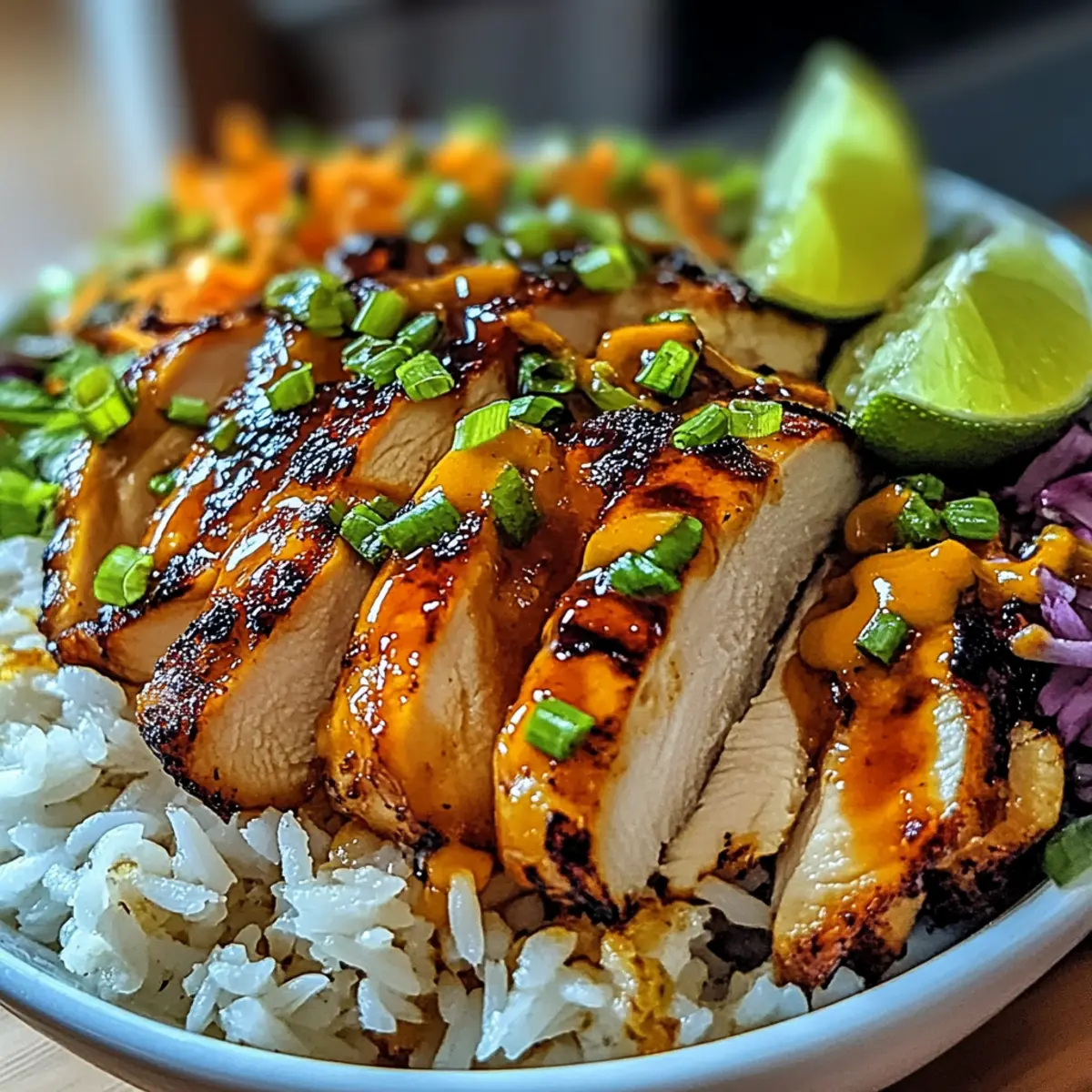 6. To serve, create a bed of coconut rice on each plate, slice the seared chicken, and arrange on top. Drizzle thickened sauce over the chicken, and garnish with green onions and lime wedges.