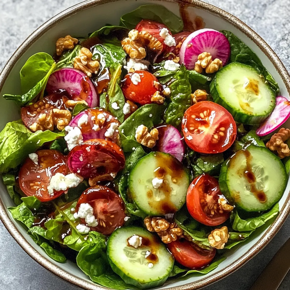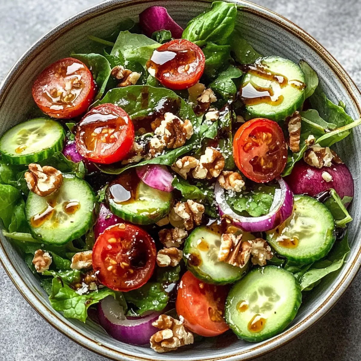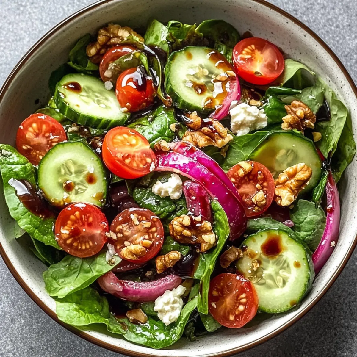 As I strolled through the vibrant farmers’ market last Saturday, I was struck by the vivid greens glistening in the morning sun. This inspired me to whip up a delightful Spring Mix Salad with Balsamic Honey Dressing. Bursting with tender spring greens, juicy cherry tomatoes, and crisp cucumbers, this salad is not just a feast for the eyes but a nourishing delight for the soul. The best part? It’s both a quick recipe and versatile enough to suit various dietary preferences—swap honey for maple syrup to make it vegan! Perfect as a light lunch or a refreshing side at dinner, this salad is my secret weapon for busy weeknights. Are you ready to elevate your homemade meals with a touch of spring magic? Why is this salad a must-try? Bursting with freshness: This Spring Mix Salad combines crisp greens, juicy cherry tomatoes, and refreshing cucumbers, creating a delightful medley. Quick to prepare: In just 15 minutes, you can assemble this beautiful dish, making it perfect for busy weeknights or unexpected guests. Customize to your taste: With options to swap honey for maple syrup or add seasonal veggies, you can easily adjust it to meet various dietary needs. Crowd-pleaser appeal: Whether as a side for grilled chicken or on its own, this salad is sure to impress friends and family alike. Healthy and nutritious: Each serving is packed with vitamins, making it an excellent choice for anyone looking to eat fresh and light. Enjoy it alongside dishes like Honey Garlic Chicken for a complete meal! Spring Mix Salad with Balsamic Honey Dressing Ingredients For the Salad Spring Mix Salad Greens – Provides a fresh, tender texture as the base of your salad. Use pre-packaged or fresh from the market. Cherry Tomatoes (1 cup, halved) – Adds juiciness and a burst of flavor; substitute with grape tomatoes if unavailable. Cucumber (1/2, sliced) – Offers a refreshing crunch and hydration; an English cucumber is preferred for its mild flavor and thin skin. Red Onion (1/4, thinly sliced) – Introduces a sharp bite that can be omitted or sliced thinly for kids’ palates. Feta Cheese (1/4 cup, crumbled) – Provides creaminess and tang; goat cheese is a great milder alternative. Walnuts or Pecans (1/4 cup, chopped, toasted) – Contributes delightful crunch and nuttiness; can be replaced with sunflower seeds for a nut-free option. For the Dressing Balsamic Vinegar (1/4 cup) – Forms the dressing base, essential for providing a lovely acidity. Aged balsamic can elevate the flavor even more. Honey (2 tablespoons) – Sweetens the dressing beautifully; use maple syrup instead for a vegan Spring Mix Salad with Balsamic Honey Dressing. Olive Oil (1/2 cup, extra-virgin) – Adds richness and smooth texture to the dressing, enhancing all flavors present. Salt and Freshly Ground Black Pepper – Essential for seasoning both the dressing and salad to your taste, bringing it all together. Feel free to mix and match your ingredients—your taste buds will thank you! Step‑by‑Step Instructions for Spring Mix Salad with Balsamic Honey Dressing Step 1: Prep the Greens Start by rinsing the spring mix salad greens under cool water, removing any dirt or residues. Using a salad spinner or clean kitchen towel, gently spin or pat the greens dry, which will help them stay crisp. Once dry, place the greens in a large salad bowl, creating a fresh and vibrant base for your Spring Mix Salad with Balsamic Honey Dressing. Step 2: Add Fresh Vegetables Incorporate the halved cherry tomatoes, sliced cucumber, and thinly sliced red onion into the bowl with the spring mix greens. Make sure the vegetables are evenly distributed for maximum flavor in each bite. The juicy tomatoes and crunchy cucumbers will add refreshing layers to your salad. Set this mixture aside while you prepare the nuts and dressing. Step 3: Toast the Nuts If desired, take a small skillet and heat it over medium heat. Add the chopped walnuts or pecans, toasting them for 1-2 minutes, stirring frequently, until they are fragrant and golden. Keep a close eye on them to prevent burning. Once toasted, remove from heat and let them cool slightly before adding to your salad for a delightful crunch. Step 4: Make the Balsamic Honey Dressing In a small bowl or mason jar, combine the balsamic vinegar, honey, and extra-virgin olive oil. Whisk or shake the mixture vigorously until it becomes glossy and well blended. Taste the dressing and season it with salt and freshly ground black pepper according to your preference. This flavorful dressing will elevate your Spring Mix Salad beautifully. Step 5: Combine and Serve Just before serving, drizzle the balsamic honey dressing over the salad, ensuring an even coating. Gently toss the salad with your hands or a large spoon to mix the ingredients and allow the dressing to coat each piece. Serve immediately to enjoy the freshness, or if prepared in advance, keep the dressing separate until the moment you’re ready to savor your Spring Mix Salad with Balsamic Honey Dressing. Make Ahead Options These Spring Mix Salad with Balsamic Honey Dressing components are perfect for meal prep enthusiasts! You can wash and dry the spring mix greens up to 24 hours in advance, storing them in an airtight container lined with a paper towel to maintain crispness. The cherry tomatoes and cucumbers can also be sliced ahead of time, while the toasted walnuts or pecans can be made up to 3 days ahead and stored in a sealed bag. For the dressing, whip it up and refrigerate for up to 1 week—just give it a good shake before using. When it’s time to serve, simply combine the prepped ingredients and drizzle with the dressing for a fresh and vibrant salad without any stress. How to Store and Freeze Spring Mix Salad Room Temperature: Enjoy Spring Mix Salad fresh; do not leave it out for more than 2 hours to maintain food safety. Fridge: Store leftover salad components separately in airtight containers for up to 3 days to prevent wilting and sogginess, keepi