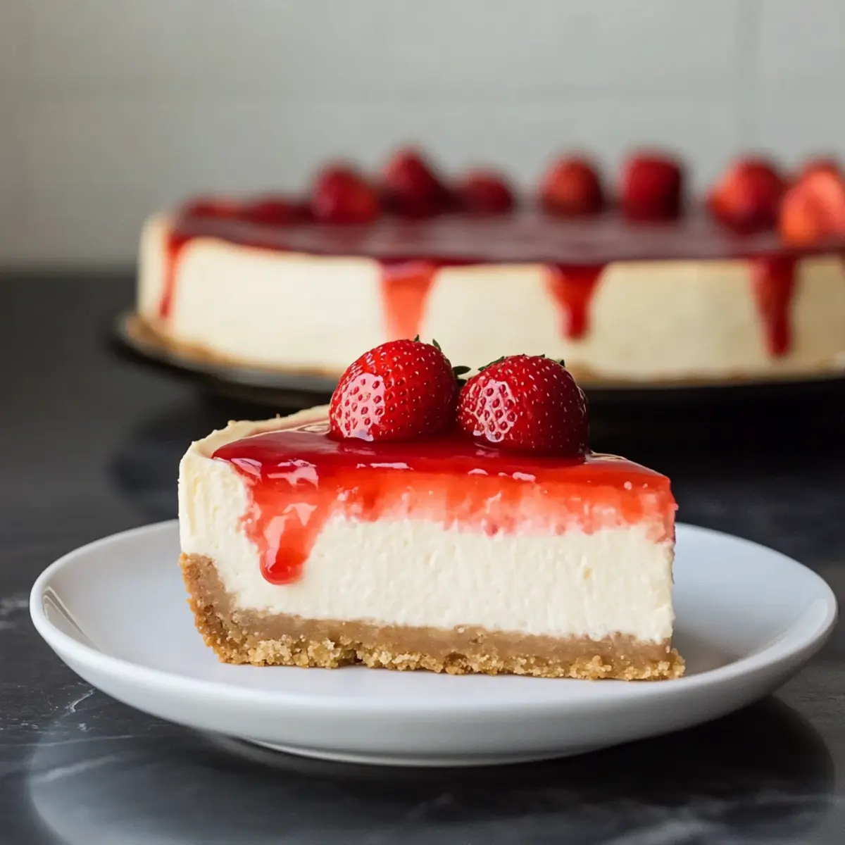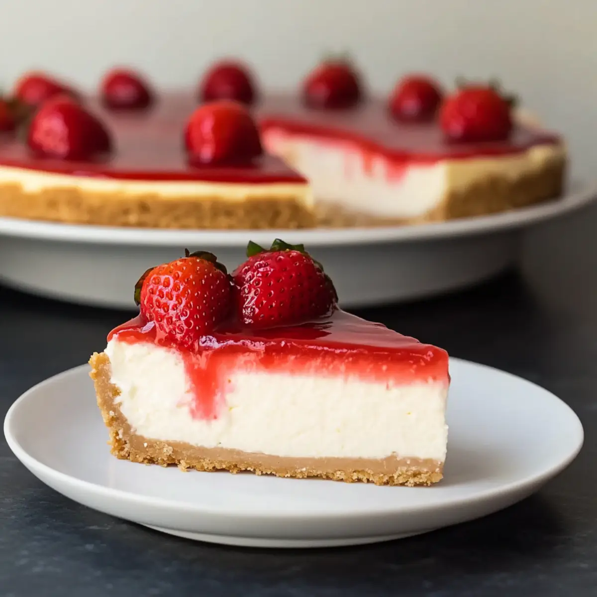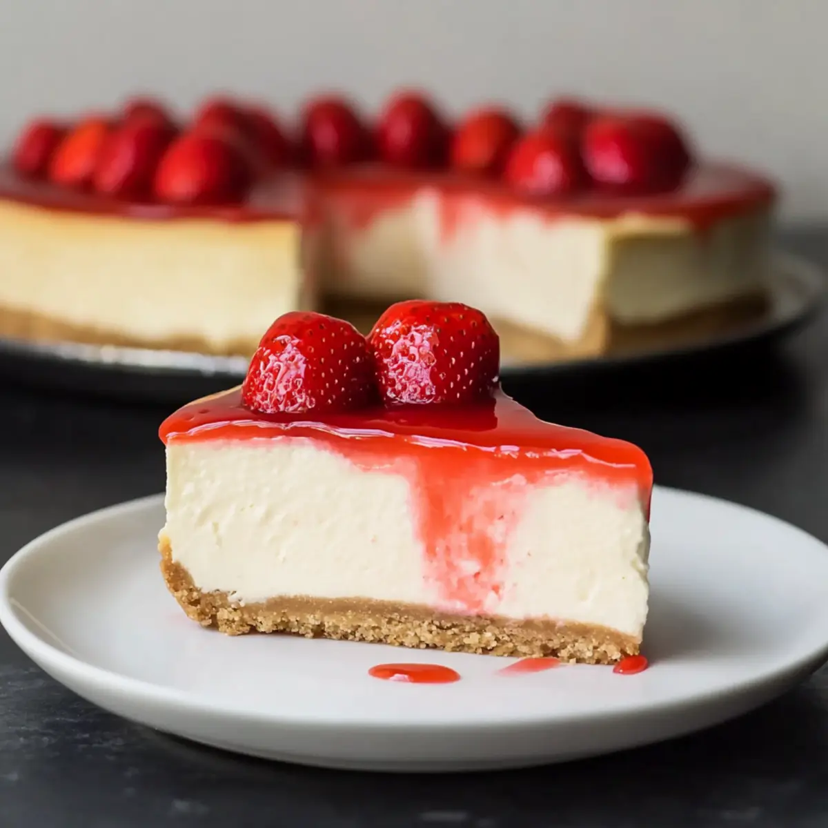 As I stood in my kitchen, the summer sun streaming through the window, the scent of vanilla and fresh strawberries filled the air, transporting me back to childhood gatherings. There’s something magical about a classic Strawberry Cheesecake that captures the essence of warm days spent with loved ones. This recipe not only showcases a rich, creamy filling that’s perfectly balanced by a homemade strawberry topping but also guarantees a delightful crunch thanks to the graham cracker crust. With minimal prep time and the option to make a no-bake version for those sweltering afternoons, it’s an irresistible choice for any get-together. Ready to create a dessert that’s sure to impress and satisfy your sweet cravings? Let’s dive into the world of homemade indulgence! Why is Strawberry Cheesecake a Must-Try? Irresistible Flavor: The combination of rich cream cheese and sweet strawberries is a delightful slice of heaven that your taste buds will thank you for. Simplicity with Style: You’ll be pleased to know that this recipe is straightforward enough for beginners yet impressive enough to wow your guests. Versatile Options: Want to mix it up? Try a no-bake version or mini cheesecakes for an easy, portable treat perfect for summer gatherings! Homemade Goodness: By making your own strawberry topping, you add a fresh twist that elevates this dessert above store-bought options. Crowd Favorite: With its vibrant colors and luscious flavors, this Strawberry Cheesecake will be the showstopper at any celebration, making it a go-to dessert for warm-weather parties. For more delicious variations, check out my recipes for Biscoff Cookie Cheesecake and Apple Crumble Cheesecake that are equally delightful! Strawberry Cheesecake Ingredients For the Crust Graham Cracker Crumbs – The base for delicious crunch; try gluten-free alternatives for a different taste. Granulated Sugar (for crust) – Adds sweetness and binds crumbs; swap with brown sugar for a deeper flavor. Unsalted Butter – Helps hold the crust together; can be replaced with coconut oil for a dairy-free option. For the Cheesecake Filling Cream Cheese – Key for a creamy texture; Neufchâtel cheese works for a lighter alternative. Granulated Sugar (for filling) – Sweetens the mixture to balance tanginess; consider maple syrup for a natural sweetener. Sour Cream – Enhances creaminess and tang; Greek yogurt can be used instead. Vanilla Extract – Elevates flavor; pure vanilla extract delivers the best taste. Salt – Balances sweet flavors; omit if making a low-sodium version. Eggs – Provides structure; substitute with flax eggs or applesauce for a vegan approach. For the Strawberry Topping Whole Strawberries – Fresh is best for flavor; frozen can work in a pinch. Cornstarch – Thickens the strawberry sauce; arrowroot or tapioca starch can also be used. Additional Sugar (for sauce) – Adjust this to taste based on strawberry ripeness. This classic Strawberry Cheesecake comes together beautifully with these ingredients, allowing you to impress your family and friends with a homemade masterpiece! Step‑by‑Step Instructions for Irresistible Strawberry Cheesecake with Homemade Topping Step 1: Prepare the Crust Begin by preheating your oven to 350°F (175°C). In a large mixing bowl, combine graham cracker crumbs, granulated sugar, and melted unsalted butter until the mixture resembles wet sand. Press this mixture firmly into the bottom of a 9-inch springform pan to form a compact crust. Bake in the preheated oven for 10 minutes, then remove and set aside to cool completely. Step 2: Make the Filling While the crust cools, prepare the creamy filling for your Strawberry Cheesecake. In a mixing bowl, beat together cream cheese, granulated sugar, sour cream, vanilla extract, and a pinch of salt until the mixture is smooth and creamy, ensuring there are no lumps. Gradually add in the eggs, mixing gently until just incorporated—avoid overbeating. Once combined, pour this luscious filling over the cooled crust. Step 3: Bake in Water Bath To bake the cheesecake evenly and prevent cracking, create a water bath. Place your filled springform pan inside a larger roasting pan, then fill the outer pan with hot water until it reaches halfway up the sides of the springform pan. Bake at 300°F (150°C) for 1 hour. After baking, turn off the oven but leave the cheesecake inside with the door closed for an additional hour to finish setting. Step 4: Cool and Chill Once the cheesecake has baked, carefully remove it from the water bath and let it cool on a wire rack for about 1.5 hours. After cooling, cover it with plastic wrap and refrigerate for at least 4 hours, or preferably overnight, to allow the flavors to meld and for the cheesecake to fully set. Step 5: Prepare the Topping As the cheesecake chills, prepare the homemade strawberry topping. In a saucepan, combine diced strawberries with cornstarch and additional sugar. Cook over medium heat, stirring frequently until the mixture thickens and becomes glossy, about 5-7 minutes. Remove from heat, stir in chopped fresh strawberries for added texture, and let the topping cool to room temperature before spreading it on the chilled cheesecake. Step 6: Serve and Enjoy When ready to serve your irresistible Strawberry Cheesecake, carefully run a knife along the edges of the springform pan before removing the sides. Gently slice into portions and serve chilled, optionally adding extra strawberry topping or a dollop of whipped cream on the side. Your Strawberry Cheesecake is now ready to delight family and friends! How to Store and Freeze Strawberry Cheesecake Fridge: Store leftovers covered in plastic wrap or airtight container for up to 4 days. This keeps your strawberry cheesecake fresh and creamy for whenever you crave a slice. Freezer: For longer storage, freeze cheesecake slices wrapped tightly in plastic wrap, then aluminum foil, for up to 3 months. Thaw in the refrigerator overnight before servi