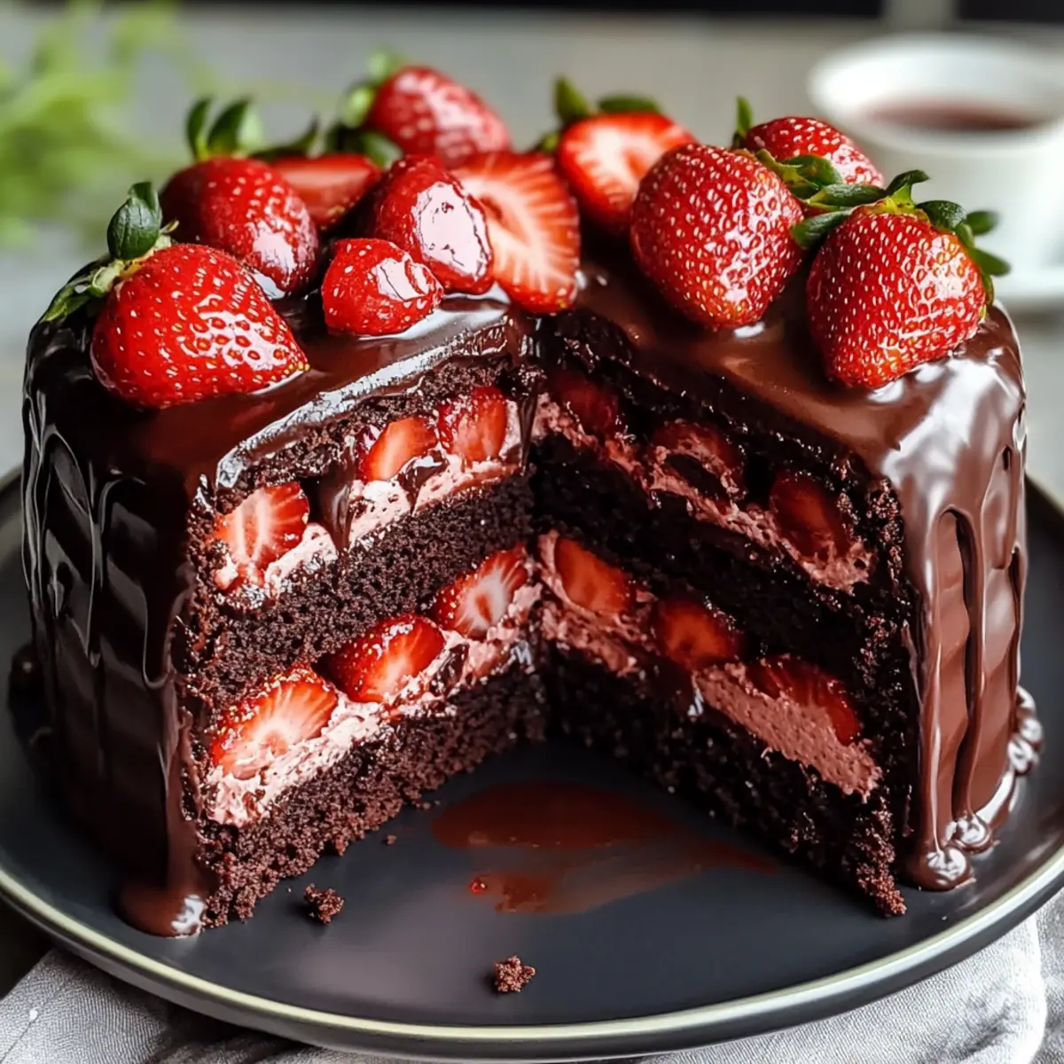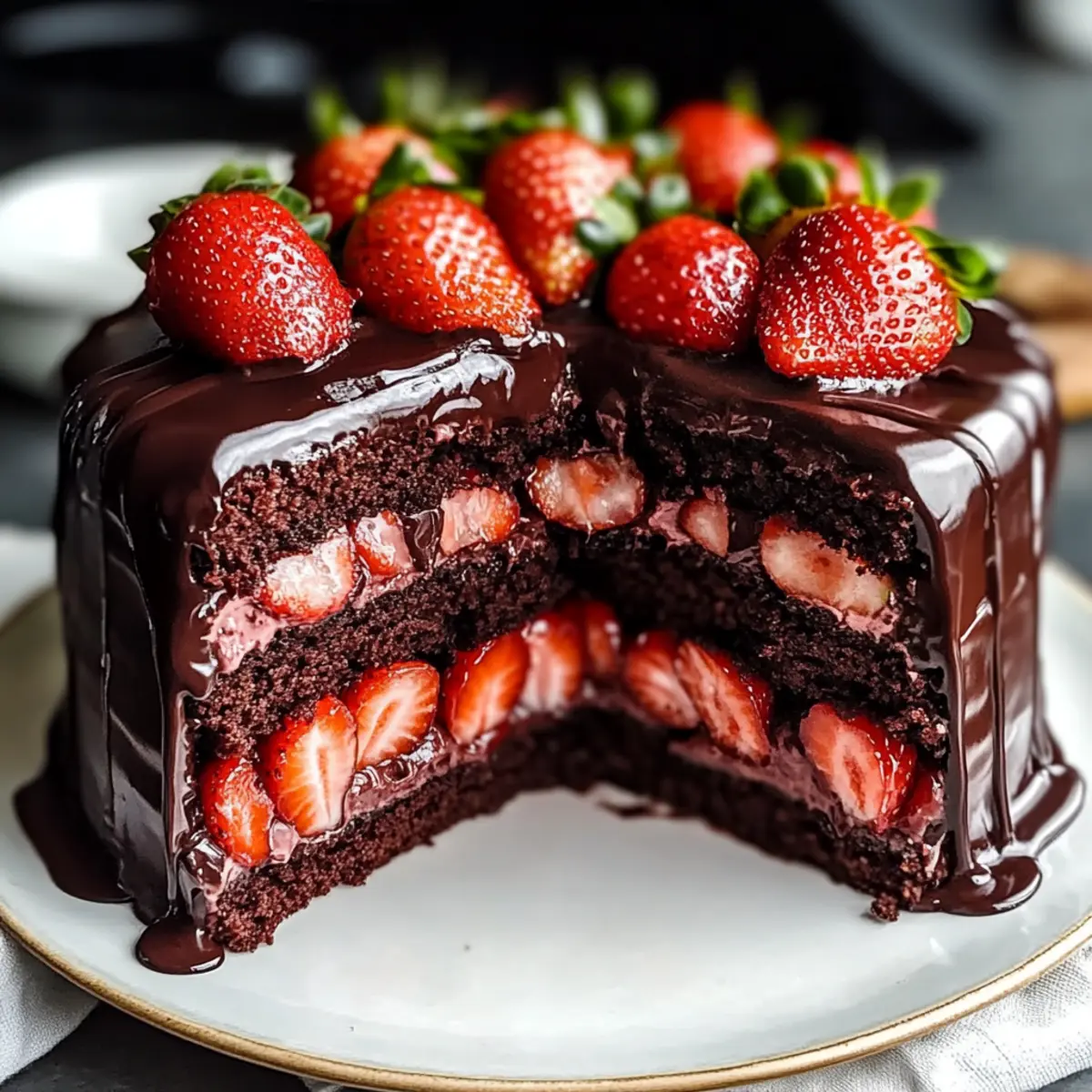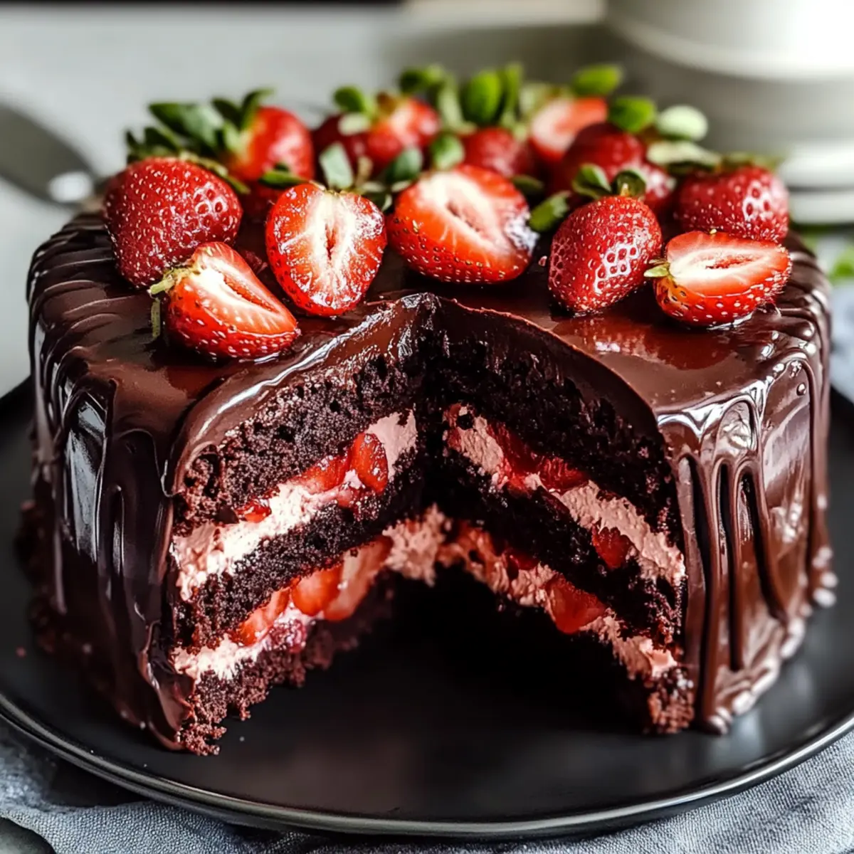 As I stood in the kitchen, the scent of chocolate wafted through the air, instantly transporting me to the cozy corners of my childhood home where desserts were always an adventure. Today, I’m excited to share my recipe for the Strawberry Chocolate Shell Cake, a showstopper that perfectly balances rich chocolate with the bright freshness of macerated strawberries. It’s not only a breeze to whip up but also makes for a stunning centerpiece at any gathering—a true crowd-pleaser. Whether you’re looking for a festive dessert for a celebration or a sweet indulgence to impress loved ones, this cake is both gluten-free and vegan-adaptable, ensuring everyone can enjoy a slice. Ready to dive into this deliciousness and elevate your dessert game? Let’s get baking! Why is This Cake a Must-Try? Irresistible Flavor: The combination of rich chocolate and tangy strawberries creates a harmonious balance that tantalizes your taste buds. Versatile Options: With gluten-free and vegan adaptations available, everyone can savor a slice. Spectacular Presentation: The glossy chocolate shell and vibrant strawberry layers make this cake a stunning centerpiece for any occasion. Easy to Make: Simple steps mean you don’t need extensive baking skills to impress your guests. Perfect for Celebrations: Whether it’s a birthday, anniversary, or just because—this cake elevates any gathering! Once you master this indulgent Strawberry Chocolate Shell Cake, you might also want to check out the indulgent Lemon Velvet Cake or the luscious Basque Burnt Cheesecake for your next sweet adventure! Strawberry Chocolate Shell Cake Ingredients • To create this delightful dessert, gather the following ingredients! For the Cake All-Purpose Flour – Gives the cake its structure; for a gluten-free option, substitute with a gluten-free flour blend. Granulated Sugar – Adds essential sweetness and moisture; you can switch to brown sugar for a deeper flavor. Unsweetened Cocoa Powder – Provides a rich chocolate flavor; Dutch-process cocoa offers a smoother taste. Baking Powder – A vital leavening agent; ensure it’s fresh for best results. Baking Soda – Enhances browning; it can be omitted if using self-rising flour. Salt – Balances the sweetness; sea salt can enhance the cake’s overall flavor. Buttermilk – Contributes moisture and tenderness; substitute with yogurt or milk mixed with vinegar for a similar effect. Vegetable Oil – Adds richness and moisture; melted coconut oil can introduce a tropical twist. Eggs – Provide structure and moisture; use flaxseed meal mixed with water as an excellent vegan alternative. Vanilla Extract – Adds depth of flavor; almond extract can give it a different twist, too. Boiling Water – Enhances the richness of the chocolate; it’s vital for achieving the right texture. For the Strawberry Filling Fresh Strawberries – The key to a sweet and tangy filling; substitute with any berries for a tasty variation. Lemon Juice – Brightens the strawberry mixture; lime juice works well if you want a different flavor. For the Chocolate Shell Dark Chocolate – Forms a glossy shell around the cake; semi-sweet chocolate makes for a delicious substitute. Coconut Oil – Helps create a smooth chocolate shell; vegetable oil can be used if necessary, though it may alter the texture. Step‑by‑Step Instructions for Strawberry Chocolate Shell Cake Step 1: Preheat and Prepare Preheat your oven to 350°F (175°C) and prepare your two 9-inch round cake pans. Grease the pans thoroughly with butter or oil, then lightly dust them with flour to prevent sticking. This initial step ensures that your delectable Strawberry Chocolate Shell Cake will release easily once baked. Step 2: Mix Dry Ingredients In a large mixing bowl, whisk together the all-purpose flour, granulated sugar, cocoa powder, baking powder, baking soda, and salt until well combined. This blend will create the foundation of your cake. Make sure to break any lumps in the cocoa and sugar, giving it a light, airy texture in preparation for baking. Step 3: Combine Wet Ingredients In a separate bowl, whisk together the buttermilk, vegetable oil, eggs, and vanilla extract until smooth and well incorporated. The combination of these wet ingredients brings moisture and richness to your Strawberry Chocolate Shell Cake. Mixing them thoroughly ensures an evenly blended batter that will bake beautifully. Step 4: Combine Mixtures Gradually pour the wet ingredients into the dry mixture, stirring gently to avoid overmixing. Once combined, carefully add the boiling water to the batter while mixing. The hot water enhances the richness of the chocolate, and your batter will become smooth and glossy, blending all flavors seamlessly. Step 5: Bake Divide the cake batter equally between the prepared pans and place them in the preheated oven. Bake for 30 to 35 minutes, or until a toothpick inserted into the center comes out clean. The cakes should rise beautifully and develop a rich, enticing chocolate aroma that fills your kitchen. Step 6: Macerate Strawberries While the cakes are baking, prepare the strawberry filling by slicing fresh strawberries and combining them with sugar and lemon juice in a bowl. Allow this mixture to sit for 15 to 20 minutes; the sugar will draw out the strawberry juices, creating a delicious, tangy filling for your Strawberry Chocolate Shell Cake. Step 7: Assemble Layers Once the cakes are fully baked, allow them to cool in the pans for about 10 minutes before transferring to wire racks. When cool, place one layer on a serving plate, drain the macerated strawberries, and spread them evenly on top. Add the second cake layer, then chill in the refrigerator for 30 minutes to set. Step 8: Prepare the Chocolate Shell To make the glossy chocolate shell for your cake, melt the dark chocolate and coconut oil together in a heatproof bowl over simmering water, stirring until smooth. Remove from heat and let it cool slightly; this wil
