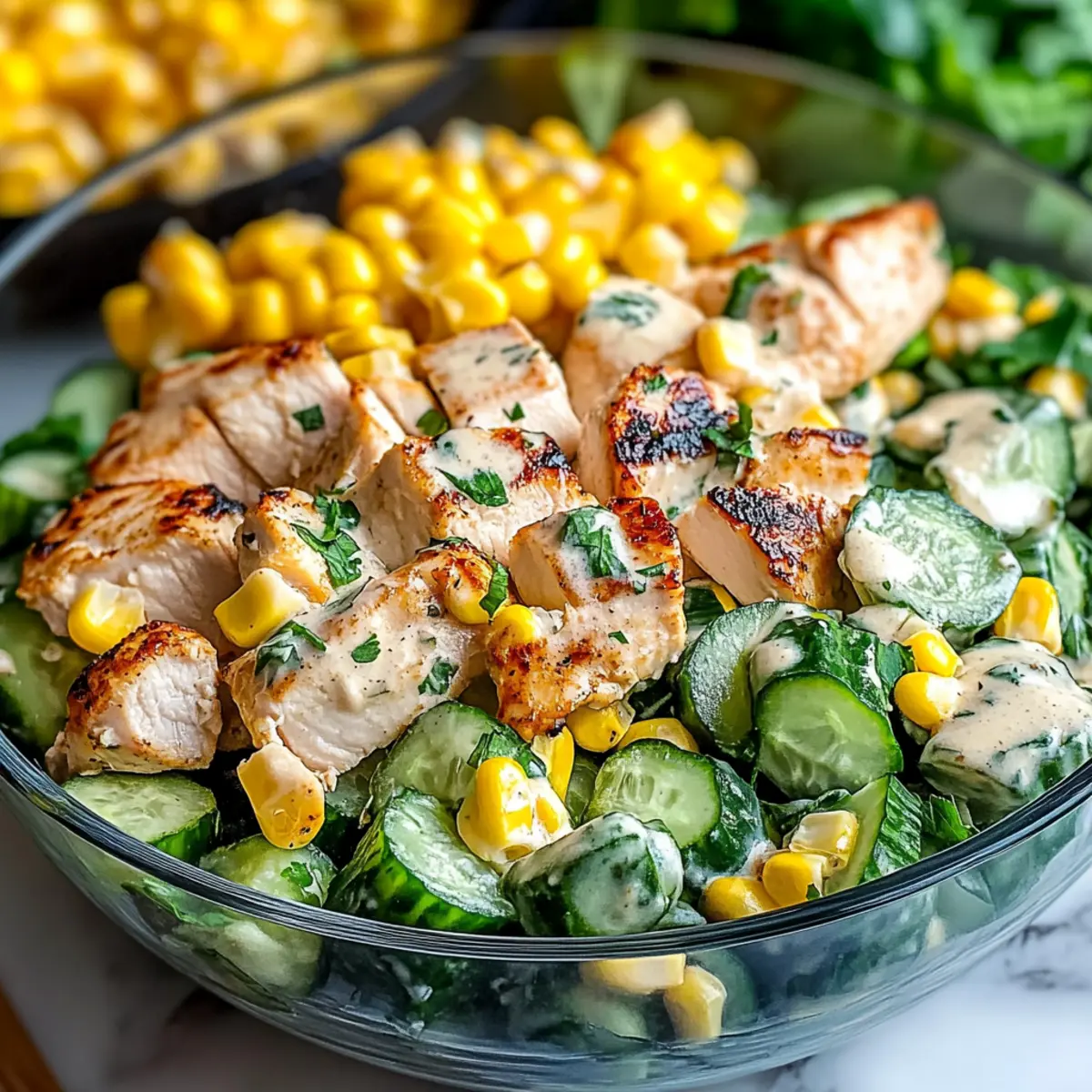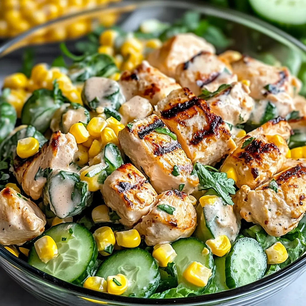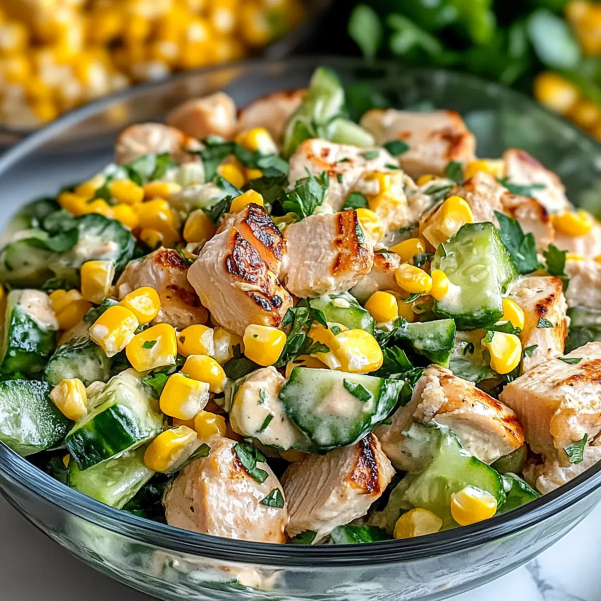 As I stood in my kitchen, the summer sun filtering through the window, I couldn’t help but think of how the simplest ingredients can bring a burst of joy to our meals. Enter the Street Corn Creamy Cucumber Chicken Salad—a dish that elevates any gathering with its vibrant colors and refreshing flavors. Packed with savory grilled chicken, crisp cucumbers, and sweet corn, it’s not just easy to prepare in about 30 minutes, but also gluten-free and made with fresh ingredients, making it a guilt-free choice for warm-weather dining. Whether you’re looking to impress guests or simply craving a satisfying meal that feels indulgent yet healthy, this salad is the answer. Curious about how to make this delightful dish come alive on your table? Let’s dive in! Why is this salad a must-try? Bursting with flavor: The combination of savory grilled chicken, sweet corn, and crunchy cucumbers creates a delightful medley in every bite. Fast and simple: Ready in just 30 to 45 minutes, this salad is perfect for busy summer days. Versatile and adaptable: Add extras like fresh avocado or colorful bell peppers to customize it to your taste. Healthy and satisfying: Packed with protein and vitamins, you’ll feel good serving this nutritious dish at any gathering. Crowd-pleaser: Whether it’s a barbecue or a family dinner, this salad will impress your guests and have them asking for seconds! For more refreshing ideas, check out my Chicken Salad Light or a comforting Corn Chowder. Street Corn Creamy Cucumber Chicken Salad Ingredients • Discover the fresh ingredients that create a perfect summer dish! For the Salad Grilled or Roasted Chicken (2 cups) – Provides protein and savory depth; leftover rotisserie chicken makes it a breeze. Sweet Corn (1 cup) – Adds sweetness and crunch; grab grilled or canned corn, ensuring to drain canned well. Cucumber (1 large) – Offers refreshing crunch and hydration; consider English cucumbers for fewer seeds. Red Onion (½ cup, finely chopped) – Contributes sharpness and color; soak in cold water to mellow the flavor. For the Dressing Mayonnaise (½ cup) – Acts as the rich, creamy base; lite mayonnaise can lighten up this dish. Greek Yogurt (2 tablespoons) – Enhances creaminess with tang; substitute with sour cream if preferred. Lime Juice (1 tablespoon) – Adds acidity and brightness; fresh lime is best for that zesty kick. Cilantro (1 tablespoon, chopped) – Imparts freshness; feel free to omit if cilantro’s not your favorite. Smoked Paprika (1 teaspoon) – Provides a smoky depth; regular paprika can work as a substitute. Salt (1 teaspoon, to taste) and Black Pepper (½ teaspoon) – Essential for seasoning; tweak according to your taste. For Garnish (Optional) Crumbled Feta Cheese – Adds a salty, creamy finish; skip for a dairy-free version of this Street Corn Creamy Cucumber Chicken Salad. Step‑by‑Step Instructions for Street Corn Creamy Cucumber Chicken Salad Step 1: Cook Chicken If you’re not using pre-cooked chicken, preheat your grill or oven to medium-high heat (about 375°F). Grill or roast your chicken for 6-8 minutes per side, or until the internal temperature reaches 165°F. Once cooked, remove it from heat, let it rest for a few minutes, and then dice it into bite-sized pieces for your Street Corn Creamy Cucumber Chicken Salad. Step 2: Prepare Vegetables While your chicken is cooling, wash and dice the cucumber into bite-sized pieces. If using canned corn, drain it well and set aside. Finely chop the red onion and cilantro, then soak the onion in cold water for about 10 minutes to mellow its sharpness; this step is essential to enhance the flavors in your salad. Step 3: Mix Dressing In a large mixing bowl, combine ½ cup of mayonnaise, 2 tablespoons of Greek yogurt, and 1 tablespoon of fresh lime juice. Sprinkle in 1 teaspoon of smoked paprika, along with salt and pepper to taste. Whisk until the dressing is smooth and creamy, ensuring all the ingredients are well incorporated, creating a delicious base for the Street Corn Creamy Cucumber Chicken Salad. Step 4: Combine Ingredients Add the diced chicken, sweet corn, cucumber, soaked onion, and chopped cilantro into the bowl with your dressing. Gently toss everything together until all ingredients are well-coated with the creamy dressing. Take care not to overmix, preserving the crunch of the vegetables while ensuring every bite of your salad bursts with flavor. Step 5: Chill Cover the bowl with plastic wrap or a lid, and refrigerate your salad for 15 to 30 minutes. This chilling step allows the flavors to meld beautifully and enhances the overall taste experience of the Street Corn Creamy Cucumber Chicken Salad. When ready to serve, give it a gentle stir before plating. Step 6: Serve & Garnish Scoop the chilled salad into serving bowls or a large platter, and if desired, sprinkle crumbled feta cheese on top for an added touch of creaminess. This Street Corn Creamy Cucumber Chicken Salad is best enjoyed cold, making it a perfect dish for any summer gathering or family meal. How to Store and Freeze Street Corn Creamy Cucumber Chicken Salad Refrigerator: Store in an airtight container for up to 3 days. For the best texture, add cucumbers right before serving. Freezer: It’s not recommended to freeze this salad, as the creaminess may separate upon thawing, affecting the texture. Reheating: If made in advance and kept in the fridge, simply give it a good stir before serving. Fresh ingredients bring the best flavors to this salad! Make-Ahead Tips: You can prepare the chicken and chop the veggies a day ahead. Just combine everything, except the cucumbers, right before serving to maintain that delightful crunch. Street Corn Creamy Cucumber Chicken Salad Variations Want to add a personal twist to your Street Corn Creamy Cucumber Chicken Salad? Here are some fun variations to elevate your dish! Vegetarian Delight: Substitute the grilled chicken with chickpeas for a hearty and protein-packed ve