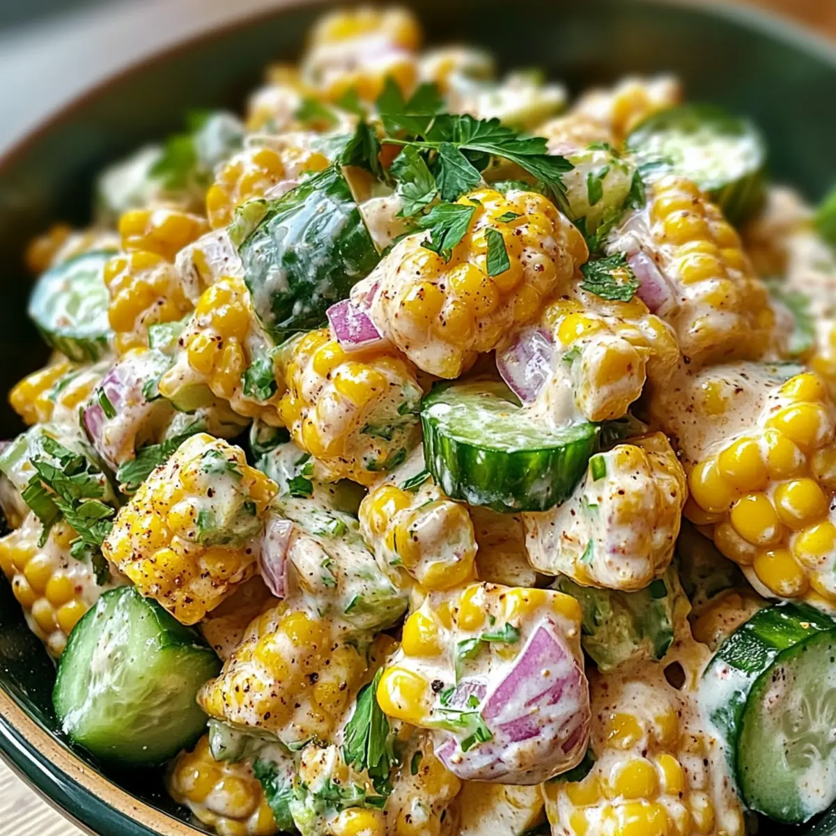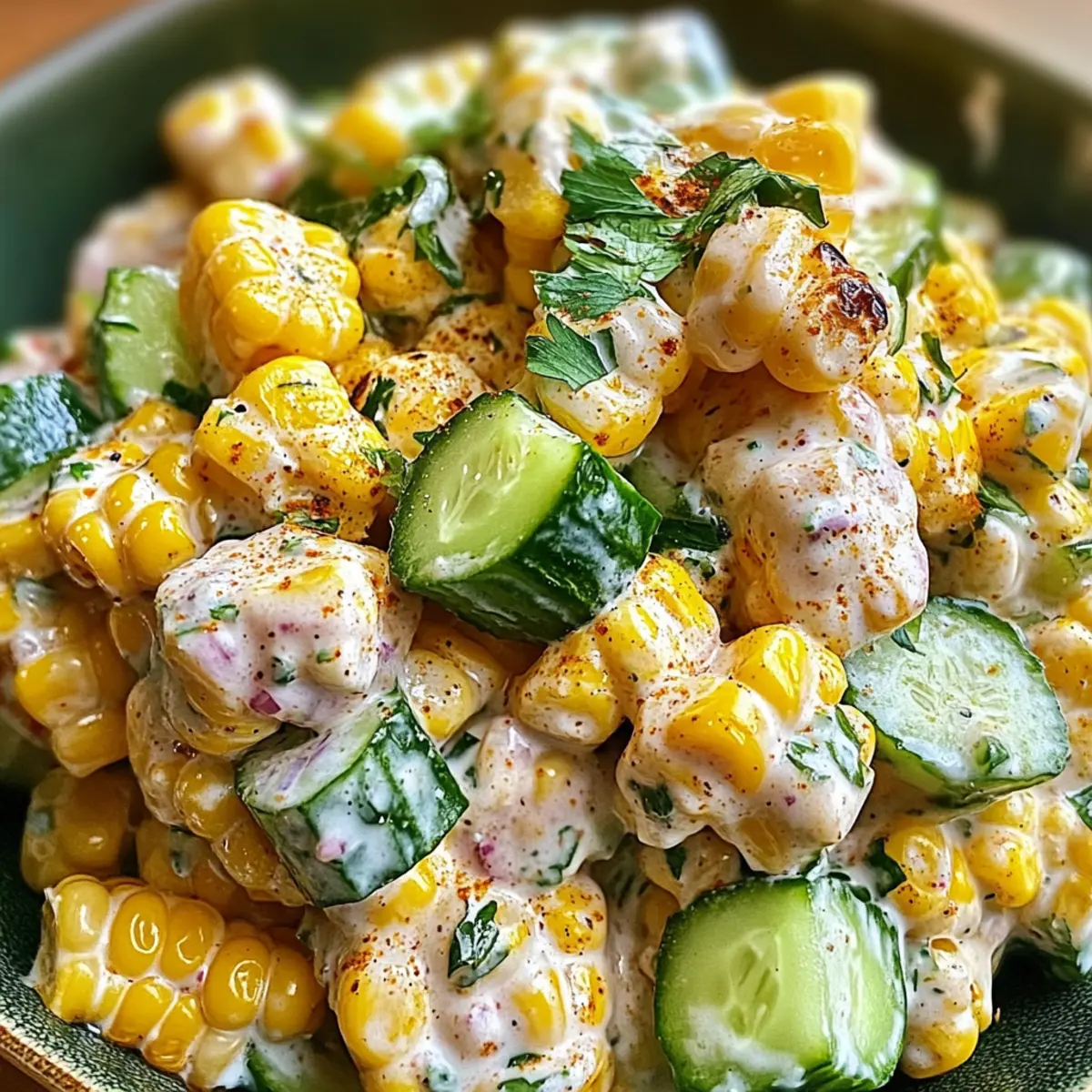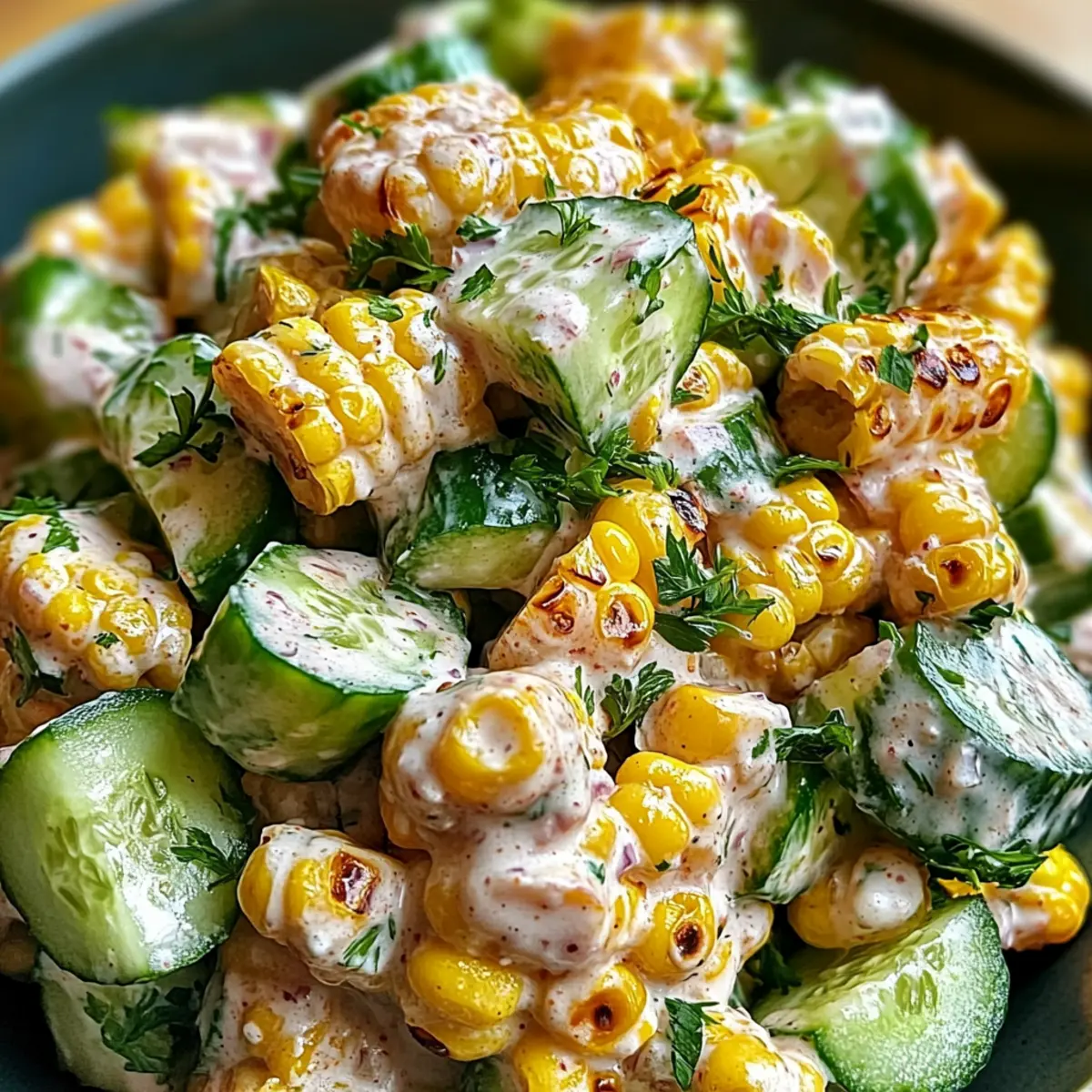 As summer sun spills into our kitchens, I find myself longing for something light and colorful that captures the essence of the season. Enter my Smoky Street Corn Creamy Cucumber Salad, a dish bursting with life and flavor that always draws people in. With the smoky warmth of grilled corn mingling perfectly with the crispness of fresh cucumbers, this salad not only brings vibrant colors to your table but is also a breeze to prepare. It’s a fantastic make-ahead option, great for barbecues or simply as a refreshing light meal. Plus, its creamy, zesty dressing featuring Greek yogurt makes it a healthier twist on traditional salads. Are you ready to make a summer staple that impresses your family and friends? Let’s dive into this delightful recipe! Why is This Salad a Must-Try? Vibrant, Fresh Ingredients: The combination of smoky grilled corn and crisp cucumber creates a colorful dish that is as pleasing to the eye as it is to the palate. Healthier Twist: With a creamy dressing made from Greek yogurt, this salad keeps it light without sacrificing flavor. Perfect for those looking to stay healthy! Make-Ahead Marvel: You can easily prepare this salad in advance, allowing the flavors to meld beautifully, making it ideal for meal prep or last-minute gatherings. Crowd-Pleasing Flavor: Bursting with zesty lime and rich herbs, this dish will be the star of any barbecue or summer party, perfect when served alongside grilled meats or as a refreshing stand-alone option. Endless Variations: Feel free to customize it! Add diced bell peppers or avocados for extra crunch, swap in plant-based alternatives for a vegan-friendly twist, or infuse it with herbs like mint for a unique take. Discover even more delicious options with the Chicken Salad Light or a warm bowl of Corn Chowder. Street Corn Creamy Cucumber Salad Ingredients For the Salad • Grilled Corn on the Cob – This ingredient provides a smoky flavor and texture; opt for fresh corn for grilling instead of canned for the best taste. • Cucumber – Adds crispness and freshness; English cucumbers are a great choice with fewer seeds for a smoother salad. • Red Onion – Delivers sharpness and vibrant color; substitute with green onions if you prefer a milder flavor. • Fresh Cilantro – Contributes a bright herbal note; use parsley as a substitute if cilantro isn’t your thing. For the Dressing • Greek Yogurt – Serves as the creamy base of the dressing, boosting nutrition; swap it for dairy-free yogurt for a vegan version. • Mayonnaise – Enhances the creamy texture; you can use more Greek yogurt or vegan mayo for a lighter dressing. • Minced Garlic – Adds depth and aroma; garlic powder can be used as a less intense substitute. • Lime Juice – Provides acidity and brightness; feel free to swap in lemon juice if that’s what you have on hand. • Chili Powder – Brings warmth and spice; paprika is a great alternative for a milder flavor. • Salt & Pepper – Essential for seasoning; adjust according to your taste preference. With these Street Corn Creamy Cucumber Salad ingredients, you’re well on your way to creating a delicious and refreshing dish that embodies the flavors of summer! Step‑by‑Step Instructions for Street Corn Creamy Cucumber Salad Step 1: Grill the Corn Preheat your grill to medium-high heat, around 400°F (200°C). Place the corn cobs directly on the grill grates and cook for 10–12 minutes, turning occasionally, until the kernels are tender and slightly charred. You want to achieve that beautiful golden-brown color that brings out the smoky flavor, so keep an eye on them! Step 2: Cut the Corn Kernels Once the corn is grilled, remove it from the grill and let it cool for a few minutes until it’s safe to handle. Using a sharp knife, carefully slice the kernels off the cob and transfer them to a large mixing bowl. You should have about two to three cups of sweet, smoky kernels ready for your Street Corn Creamy Cucumber Salad. Step 3: Prepare the Vegetables Add the diced cucumber, finely chopped red onion, and fresh cilantro to the bowl with the corn. The crispness of the cucumber and the sharpness of the onion will complement the smoky corn beautifully. Toss gently to combine, ensuring all the vibrant colors are mixed together, as this salad is as much about presentation as it is about flavor. Step 4: Whisk the Dressing In a separate bowl, whisk together the Greek yogurt, mayonnaise, minced garlic, lime juice, chili powder, salt, and pepper until smooth. This creamy dressing should have a well-balanced flavor, with the zesty lime and aromatic garlic shining through. Taste and adjust the seasoning if needed, as this dressing will enhance the entire Street Corn Creamy Cucumber Salad. Step 5: Combine Salad and Dressing Pour the creamy dressing over the corn and vegetable mixture in the large bowl. Using a spatula, gently toss everything together until all the ingredients are evenly coated with the dressing. This ensures that each bite of Salad is bursting with flavor while maintaining that delightful crunch. Step 6: Chill and Serve Cover the bowl with plastic wrap or a lid and refrigerate the salad for at least 30 minutes. This chilling time allows the flavors to meld beautifully, enhancing the overall taste of your Street Corn Creamy Cucumber Salad. Before serving, give it a good stir and taste again to adjust seasoning if necessary. Garnish as desired, and enjoy this refreshing dish! Street Corn Creamy Cucumber Salad Variations Feel free to make this recipe your own with these delightful twists and substitutions. Add Crunch: Incorporate diced bell peppers or avocado for an extra layer of flavor and nutrition. The colors will brighten the dish, making it even more inviting. Vegan Version: Swap Greek yogurt for a plant-based yogurt and use vegan mayonnaise. Enjoy a creamy salad without the dairy, perfect for your vegan friends! Herb Fusion: Experiment with different herbs like mint or dill for a refres
