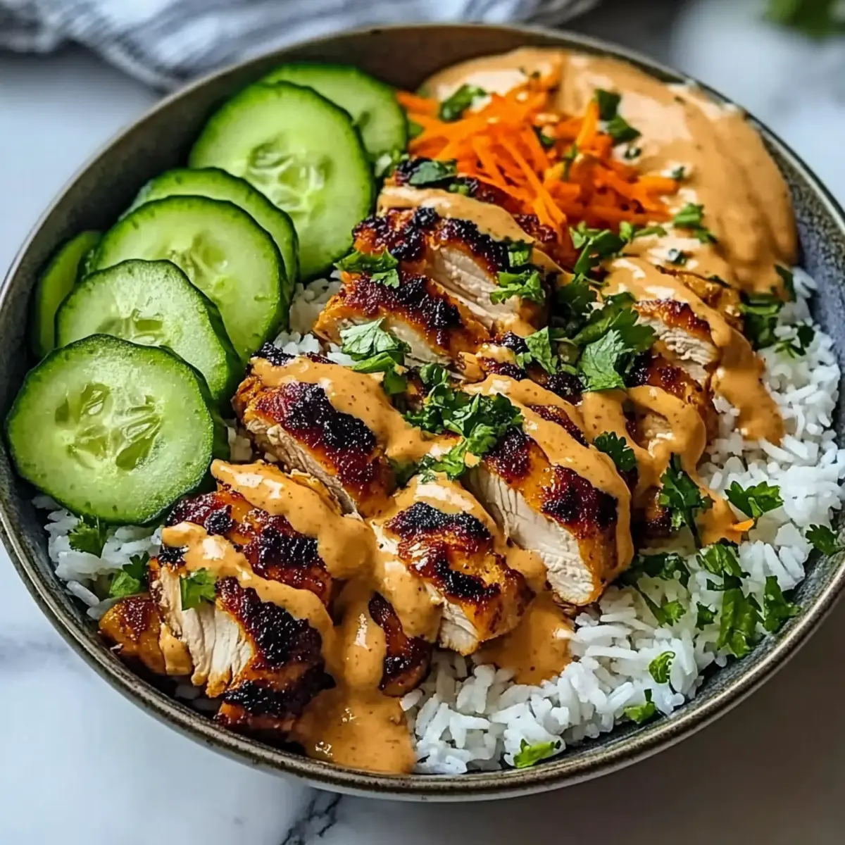 4. Portion warm jasmine rice into serving bowls, layer with glazed chicken, fresh cucumber, shredded carrots, and drizzle with coconut lime sauce. Garnish with cilantro, green onions, and sesame seeds.