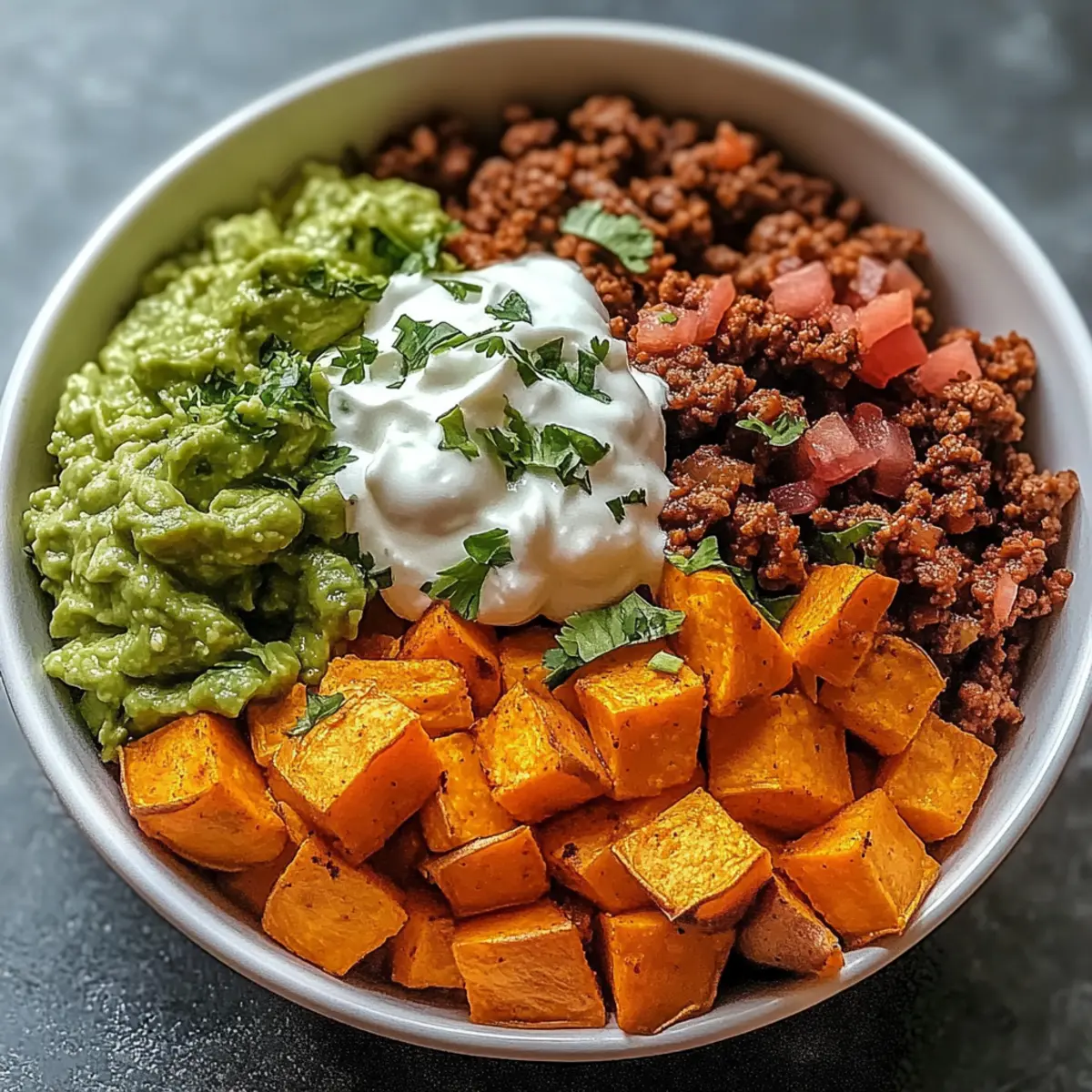 “Have you ever felt the joy that comes from a meal that not only satisfies your hunger but also wraps you in a comforting embrace? Enter the Sweet Potato Taco Bowl—a lively fusion of tender sweet potatoes, your choice of protein, and vibrant toppings that promise a burst of color and flavor with every bite. What I love most about this recipe is its incredible versatility; it’s meal prep-friendly and can easily accommodate various dietary preferences, from hearty meat options to fulfilling vegetarian alternatives. Whether it’s a busy weeknight or a lazy Sunday, this healthy comfort food is here to save the day. Ready to spice up your dining routine and explore its customizable magic?” Why Choose the Sweet Potato Taco Bowl? Versatile Options: Whether you prefer ground beef, turkey, lentils, or a veggie-packed mix, this recipe adapts beautifully to your taste buds. Time-Saving Meal Prep: Perfect for busy schedules, prepare components ahead of time to create satisfying meals throughout the week. Nutrient-Dense Delight: Packed with fiber and vitamins, the sweet potatoes serve as a healthful base that fills you up without weighing you down. Bursting with Flavor: Smoky paprika and zesty toppings elevate ordinary tacos into a lively bowl full of exciting tastes. Family-Friendly Appeal: This dish is a sure hit with everyone, making it ideal for cozy family dinners or entertaining guests. Don’t forget to check out other crowd-pleasers like the Sweet Chili Chicken and Street Corn Bowl to keep your table vibrant and exciting! Sweet Potato Taco Bowl Ingredients • Unleash the flavors with these essential ingredients! For the Base Sweet Potatoes – Provide natural sweetness and fiber; try butternut squash for a delicious twist. Olive Oil – Essential for roasting, enhancing flavor; avocado oil works great at high temperatures. For the Protein Ground Beef – Hearty base for a classic taco bowl; swap with ground turkey or lentils for a veggie-friendly option. Taco Seasoning – Adds classic taco flavor; homemade versions are quick and easy to whip up. For the Toppings Pico de Gallo – Fresh and zesty, adds a delightful crunch; store-bought salsa is a fine time-saver. Guacamole – Creamy and rich, elevates each bite; a simple mash with avocado and lime works wonders. Sour Cream – Tangy element that complements the other flavors; use cashew cream for a dairy-free alternative. Cilantro – Fresh garnish that brightens the dish and enhances its appearance. Lime Wedges – Adds a burst of acidity that freshens the flavors. Tortilla Chips – Optional for scooping, adding a fun crunch to your bowl. Experience the joy of creating the ultimate Sweet Potato Taco Bowl as you explore its endless possibilities! Step‑by‑Step Instructions for Sweet Potato Taco Bowl Step 1: Roast Sweet Potatoes Preheat your oven to 425°F (220°C). Begin by peeling and cubing the sweet potatoes into uniform pieces for even cooking. Toss them in a bowl with olive oil, smoked paprika, salt, and pepper, ensuring each piece is well-coated. Spread the sweet potato cubes in a single layer on a baking sheet. Roast for 15 minutes, then flip them and roast for another 10-15 minutes until they are golden and tender, with a slightly caramelized exterior. Step 2: Cook Beef While the sweet potatoes are roasting, heat a skillet over medium heat. Add the ground beef to the skillet, breaking it apart with a spatula as it cooks. Stir continuously for about 5-7 minutes until evenly browned. Once browned, drain any excess fat, then sprinkle in the taco seasoning. Add 2 tablespoons of water, stir well, and let it simmer for an additional 2-3 minutes until everything is heated through and well combined. Step 3: Prepare Toppings As the beef cooks, prepare the toppings for your Sweet Potato Taco Bowl. In a mixing bowl, combine diced tomatoes, diced onion, cilantro, lime juice, and a pinch of salt to create your pico de gallo. For guacamole, smash ripe avocados in a separate bowl with lime juice and salt until creamy. If desired, get your sour cream ready by simply placing it in a serving dish for easy access. Step 4: Assemble Bowls Now it’s time to assemble the savory Sweet Potato Taco Bowls. Start by placing a generous portion of the roasted sweet potatoes at the base of each bowl. Layer the seasoned ground beef on top, then spoon dollops of pico de gallo and guacamole over the beef. Add a dollop of sour cream for a creamy finish. Feel free to customize these layers based on your flavor preferences. Step 5: Garnish and Serve To bring your Sweet Potato Taco Bowls to life, sprinkle fresh cilantro over the top for a burst of color and flavor. Serve with lime wedges on the side, which can be squeezed over the bowls for added brightness. If you like a crunchy texture, toss in some tortilla chips for scooping up all the delicious components of the dish. Enjoy your colorful and satisfying meal! Storage Tips for Sweet Potato Taco Bowl Fridge: Store your Sweet Potato Taco Bowl components in separate airtight containers for up to 4 days to maintain freshness and flavor. Freezer: You can freeze roasted sweet potatoes and cooked beef for up to 3 months. Thaw in the fridge overnight before reheating for best results. Reheating: To reheat, use the microwave for individual portions or warm everything in the oven at 350°F (175°C) until heated through. Assembly: For optimal taste and texture, assemble your Sweet Potato Taco Bowl fresh just before serving to enjoy the vibrant flavors and crispy elements. What to Serve with Sweet Potato Taco Bowl There’s nothing like crafting a complete meal around your vibrant bowl of flavors, where every bite feels like a delightful celebration. Creamy Avocado Salad: A refreshing and cool side that brings a luscious creaminess to balance the spiciness of your bowl. Crispy Churros: Sweet and crispy, churros add a fun element of indulgence, perfect for those who love a sweet finish to their savory meal. Zesty Co
