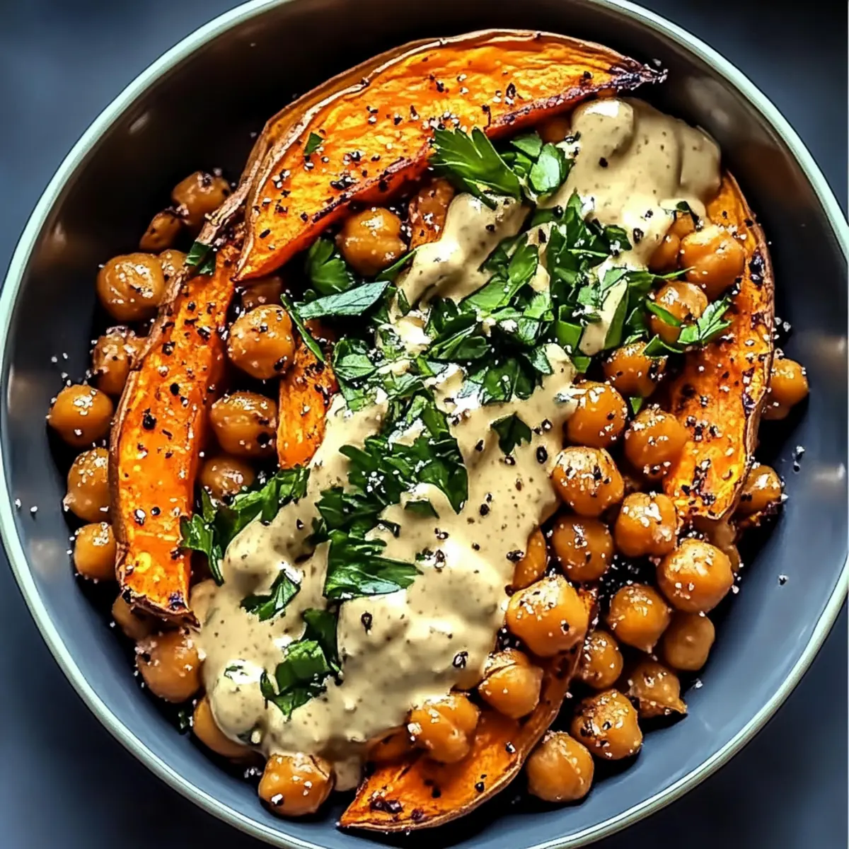 Once your sweet potatoes and chickpeas are perfectly roasted, take them out of the oven. Drizzle the creamy tahini sauce generously over the warm vegetables and sprinkle with freshly chopped parsley or cilantro for garnish. This vibrant and nutritious dish of sweet potatoes with tahini butter chickpeas is now ready to be savored!