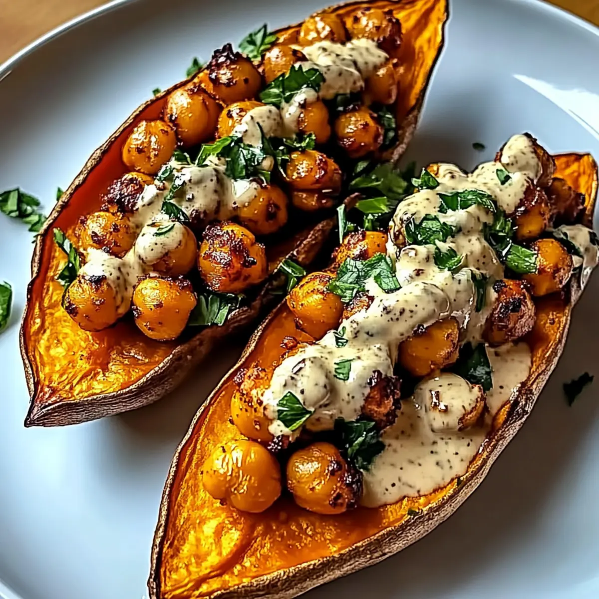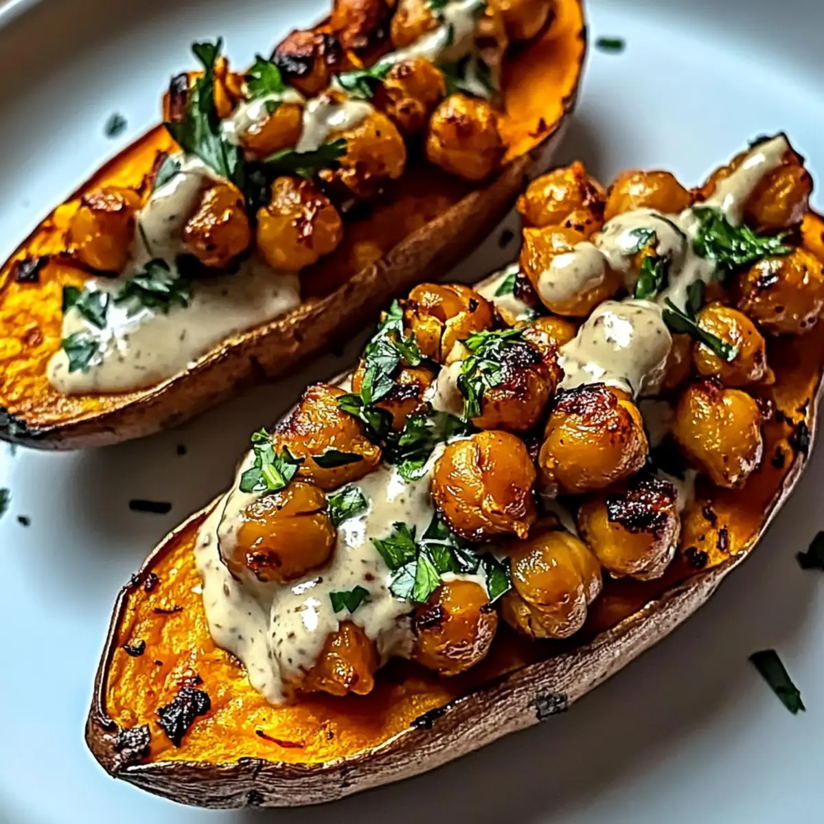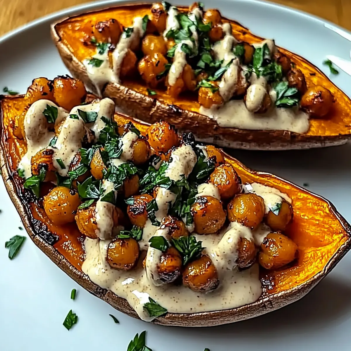 As I pulled a tray of roasted sweet potatoes from the oven, the inviting aroma wrapped around me like a warm hug. This recipe for Sweet Potatoes with Tahini Butter Chickpeas fills the kitchen with comfort and nourishment, making it perfect for cozy weeknights or meal prep. The beauty of this plant-based dish lies not only in its delightful flavors but also in its simplicity—it’s gluten-free and meal prep-friendly, letting you whip up a healthy dinner in no time. Whether you’re a passionate home chef or just looking for a new way to enjoy sweet potatoes, this recipe invites creativity with customizable toppings and spices. What flavors will you explore as you make this delicious dish your own? Why will you love this dish? Flavorful Fusion: The combination of sweet potatoes and tahini butter chickpeas creates a delightful harmony of tastes and textures that will excite your palate. Easy to Customize: With simple swaps like using butternut squash instead of sweet potatoes or adding spices like smoked paprika, your culinary creativity is unlimited. Meal Prep Marvel: Perfect for busy lifestyles, this dish is not only easy to make but also keeps well, allowing for quick reheats on hectic weeknights. Nutritious and Wholesome: Packed with plant-based protein and essential vitamins, it’s an ideal choice for those looking to nourish their bodies without sacrificing flavor. Crowd-pleaser: Whether serving family or guests, this dish is sure to impress with its vibrant colors and satisfying components. You might also enjoy serving it with a side of Lemon Garlic Butter Chicken or pairing it with a fresh quinoa salad for a complete meal! Sweet Potatoes with Tahini Butter Chickpeas Ingredients For the Sweet Potatoes • Sweet Potatoes – Roasted for incredible sweetness; feel free to swap with butternut squash for a similar texture. • Olive Oil – Enhances roasting and adds flavor; use extra virgin olive oil for the best results. • Salt/Pepper – Adjust to preference for seasoning; sea salt enhances flavor better than table salt. For the Tahini Sauce • Tahini – Creamy paste made from sesame seeds for the sauce; almond or cashew butter can be used if tahini is unavailable. • Lemon Juice – Adds freshness to the tahini sauce; lime juice can be substituted for a different citrus flavor. • Water – Adjusts the tahini sauce to desired thickness; using cold water results in a smoother consistency. For the Chickpeas • Chickpeas – Provides protein and texture, either canned or cooked from scratch; dry cooked chickpeas thoroughly for maximum crispiness. • Garlic Powder – Enhances the flavor of roasted chickpeas; fresh minced garlic can be used for a stronger flavor. Toppings (Optional) • Fresh Parsley – Adds color and flavor; substitute with cilantro for a different flavor profile. • Chili Flakes – Adds heat; adjust quantity based on your spice tolerance. Feel free to experiment and make this Sweet Potatoes with Tahini Butter Chickpeas your own! Step‑by‑Step Instructions for Sweet Potatoes with Tahini Butter Chickpeas Step 1: Preheat and Prepare Begin by preheating your oven to 400°F (200°C). While the oven heats, peel and cube your sweet potatoes into even pieces to ensure consistent roasting. Toss the cubes in a large mixing bowl with olive oil, salt, and any desired spices until well coated. Spread the sweet potatoes evenly on a baking sheet, making sure they have space to roast evenly. Step 2: Roast the Sweet Potatoes Place the baking sheet in the preheated oven and roast the sweet potatoes for about 40-45 minutes. Halfway through, give them a gentle flip to encourage even browning. You’ll know they’re done when they are fork-tender and golden around the edges—this will ensure a deliciously sweet flavor throughout your Sweet Potatoes with Tahini Butter Chickpeas. Step 3: Prepare the Chickpeas While the sweet potatoes are roasting, rinse and drain a can of chickpeas, patting them dry with a clean kitchen towel. In a mixing bowl, toss the chickpeas with olive oil, garlic powder, salt, and pepper until nicely coated. This step is crucial for achieving crispy chickpeas, which will complement the sweet potatoes beautifully. Step 4: Roast the Chickpeas Spread the seasoned chickpeas on a separate baking sheet. Place this sheet in the oven alongside the sweet potatoes during the last 25-30 minutes of roasting. Stir the chickpeas halfway through to ensure they cook evenly. They should come out golden and crunchy, adding a delightful texture to your Sweet Potatoes with Tahini Butter Chickpeas. Step 5: Whisk the Tahini Sauce In a small bowl, whisk together tahini, fresh lemon juice, and cold water to create a creamy sauce. Continue whisking until smooth, adjusting the consistency with more water if necessary. Taste the sauce, adding salt or any other seasonings to enhance the flavor. This tangy, nutty sauce will elevate your dish and bring it all together. Step 6: Assemble and Serve Once both the sweet potatoes and chickpeas are perfectly roasted, it’s time to assemble your dish. Layer the roasted sweet potatoes on a serving plate, top with the crispy chickpeas, and generously drizzle with the tahini sauce. For an added touch, garnish with fresh parsley or a sprinkle of chili flakes for a little heat—your Sweet Potatoes with Tahini Butter Chickpeas are now ready to enjoy! What to Serve with Sweet Potatoes with Tahini Butter Chickpeas Elevate your cozy meal experience by adding these delightful side dishes that bring balance and flavor to your sweet potato creation. Garlic Roasted Broccoli: Adds a crisp, vibrant element that complements the sweet potatoes’ richness; a fantastic nutrient boost! Quinoa Salad: A refreshing, protein-packed salad with fresh herbs and citrus that contrasts wonderfully with the sweetness of the dish. Chickpea Salad: Pairing the same main ingredient enhances flavor while adding a refreshing twist; toss in cucumbers and tomatoes for crun