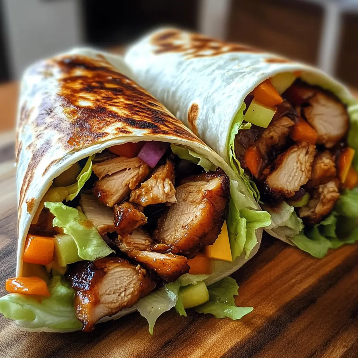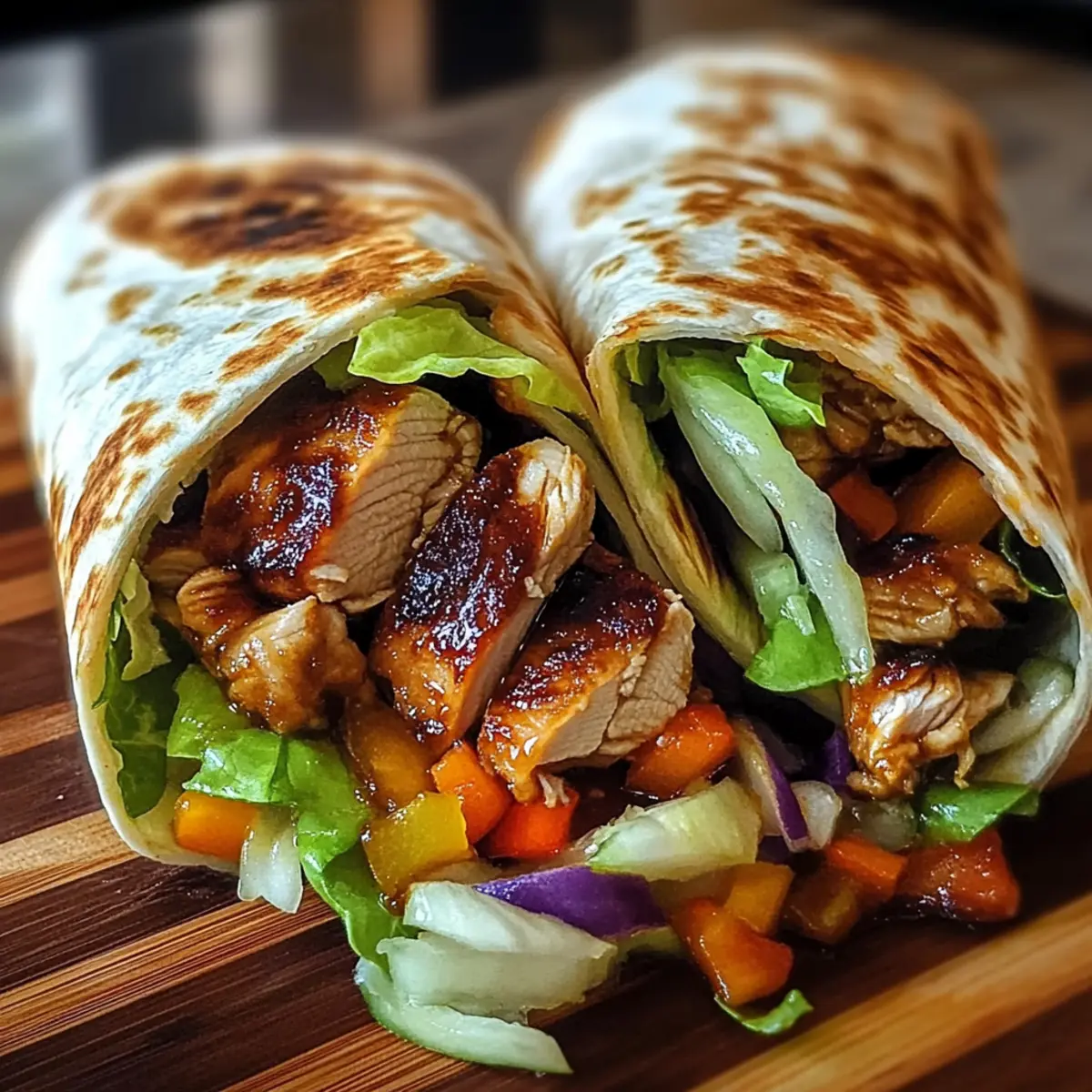 Every busy evening seems to pose the same question: what should I make for dinner? Enter the Quick and Versatile Teriyaki Chicken Wrap—a delightful solution to your weeknight dilemma. With tender marinated chicken, crispy fresh veggies, and a sweet-savory teriyaki sauce all tucked inside a soft tortilla, this dish is not just quick to whip up; it’s incredibly customizable too! Whether you’re a fan of crispy lettuce or zesty bell peppers, you’re free to play with your favorite ingredients. Plus, it’s family-friendly and perfect for both adults and kids alike. Feeling adventurous? You can swap in shrimp, tofu, or even add a fun drizzle of sriracha for some extra kick! So, what delicious twist will you add to your wrap? Why Try This Teriyaki Chicken Wrap? Simplicity at its finest: You can whip this up in less than 30 minutes, making weeknight cooking a breeze! Customizable options: Cater to your taste by swapping proteins like shrimp or tofu, or mix in your favorite veggies for personal flair. Family-friendly appeal: Kids and adults alike will adore the sweet-savory flavors, ensuring a meal everyone will enjoy. Fresh ingredients: With crisp vegetables and vibrant colors, it’s a wholesome option you can feel good about serving. Versatile serving ideas: Pair with sweet potato fries for a complete meal or enjoy alongside a light cucumber salad for a refreshing twist. Teriyaki Chicken Wrap Ingredients For the Chicken Marinade • Chicken Breast – Main protein source; use thighs for a juicier option. • Teriyaki Sauce – Provides sweet and savory flavor; consider homemade for freshness. • Soy Sauce – Enhances umami depth; low-sodium varieties work well too. • Honey – Adds sweetness; substitute with maple syrup for a vegan option. • Sesame Oil – Coats the meat in a nutty aroma; can be swapped for vegetable oil. For the Wrap • Tortillas – The base of your wrap; flour or whole wheat are both excellent choices. • Fresh Vegetables (Lettuce, Carrots, Bell Peppers, Green Onions) – Adds crunch and nutrition; get creative with your veggie choices! Optional Add-ins • Avocado – Gives a creamy texture; perfect for those who love richer flavors. • Sriracha or Hoisin Sauce – For an extra zing; enhance the wrap’s flavor profile with a fun twist. Get ready to enjoy a delicious Teriyaki Chicken Wrap that’s sure to become a family favorite! Step‑by‑Step Instructions for Teriyaki Chicken Wrap Step 1: Marinate the Chicken In a medium bowl, combine teriyaki sauce, soy sauce, honey, and sesame oil to create a flavorful marinade. Add the chicken breasts, ensuring they’re completely coated. Cover the bowl with plastic wrap and let marinate in the refrigerator for at least 30 minutes to infuse those savory, sweet flavors into the chicken. Step 2: Cook the Chicken Heat a non-stick skillet over medium-high heat and add a drizzle of oil. Once hot, remove the chicken from the marinade and place it in the skillet. Cook the chicken for about 6-7 minutes per side, or until golden brown and fully cooked, with an internal temperature of 165°F. Remove from heat and let rest for a few minutes before slicing. Step 3: Prepare the Vegetables As the chicken is cooking, wash and chop your fresh vegetables. Slice the lettuce, julienne the carrots, and chop the bell peppers and green onions. Arrange the veggies on a cutting board and keep them ready to build your delicious Teriyaki Chicken Wraps once the chicken is done. Step 4: Assemble the Wrap Lay a tortilla flat on a clean surface. Start by adding a layer of shredded lettuce followed by sliced chicken. Pile on the colorful veggies you prepared; feel free to mix and match according to your preference. Carefully roll the tortilla tightly from one end to the other, enclosing the filling completely. Step 5: Serve Immediately Once assembled, cut the wrap in half for easy handling and serve immediately. These Teriyaki Chicken Wraps are best enjoyed fresh, allowing you to savor the juicy chicken and crisp vegetables. For a complete meal, pair them with sweet potato fries or a refreshing cucumber salad on the side! What to Serve with Teriyaki Chicken Wrap Enhance your dining experience with delightful side dishes and drinks that perfectly complement the vibrant flavors of your wrap. Crispy Sweet Potato Fries: These sweet and savory fries add a delightful crunch, perfectly balancing the tenderness of the chicken wrap for a satisfying meal. Refreshing Cucumber Salad: Crisp cucumbers tossed in a tangy vinaigrette provide a cooling contrast, making each bite of the wrap even more enjoyable. Zesty Edamame: Steamed and lightly salted, these protein-packed pods are a fun finger food that offers a burst of freshness alongside your wrap. Savory Miso Soup: A warm bowl of miso soup not only eases your palate but also enhances the Asian-inspired theme while keeping your meal light and comforting. Tropical Fruit Salad: A colorful mix of pineapple, mango, and berries adds a sweet, juicy finish, rounding out your meal with a refreshing touch. Ginger Lemonade: Sip on this zesty beverage infused with fresh ginger to awaken your senses, perfectly complementing the sweet-salty profile of the teriyaki chicken wrap. Matcha Green Tea: Infuse your meal with an earthy flavor; this vibrant drink harmonizes well with the wrap’s bold tastes while offering health benefits. Chocolate Mochi Ice Cream: For dessert, these chewy, sweet treats filled with ice cream create a dreamy, indulgent finish that’s bound to leave everyone smiling! Make Ahead Options These Teriyaki Chicken Wraps are perfect for busy home cooks looking to save time! You can marinate the chicken up to 24 hours in advance, allowing those flavors to develop beautifully. Simply combine the teriyaki sauce, soy sauce, honey, and sesame oil with the chicken, and store it in an airtight container in the refrigerator. Additionally, chop all your fresh vegetables (lettuce, carrots, bell peppers, and green
