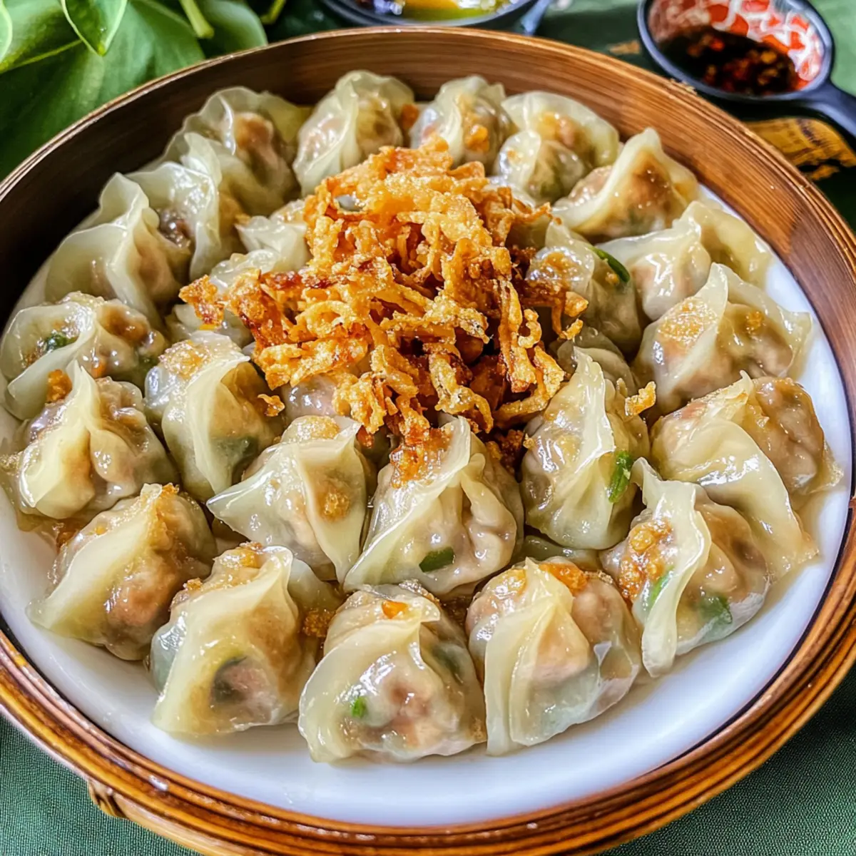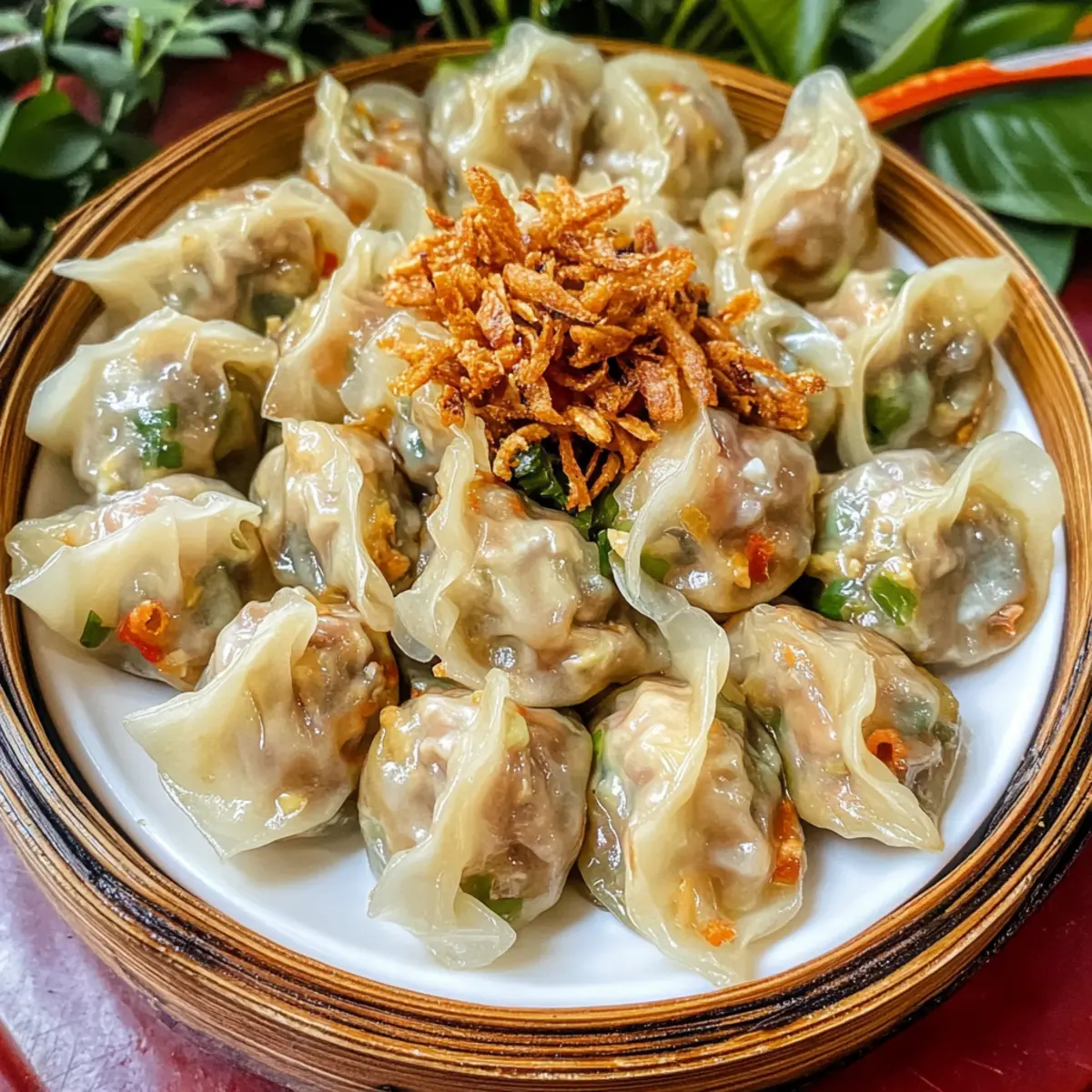 As I stood in the kitchen, the tantalizing aroma of garlic and spices brought back memories of bustling Thai markets, where passion and tradition mingle with every bite. Today, I’m excited to share my journey into making Authentic Kanom Jeeb, those delightful Thai dumplings that are not only perfect as appetizers but also incredibly versatile in their fillings, whether you crave savory pork, succulent shrimp, or a vibrant vegetarian option. With a quick prep time and the ability to freeze leftovers, these dumplings invite you to gather around the table for a culinary adventure. Are you ready to explore the art of wrapping and steaming, and perhaps discover a new family favorite? Why Are Thai Dumplings So Irresistible? Versatile Fillings: You can easily adapt these dumplings to suit any palate, whether you prefer them stuffed with juicy pork, tender shrimp, or a fresh vegetarian mix. Easy to Make: Despite their gourmet appeal, the steps to prepare and steam Kanom Jeeb are simple enough for any home cook to master! Perfect for Sharing: Serve them hot at your next gathering, and watch as friends and family dive into these delightful treats, pairing them with a variety of dipping sauces for added flavor. Healthier Alternative: With around 37 calories each, these light bites balance indulgence and health — they’re a guilt-free pleasure perfect for any occasion! Cultural Experience: Each bite is a taste of Thailand, bringing the rich culinary heritage right to your table. Get ready to impress your guests with an authentic taste of Thai culture in every dumpling! Thai Dumplings Ingredients For the Filling • Ground Pork – The main protein that gives authentic flavor; feel free to substitute with ground shrimp for a seafood twist. • Egg – Binds the filling together, adding richness and texture. • Coriander Roots – Infuses a unique aromatic essence; cilantro stems work if you can’t find them. • Black Peppercorns – Freshly ground provides a punch of spice; essential for depth of flavor. • Garlic – Freshly minced for that aromatic kick that every dumpling needs. • Carrots – Adds not just sweetness but also vibrant color; diced bell peppers can be a delightful alternative. • Green Onions – Brings freshness and a crunchy bite; substitute with shallots if preferred. • Dried Shiitake Mushrooms – Enhances umami; make sure to soak them before using. • Golden Mountain Sauce – A unique umami-rich seasoning that can be switched with soy sauce if necessary. • White Sugar – Balances the savory flavors; brown sugar can be used as a substitute. • Oyster Sauce – Depth of flavor central to the dish; for vegetarians, opt for mushroom sauce instead. • Cornstarch – Helps bind everything; tapioca starch is a good alternative. For the Wrapping • Dumpling Wrappers – Essential for shaping; wonton or gyoza wrappers are the best bet found in Asian markets. • Sesame Oil – Adds a nutty richness; vegetable oil can work in a pinch. • Garlic Oil – Brush on the wrappers for an extra layer of flavor before steaming. • Crispy Fried Garlic – Optional, but this garnish adds delightful crunch and a burst of flavor! Embrace your culinary adventure with these wonderful Thai dumplings, and let the savory experiences unfold around your family table! Step‑by‑Step Instructions for Authentic Kanom Jeeb: Thai Steamed Dumplings Step 1: Prepare the Spice Paste Begin by pounding the coriander roots, black peppercorns, and minced garlic into a fine paste using a mortar and pestle. This should take about 3-5 minutes to achieve a smooth consistency. The aromatic blend sets the foundation for the filling’s flavor, making your Thai dumplings truly authentic. Step 2: Mix Filling Ingredients In a mixing bowl, combine the golden mountain sauce, white sugar, sesame oil, oyster sauce, ground pork, egg, and cornstarch. Use a food processor to blend the mixture until smooth for about 1-2 minutes. This step ensures that all flavors meld beautifully, creating a rich filling that encapsulates the essence of Kanom Jeeb. Step 3: Combine Filling Mixture Transfer the blended filling mixture to a large bowl. Gently fold in the crushed spice paste along with finely diced carrots, green onions, and rehydrated shiitake mushrooms. This should take about 2-3 minutes to evenly distribute the ingredients, resulting in a colorful and flavorful filling for your Thai dumplings. Step 4: Shape Dumplings Place a wonton wrapper in the palm of your hand or a small spoon. Scoop a tablespoon of the filling into the center, then moisten the edges of the wrapper with a little water. Carefully fold and pinch to seal, ensuring no air pockets remain and the filling is secure. Continue this process for all wrappers, setting the formed dumplings aside. Step 5: Steam Dumplings Prepare a steamer by lining it with parchment paper to prevent sticking. Arrange the shaped dumplings in the steamer, ensuring they don’t touch. Cover and steam over medium heat for about 10 minutes. The dumplings are ready when the wrappers turn translucent and slightly glossy, indicating perfect cooking and a delightful treat awaits! Expert Tips for Thai Dumplings Steamer Tips: Ensure you line the steamer well to prevent the dumplings from sticking. Using parchment paper is a game-changer! Mixing Filling: Don’t overmix your filling—blend just until combined. Overmixing can make the texture dense and heavy. Filling Amounts: Be conservative with filling—about a tablespoon is perfect. Overfilling can lead to ruptured dumplings during cooking. Dumpling Sealing: Moisten the edges thoroughly before sealing. This step is crucial for keeping your Thai dumplings intact during steaming. Steaming Time: Keep an eye on steaming time; 10 minutes is usually perfect. Overcooking can make the wrappers tough instead of tender! Flavor Experimentation: Feel free to get creative with fillings! Explore different vegetables or proteins to customize you
