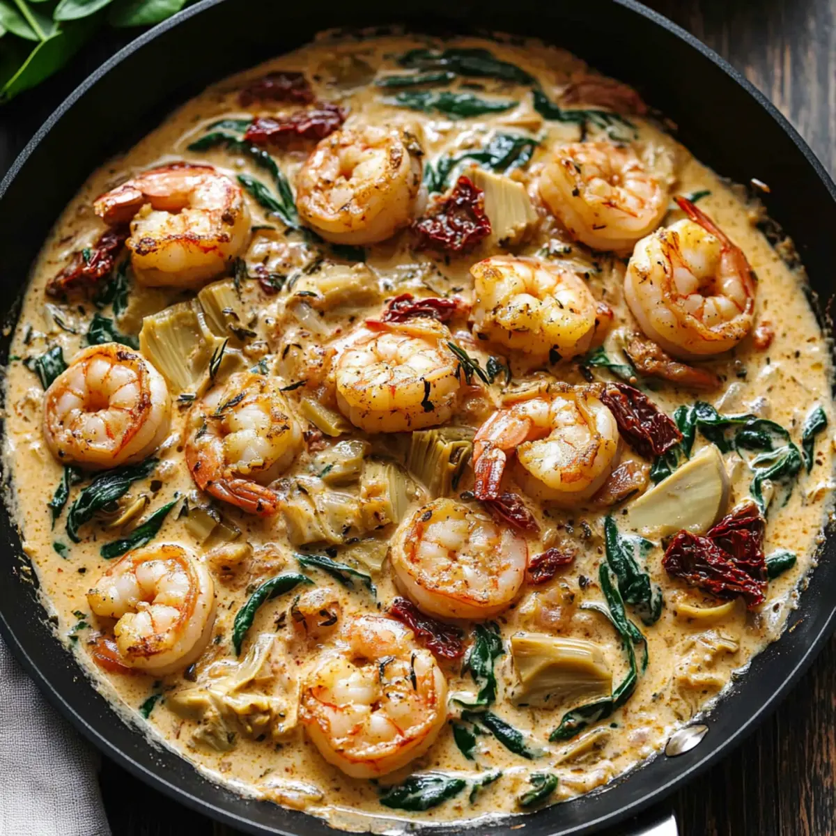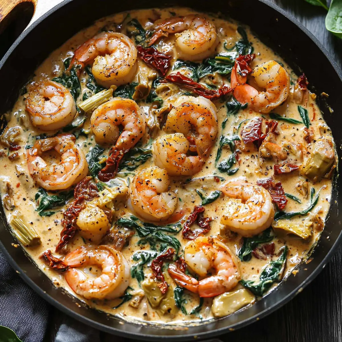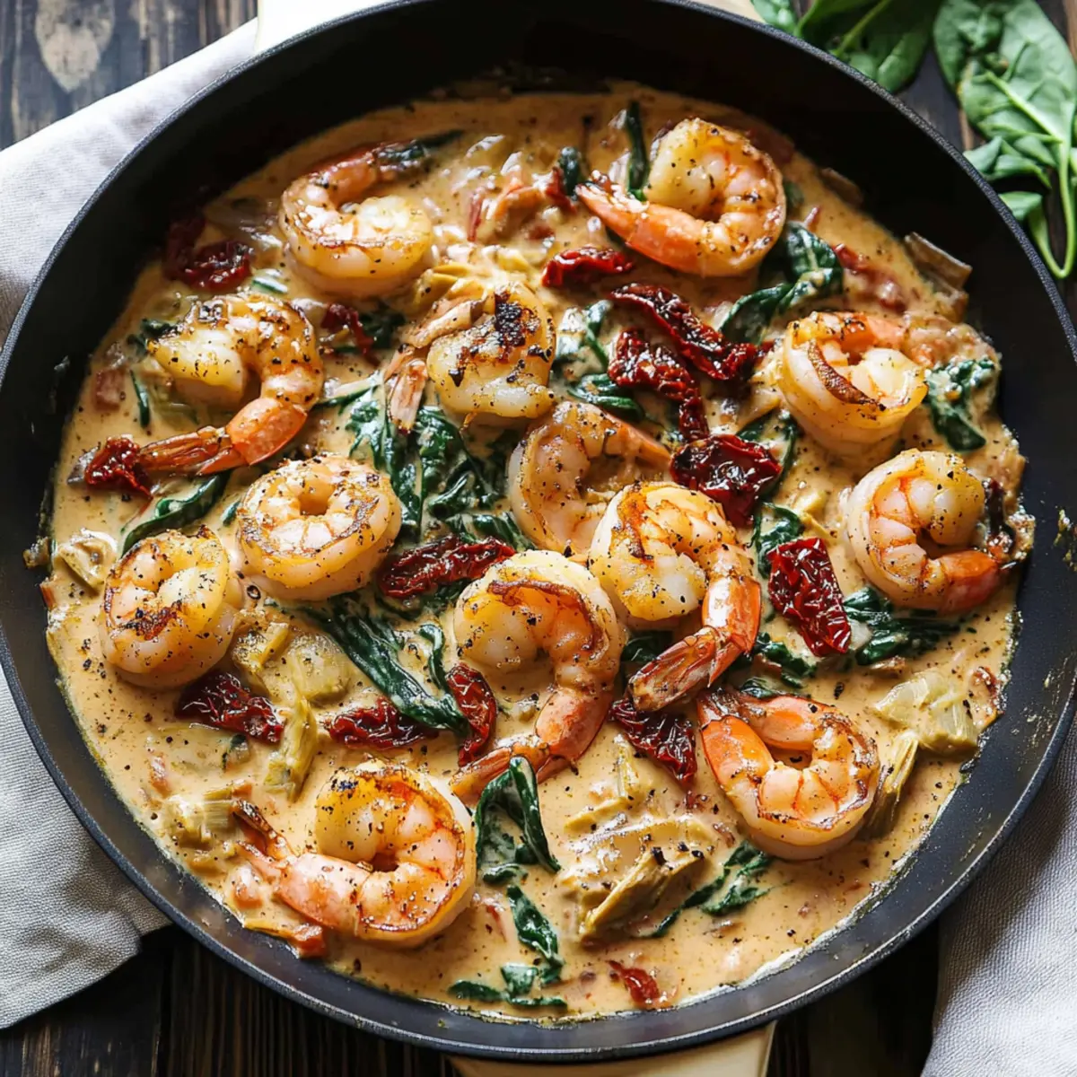As I stood at the stove, the tantalizing aroma of sizzling garlic and smoky paprika filled the air and whisked me away to a quaint trattoria in Tuscany. This Creamy Tuscan Shrimp recipe transforms everyday ingredients into a fabulous one-pan feast that’s ready in just 30 minutes! With succulent shrimp swimming in a velvety sauce enriched with vibrant spinach and zesty sun-dried tomatoes, you can enjoy a taste of Italy right at home. Not only does this dish cater to low-carb enthusiasts with its high protein content, but it also offers a quick prep time that makes it a perfect weeknight option. Plus, if you’re avoiding dairy, it’s easily adaptable for a creamy, yet dairy-free delight. What will you pair with this Tuscan creation—a glass of wine or crusty bread to soak up every last bite? Why is this Tuscan Shrimp special? Simplicity at its finest: This one-pan recipe is ready in just 30 minutes, making weeknight dinners a breeze. Flavorful sensation: The harmonious blend of smoky paprika, creamy sauce, and zesty sun-dried tomatoes makes every bite a delight for your taste buds. Healthy comfort: Loaded with high protein and low-carb goodness, it’s perfect for those sticking to a health-conscious diet. Versatile options: Easily adjust the recipe to be dairy-free without sacrificing creaminess—great for various dietary needs! Crowd-pleaser: Impress your family or guests with a dish that brings the taste of Italy to your table, just like my other favorites such as Cajun Shrimp Boil and Garlic Shrimp Pasta. Dive into this culinary adventure and elevate your dinner experience! Tuscan Shrimp Ingredients • Discover the essential flavors for this creamy delight! For the Shrimp Shrimp – 1 lb large, peeled, deveined shrimp; the star of the dish providing a protein boost. Salt – ¼ tsp; essential for flavor enhancement. Black Pepper – ¼ tsp coarse; adds a mild heat to the dish. Smoked Paprika – 1 tsp; delivers a smoky, rich layer of flavor. For the Sauce Olive Oil – 2 tbsp; perfect for sautéing the shrimp and garlic for a rich taste. Garlic – 5 cloves minced; enhances aroma and depth—feel free to substitute with garlic powder if in a pinch. Sun-Dried Tomatoes – 4 oz chopped (about ¼ cup); introduces sweetness and umami. Artichoke Hearts – 14 oz drained and chopped (1 can or about 1 cup); adds a tangy note to the mix. Fresh Spinach – 4 oz; infuses color and nutrition, but kale or Swiss chard work too! Heavy Cream – 1 cup; creates that velvety richness; coconut or almond milk can swap this for a dairy-free version. For Final Touches Extra Smoked Paprika – ¼ tsp; sprinkle this for an additional depth of flavor. Italian Seasoning – ½ tsp; enhances the herbal notes, creating a well-rounded taste. With these ingredients, you’re all set to whip up my incredibly satisfying Creamy Tuscan Shrimp—a delightful, easy-to-make meal that brings the flavors of Italy to your home! Enjoy every savory bite! Step‑by‑Step Instructions for Creamy Tuscan Shrimp – A Quick 30-Minute One-Pan Dinner Step 1: Prepare the Shrimp Begin by seasoning 1 pound of large, peeled, debeined shrimp with 1 teaspoon smoked paprika, ½ teaspoon Italian seasoning, ¼ teaspoon salt, and ¼ teaspoon black pepper. In a large skillet, heat 2 tablespoons of olive oil over medium-high heat. Sauté the shrimp for about 2 minutes on each side until they turn pink and opaque. Remove the shrimp from the skillet and set them aside. Step 2: Sauté Aromatics In the same skillet, add the minced garlic and sauté for about 30 seconds until fragrant. Next, toss in 4 ounces of chopped sun-dried tomatoes and 14 ounces of drained and chopped artichoke hearts. Cook these together for around 1 minute, stirring periodically, allowing the flavors to meld beautifully in the residual oil. Step 3: Make the Tuscan Sauce Now, add 4 ounces of fresh spinach to the skillet and stir until it wilts, which should take about 1-2 minutes. Then, pour in 1 cup of heavy cream along with another ¼ teaspoon of smoked paprika. Bring the mixture to a gentle simmer, letting it bubble for 1 minute. Give it a taste and adjust the salt if necessary for the perfect creamy sauce. Step 4: Finish the Dish Return the cooked shrimp to the skillet, ensuring they are nestled within the creamy sauce. Simmer everything together for an additional 2 minutes, allowing the shrimp to heat through and meld with the flavors. Stir gently, making sure the shrimp are well coated with the delightful Tuscan sauce before serving. How to Store and Freeze Tuscan Shrimp Fridge: Enjoy your creamy Tuscan Shrimp fresh for up to 3 days if stored in an airtight container. Reheat gently on the stovetop over low heat to maintain creaminess. Freezer: This dish is best enjoyed fresh, but if needed, you can freeze leftovers for up to 2 months. Store in a freezer-safe container, but the sauce may separate upon thawing. Reheating: When ready to enjoy, thaw in the fridge overnight, then reheat on low heat in a skillet, stirring gently until warmed through. Avoid boiling to keep the cream sauce smooth. Best Practices: For optimal taste and texture, try to eat your Tuscan Shrimp shortly after preparation, as creamy sauces do not freeze well. What to Serve with Creamy Tuscan Shrimp? Imagine a warm, inviting dinner table filled with beautiful sides that complement the rich, creamy flavors of your dish, enhancing every bite. Garlic Bread: Nothing beats the classic! This warm, crusty bread is perfect for soaking up the luscious sauce and makes every mouthful irresistible. Zesty Cauliflower Rice: Light and fluffy, this low-carb option serves as a neutral base to soak up all that creamy goodness while adding a bit of crunch. Mixed Green Salad: A refreshing mix of peppery arugula, crisp cucumbers, and cherry tomatoes drizzled with balsamic vinaigrette balances the richness of the shrimp, bringing a delightful contrast. Roasted Asparagus: Tender and vibrant, these spears have a sligh