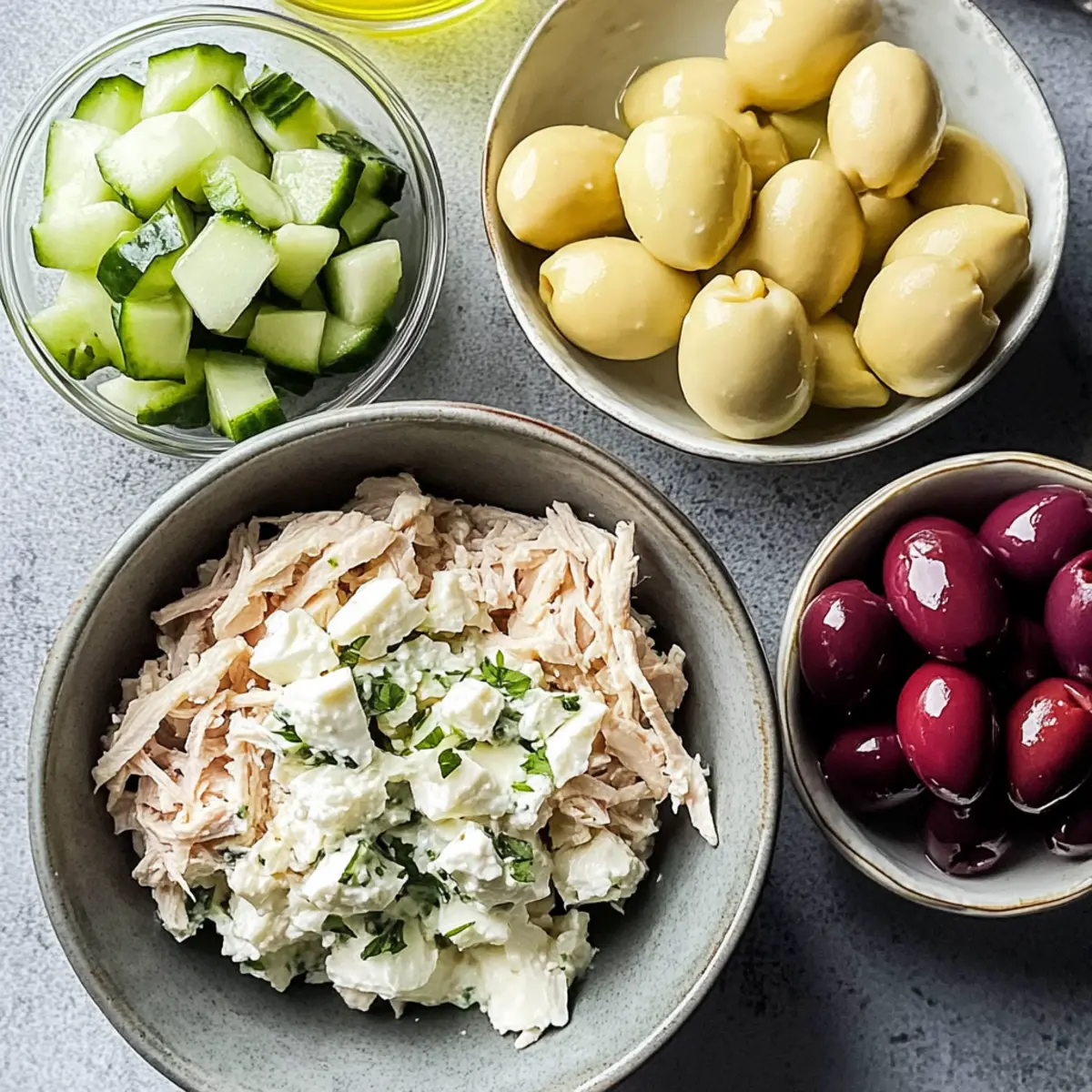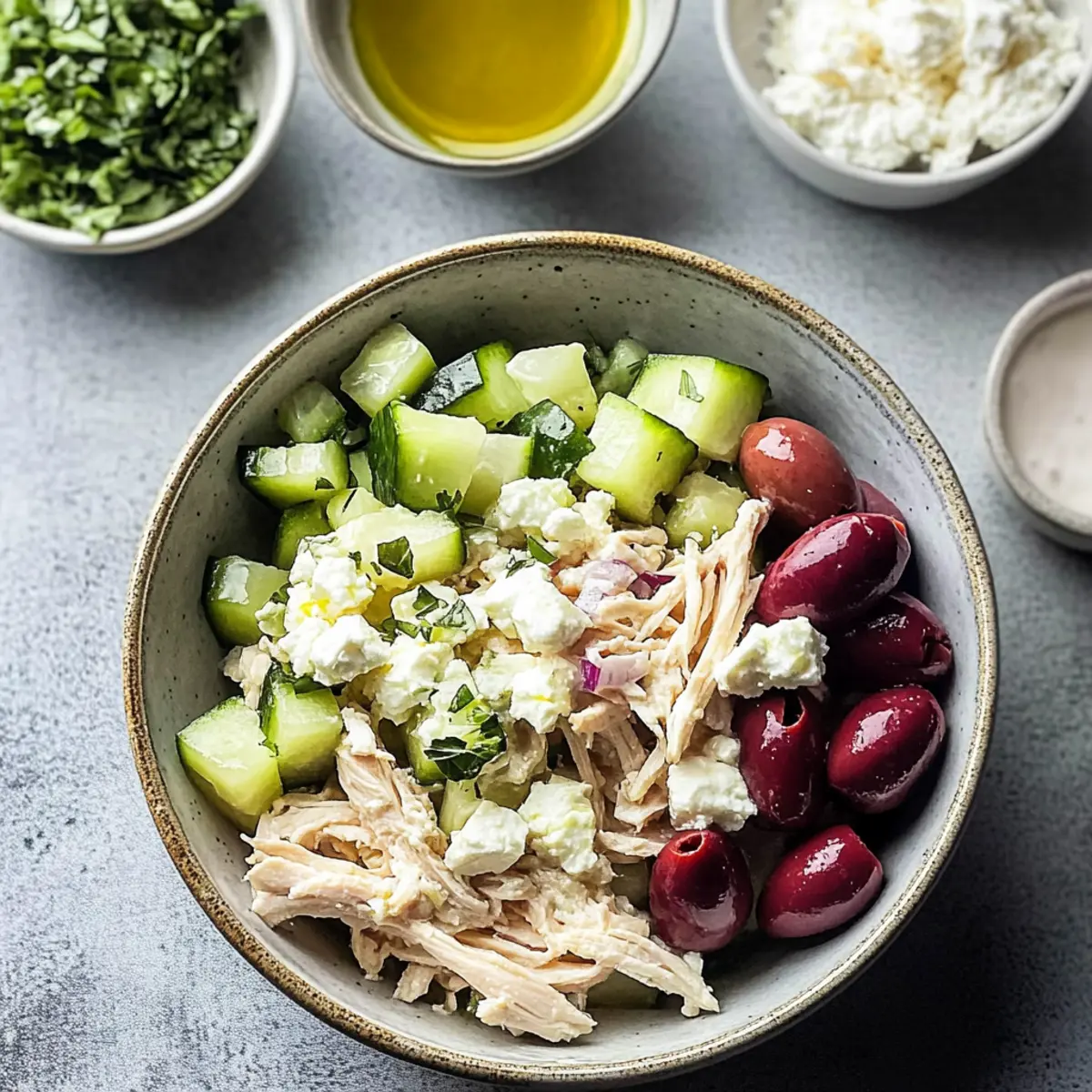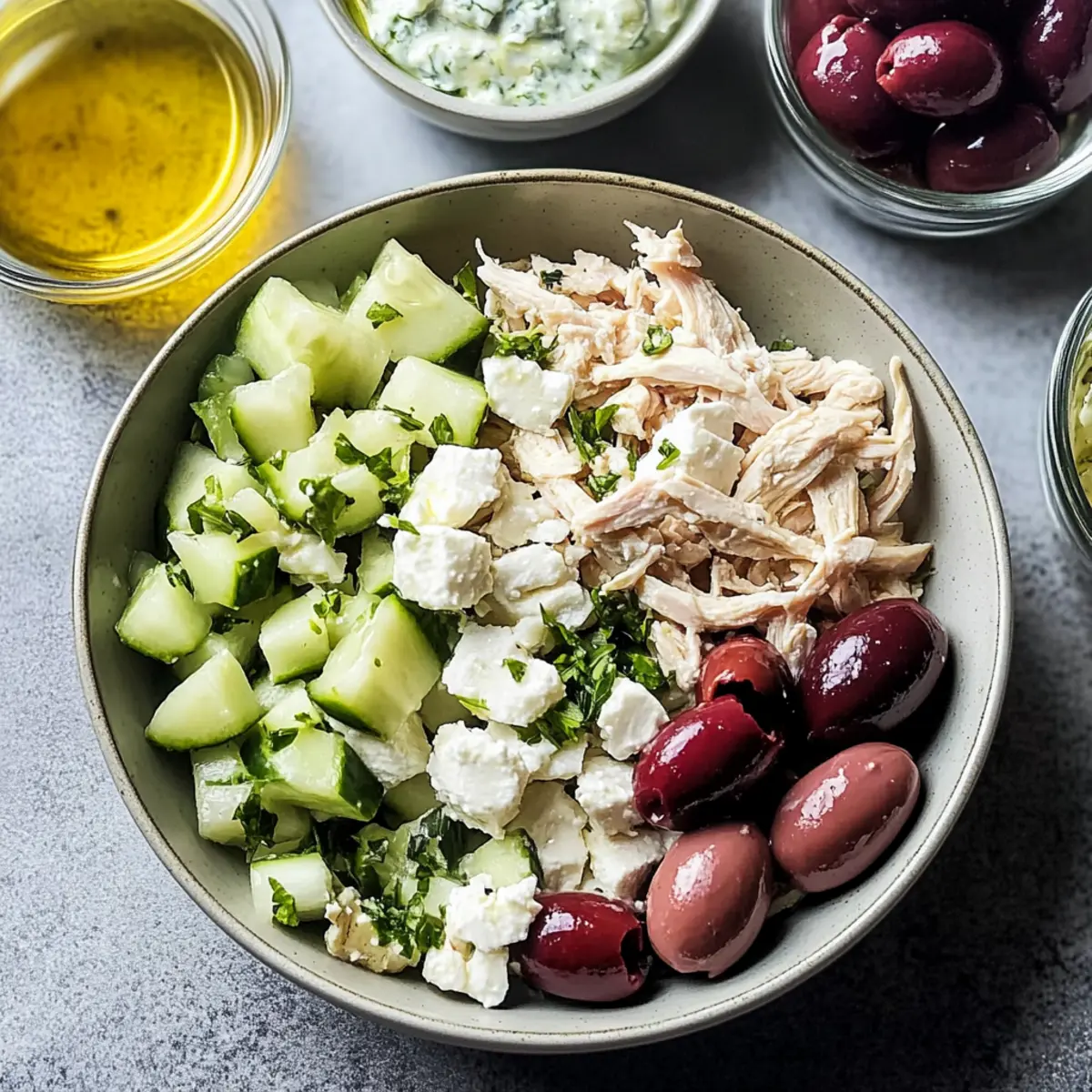 As I sat in my kitchen surrounded by bursting summer flavors, the idea of a Tzatziki Chicken Salad came to life. This Greek-inspired dish brings together tender shredded chicken, creamy feta, and zesty tzatziki sauce, offering a refreshing twist that’s perfect for those hot afternoons. What’s even better? It’s not just quick to whip up, but also a fantastic make-ahead option that allows the vibrant flavors to deepen as it chills. Packed with crunchy cucumbers, tangy olives, and herby dill, this salad effortlessly balances health and taste, making it an ideal choice for lunch or dinner. Plus, it’s gluten-free, so everyone can enjoy it! Ready to make your taste buds dance? Let’s get started on this delicious escapade! Why is Tzatziki Chicken Salad a must-try? Refreshing, this Tzatziki Chicken Salad bursts with summer flavors, making it a delightful choice for any meal. Healthy and light, it’s packed with protein from chicken and rich in nutrients from cucumbers and herbs. Make-ahead friendly, this salad allows you to prep in advance and enjoy the flavors as they meld together. Versatile in serving, enjoy it in pita pockets or atop greens, ideal for picnics or potlucks. Flavorful and fun, this dish is sure to impress family and friends, reminiscent of your favorite Mediterranean delights! Looking for other quick meals? Try my Mango Chicken Stir for a tasty twist! Tzatziki Chicken Salad Ingredients For the Tzatziki Dressing • Greek Yogurt – This creamy base is essential for a flavorful tzatziki sauce; use unsweetened dairy-free yogurt for a vegan option. • Shredded Cucumber – Adds a refreshing crunch; be sure to squeeze out excess water to keep the salad creamy. • Lemon Juice – Infuses brightness; feel free to adjust for your preferred level of tang. • Dill – Provides a delightful herby flavor; fresh dill is recommended, but dried dill works too. • Garlic Powder – Adds depth; substitute with fresh minced garlic for a more robust kick. • Salt and Pepper – Key for seasoning; adjust according to your taste preferences. For the Salad Base • Shredded Chicken – Your main protein; rotisserie chicken saves time and packs in extra flavor. • Red Onion – Brings a sharp bite; can be swapped for green onions for a milder taste. • Kalamata Olives – Impart a tasty briny touch; green olives can be used instead if desired. • Feta Cheese – This tangy, creamy touch makes the salad shine; opt for vegan feta for a dairy-free alternative. • Fresh Parsley – Adds a burst of color and freshness, enhancing the overall presentation. Get ready to enjoy a vibrant Tzatziki Chicken Salad that’s not only refreshing but perfect for any warm day! Step‑by‑Step Instructions for Tzatziki Chicken Salad Step 1: Prepare the Tzatziki Dressing In a large mixing bowl, combine 1 cup of Greek yogurt, 1 cup of well-drained shredded cucumber, the juice of half a lemon, 2 tablespoons of fresh dill, 1 teaspoon of garlic powder, and a pinch of salt and pepper. Stir these ingredients together until smooth and creamy, ensuring the cucumber is evenly distributed for that classic tzatziki texture, which should be thick and luscious. Step 2: Add Chicken and Veggies Next, introduce 2 cups of shredded chicken to your tzatziki dressing, along with 1/4 cup of finely chopped red onion and 1/2 cup of pitted, chopped kalamata olives. Gently fold the mixture together until the chicken and veggies are completely coated in the creamy tzatziki, creating a harmonious blend of flavors and colors that will make your Tzatziki Chicken Salad even more enticing. Step 3: Incorporate Feta and Parsley Now, add in 1/2 cup of crumbled feta cheese and 1/4 cup of chopped fresh parsley to the salad. Carefully mix everything together to avoid breaking up the feta too much while ensuring that every bite has that delicious, tangy flavor. The feta adds a creamy component, while the parsley brings a pop of freshness, enhancing the overall vibrance of your Tzatziki Chicken Salad. Step 4: Taste and Adjust Seasoning Take a moment to taste your salad. If desired, squeeze in more lemon juice or sprinkle in a touch more salt and pepper to elevate the flavors to your liking. This tasting step allows you to customize your Tzatziki Chicken Salad, ensuring it is perfectly seasoned for your palate, highlighting the brightness of the lemon and the herby notes of dill. Step 5: Chill Before Serving For optimal flavor development, cover the bowl with plastic wrap and refrigerate your Tzatziki Chicken Salad for at least 30 minutes. Chilling allows the ingredients to meld together beautifully, intensifying the flavors and creating a refreshing dish that’s ideal for those warm days. The salad should be cool and creamy when you’re ready to enjoy it. Step 6: Garnish and Serve When ready to serve, remove the salad from the fridge. If desired, garnish with additional crumbled feta, a sprinkle of fresh dill, or a light drizzle of olive oil for an inviting presentation. Your Tzatziki Chicken Salad is now beautifully assembled and ready to be served in pita pockets, atop greens, or enjoyed on its own—perfect for any occasion! Make Ahead Options Preparing your Tzatziki Chicken Salad ahead of time is a fantastic way to save yourself precious moments during busy weeknights! You can prepare the tzatziki dressing (Greek yogurt, cucumber, lemon juice, dill, garlic powder, salt, and pepper) up to 24 hours in advance and store it in an airtight container in the refrigerator to keep it fresh. Additionally, you can shred the chicken and chop the veggies ahead of time—just make sure to store them separately. When it’s mealtime, simply combine the dressing with the chicken, olives, feta, and parsley, stir gently, and enjoy a delicious salad that tastes just as vibrant and fresh! Tzatziki Chicken Salad Variations Feel free to get creative and tailor this refreshing Tzatziki Chicken Salad to your taste and dietary needs! Vegetarian: Substitute