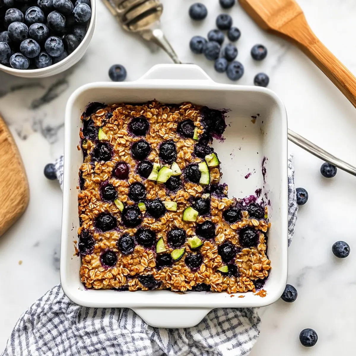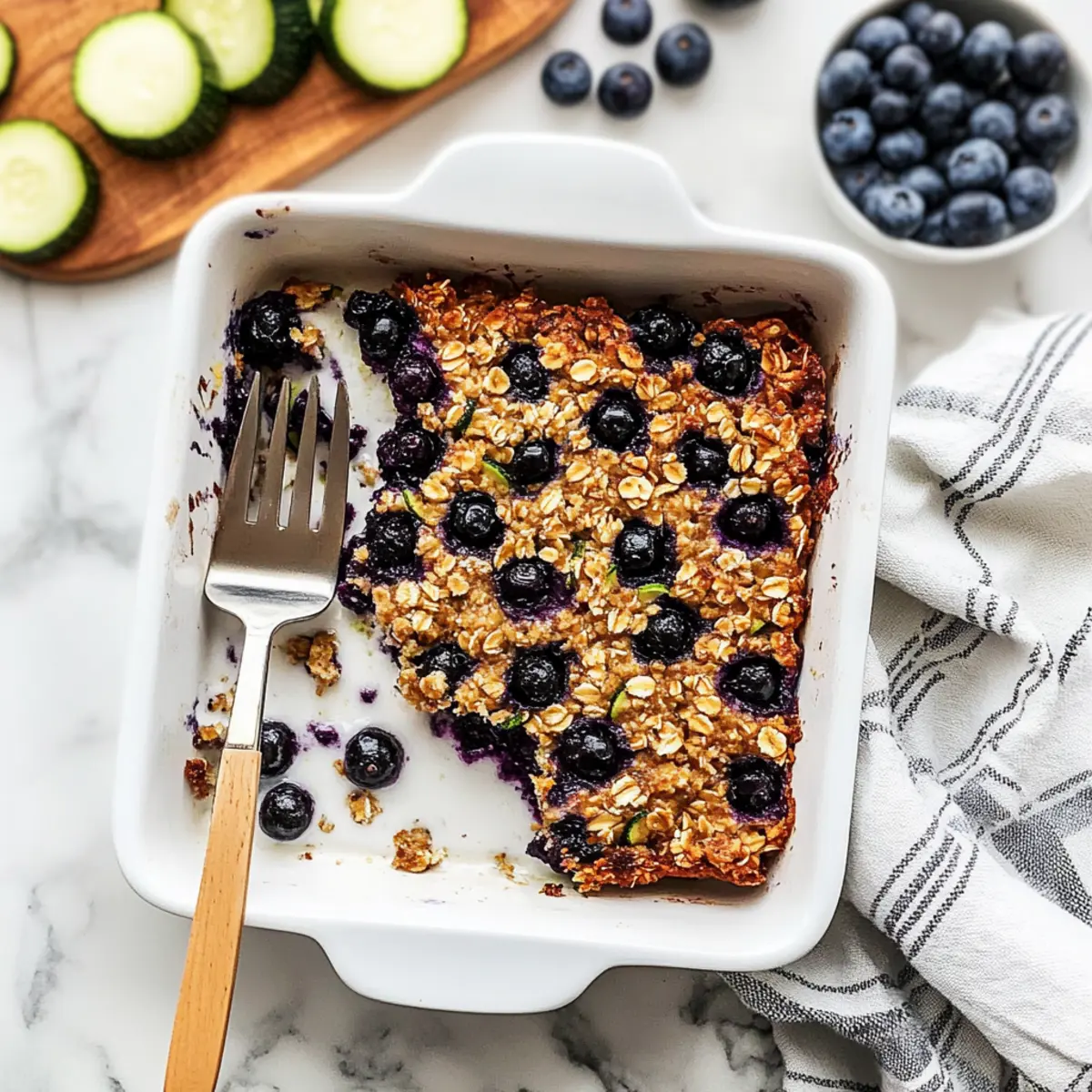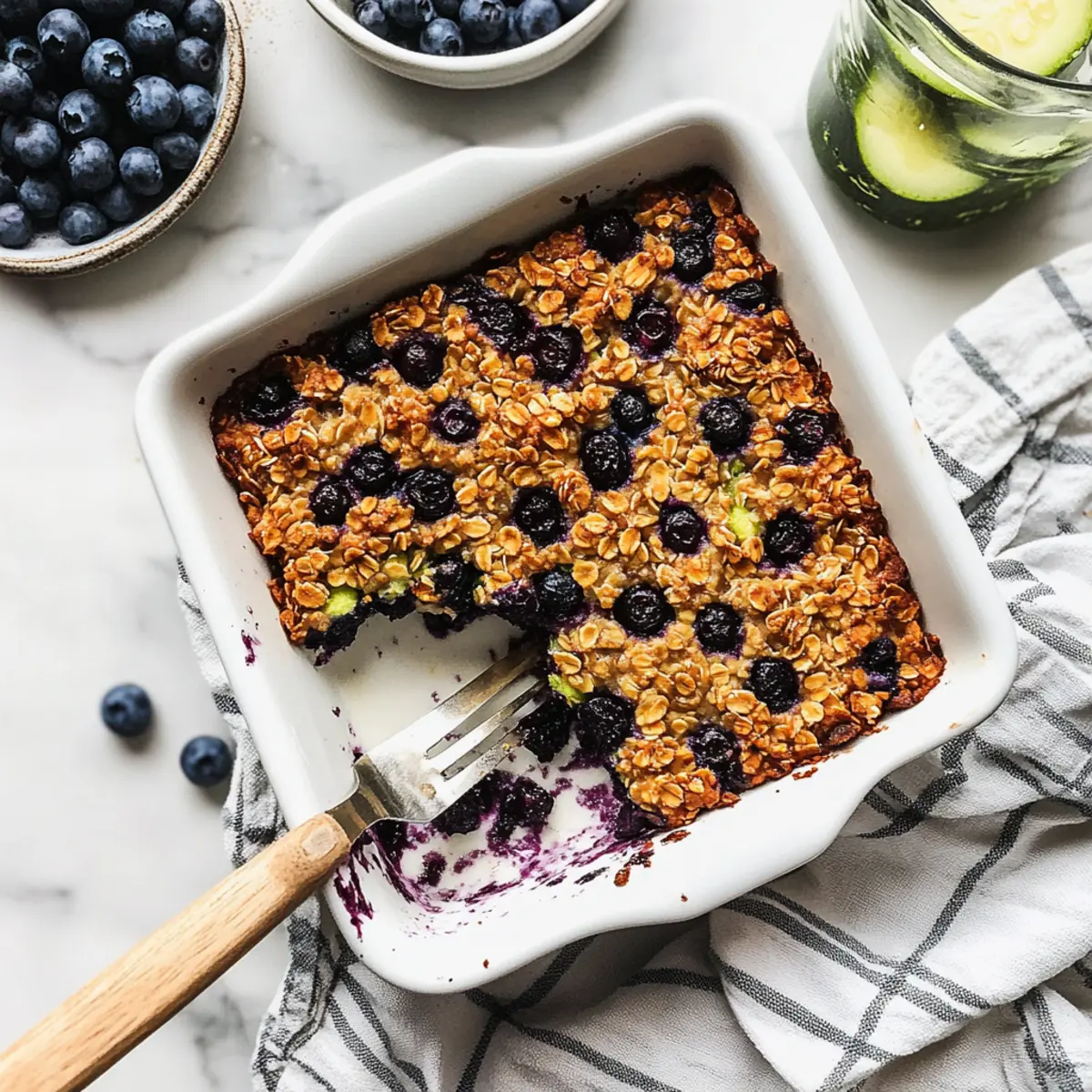 As the inviting aroma of warm spices drifts through my kitchen, I can’t help but feel that comforting sense of home. Today, I’m excited to share my Zucchini Blueberry Baked Oatmeal—a delightful twist on traditional breakfast that not only satisfies your cravings but also sneaks in some veggie goodness. This recipe is perfect for meal prep, as it bakes up beautifully in just 40 minutes and is incredibly freezer-friendly! With a lovely balance of natural sweetness from blueberries and the subtle moisture of zucchini, you’ll find that it transforms your mornings into something special. Are you ready to make breakfast the best part of your day? Why is Zucchini Blueberry Baked Oatmeal a Must-Try? Flavorful Twist: The delightful combination of sweet blueberries and moist zucchini creates a breakfast that feels indulgent yet wholesome. Meal Prep Friendly: Prepare it in advance, and enjoy warm servings throughout the week—perfect for busy mornings! Versatile Options: Customize to your liking by swapping in your favorite fruits or adding nuts for a satisfying crunch. Nutritional Powerhouse: Packed with fiber and nutrients, this recipe ensures you start your day on the right foot. It’s a truly wonderful way to sneak in veggies without sacrificing taste! Freezer Friendly: Store leftover portions in the freezer, making this dish as convenient as it is delicious. For more morning inspiration, check out my Homemade Blueberry Muffins or Baked Mac Cheese! Zucchini Blueberry Baked Oatmeal Ingredients For the Oatmeal Base • Rolled Oats – Provides texture and structure for the oatmeal base; substitute with gluten-free oats for a gluten-free version. • Ground Cinnamon – Adds warm, aromatic flavor that complements the sweetness. • Ground Nutmeg – Enhances the warming spice notes, making every bite cozy. • Baking Powder – Acts as a leavening agent to help the oatmeal rise and become fluffy. • Salt – Balances sweetness and enhances the flavors present in the dish. For the Mixture • Milk of Choice – Moistens the mixture; almond milk is a great dairy-free substitute. • Maple Syrup or Honey – Provides natural sweetness; use agave syrup for a vegan option. • Eggs – Binds the ingredients together; for a vegan alternative, use flax eggs (1 tablespoon ground flaxseed mixed with 2.5 tablespoons water = 1 egg). • Vanilla Extract – Adds depth of flavor that elevates the overall taste of the oatmeal. For the Star Ingredients • Blueberries – The highlight of the dish, adding freshness and sweetness; feel free to opt for frozen blueberries. • Grated Zucchini – Sneaks in added moisture and nutrients; avoid squeezing out liquid to keep it tender. For Extra Richness • Oil (divided) – Adds richness and moisture; melted coconut oil or vegetable oil works wonderfully. Step‑by‑Step Instructions for Zucchini Blueberry Baked Oatmeal Step 1: Preheat and Prepare Preheat your oven to 375°F (190°C) and lightly grease an 8×8 inch baking dish with ½ tablespoon of oil. This step ensures the Zucchini Blueberry Baked Oatmeal won’t stick to the pan, allowing for easy serving once it’s baked to perfection. Step 2: Mix Dry Ingredients In a medium bowl, combine rolled oats, ground cinnamon, nutmeg, baking powder, and salt. Mix these dry ingredients thoroughly until well combined, creating a fragrant base that will bring warmth and flavor to your hearty breakfast. Step 3: Combine Wet Ingredients Next, add eggs, your choice of milk, vanilla extract, remaining oil, and maple syrup (or honey) to the bowl with the dry mixture. Stir gently but confidently until everything is fully incorporated into a smooth batter, ensuring a perfect texture for your baked oatmeal. Step 4: Fold in Zucchini and Blueberries Gently fold in 1 cup of blueberries and the grated zucchini into the batter. Take care not to overmix; you want the blueberries to remain whole to burst with flavor while baking. This step is crucial for both moisture and flavor in your Zucchini Blueberry Baked Oatmeal. Step 5: Pour and Top Pour the combined mixture into the prepared baking dish, smoothing it evenly across the surface. Sprinkle the remaining ½ cup of blueberries on top, which will create a delightful, fruity topping that enhances the visual appeal and flavor of your baked oatmeal. Step 6: Bake to Perfection Place the baking dish in the preheated oven and bake for 40–45 minutes. You’ll know it’s ready when the top turns golden brown and the center is set but still tender. Set a timer and enjoy the delicious aroma wafting through your kitchen! Step 7: Cool and Serve Once baked, remove the Zucchini Blueberry Baked Oatmeal from the oven and let it cool slightly for about 10 minutes before serving. This waiting period helps set the texture and ensures each slice holds together beautifully. Enjoy it warm for the ultimate cozy breakfast experience! Storage Tips for Zucchini Blueberry Baked Oatmeal Room Temperature: Allow baked oatmeal to cool completely before storing at room temperature for up to 2 hours; cover loosely to prevent drying out. Fridge: Store leftover Zucchini Blueberry Baked Oatmeal in an airtight container in the refrigerator for up to 4 days for easy reheating throughout the week. Freezer: Wrap individual portions tightly in plastic wrap and place them in a freezer-safe bag or container. They can be frozen for up to 3 months. Reheating: To reheat from the fridge, place a portion in the microwave for about 30–60 seconds or until warmed through. From frozen, thaw overnight in the fridge and then reheat. Zucchini Blueberry Baked Oatmeal Variations Feel free to customize this delightful baked oatmeal to suit your taste and dietary needs! Fruit Swap: Replace blueberries with raspberries or chopped apples for a fruity twist that still brings sweetness and color. Nutty Additions: Stir in walnuts or almonds for a satisfying crunch and a delightful contrast to the soft texture of the oatmeal. Dairy-Fre